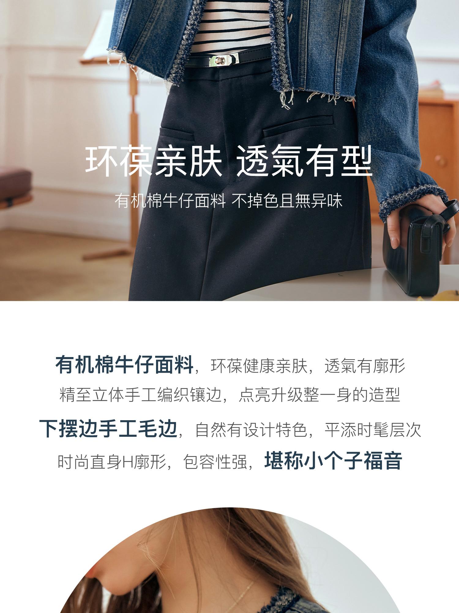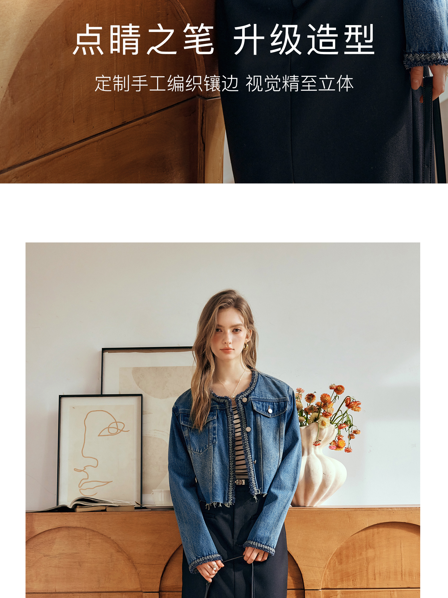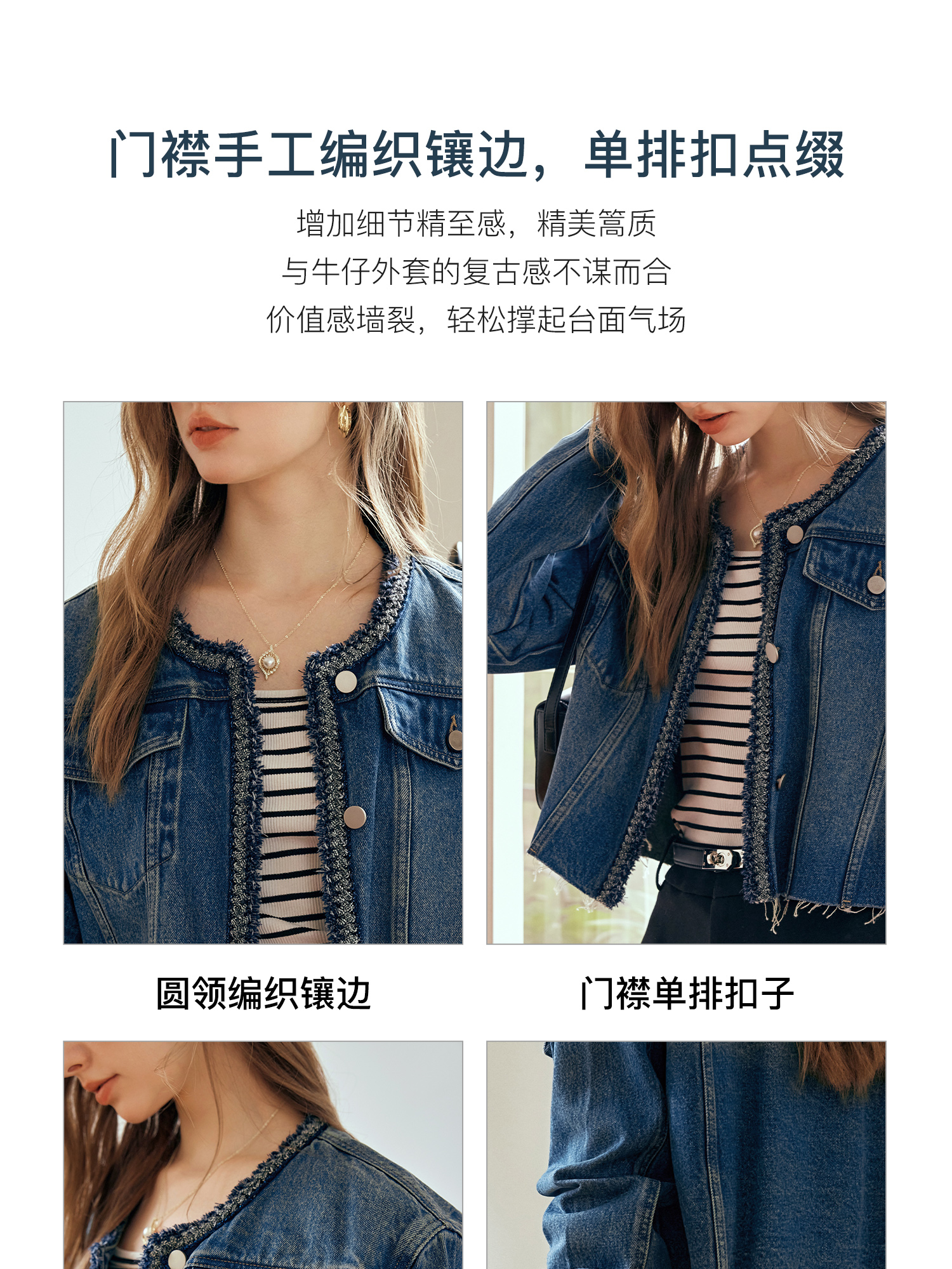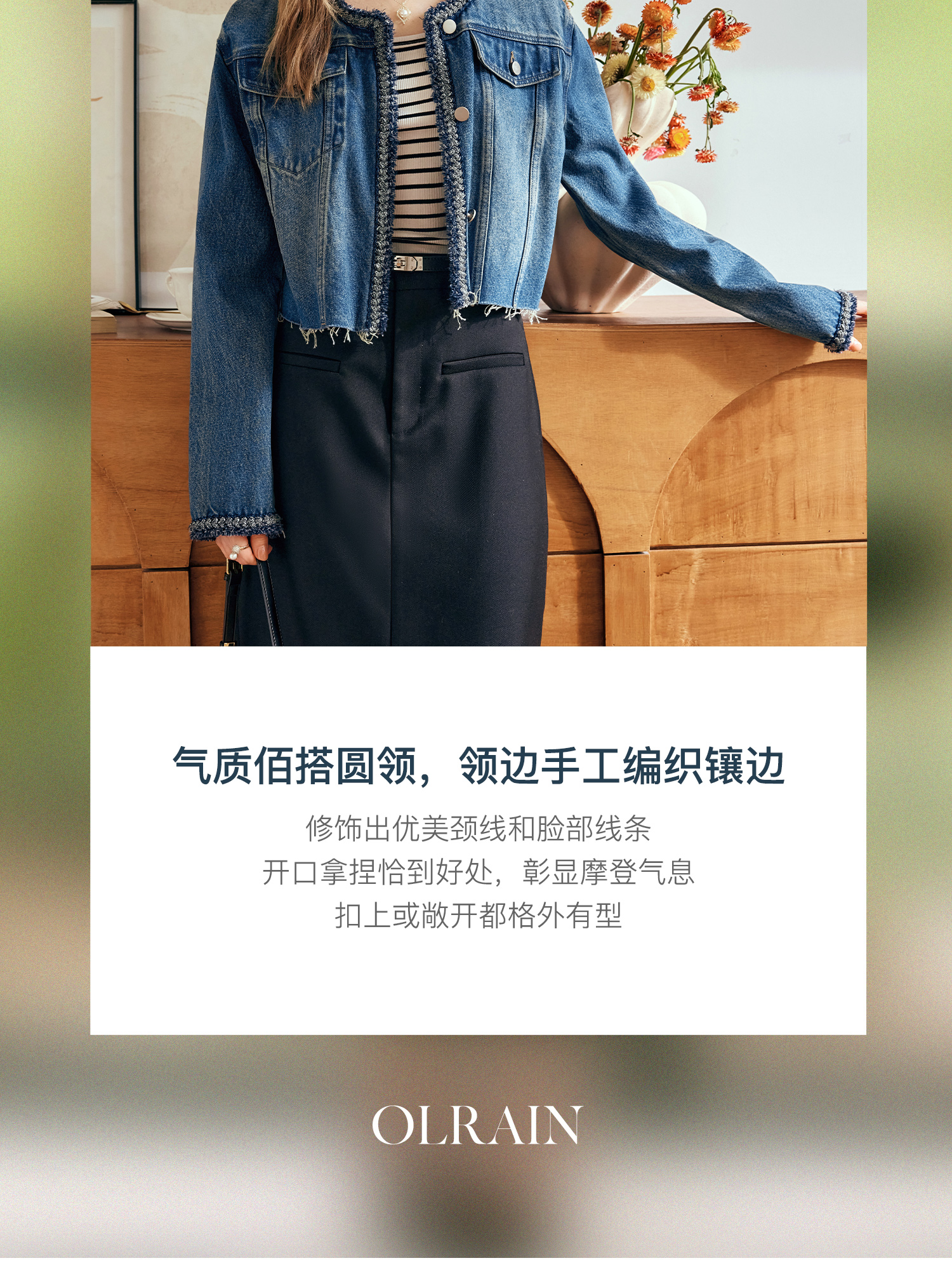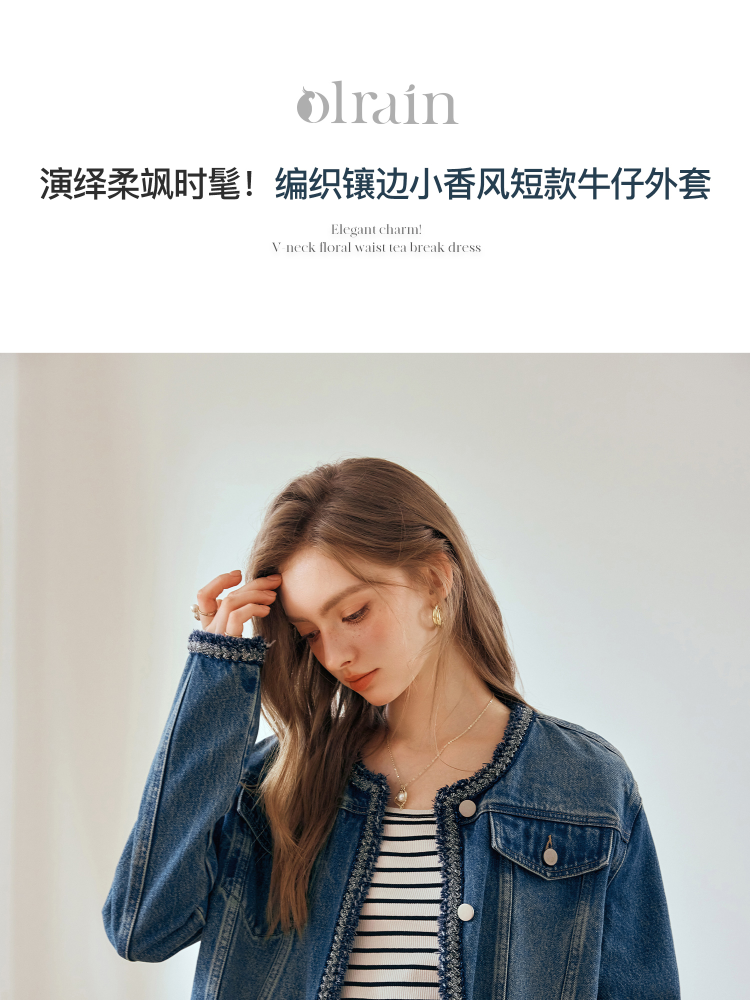 OLrain欧芮儿蓝色牛仔外套女早秋2024年新款手工编织小香风上衣