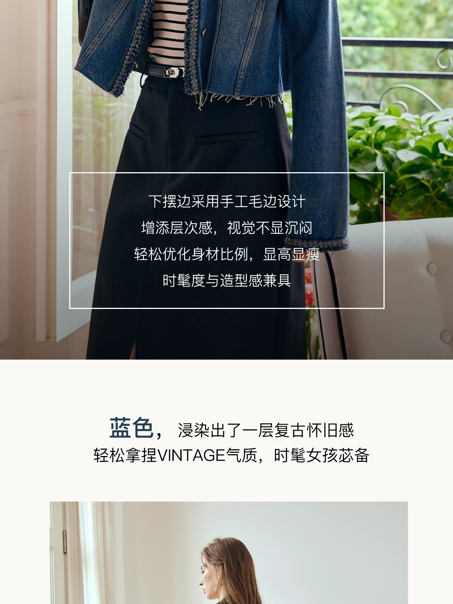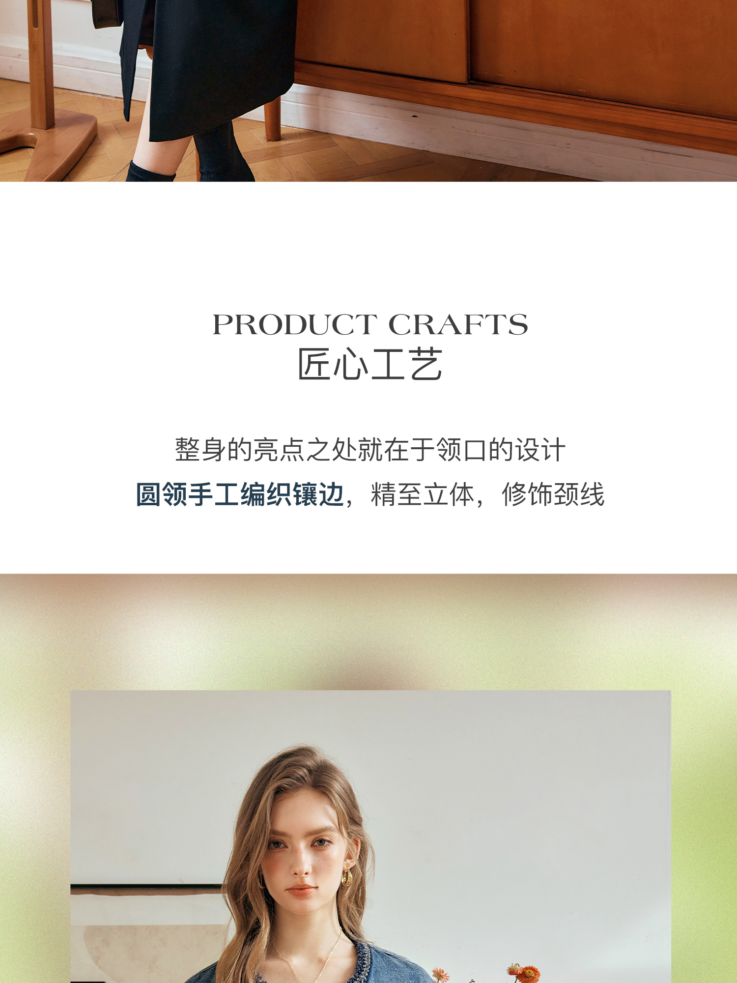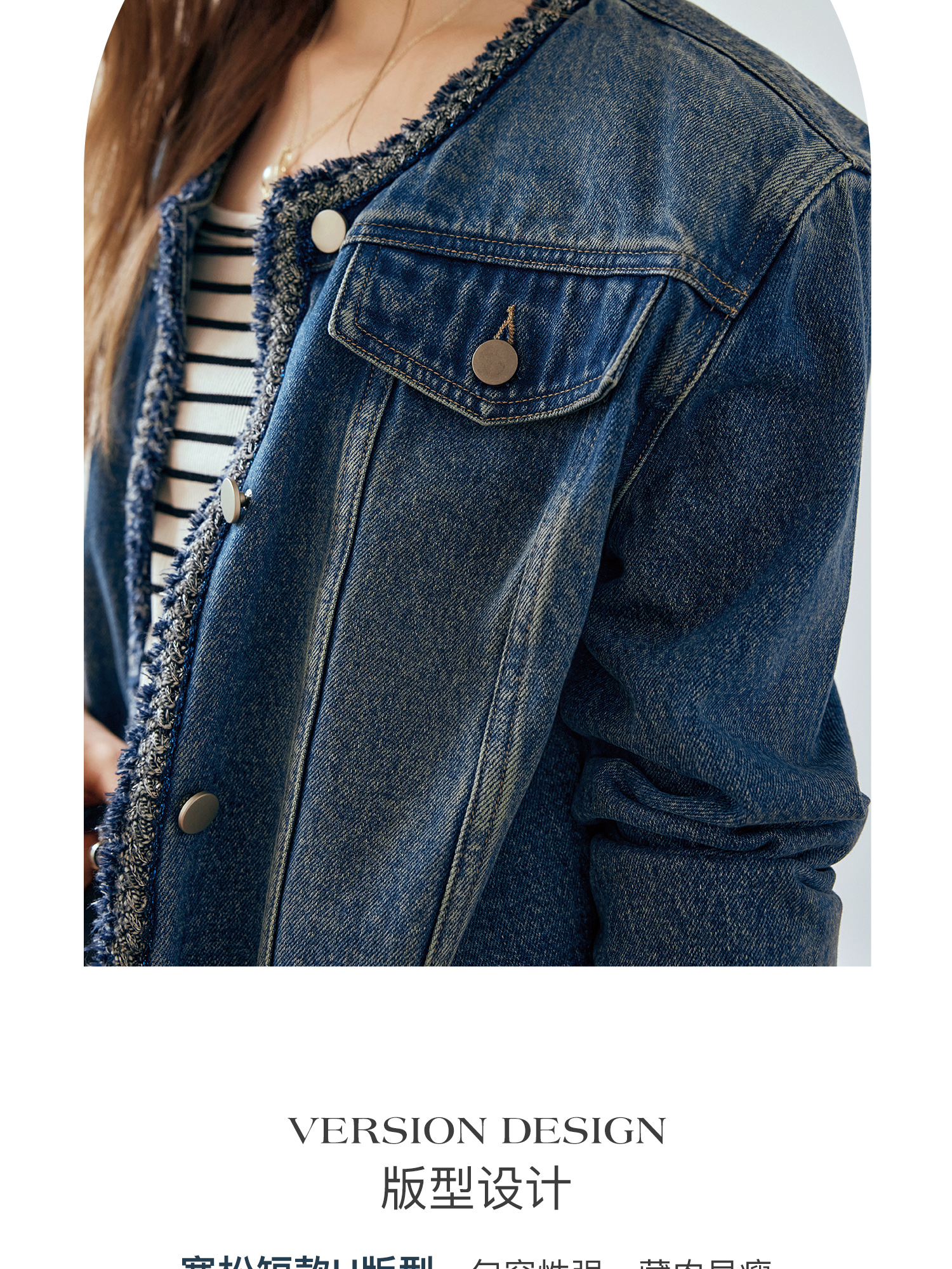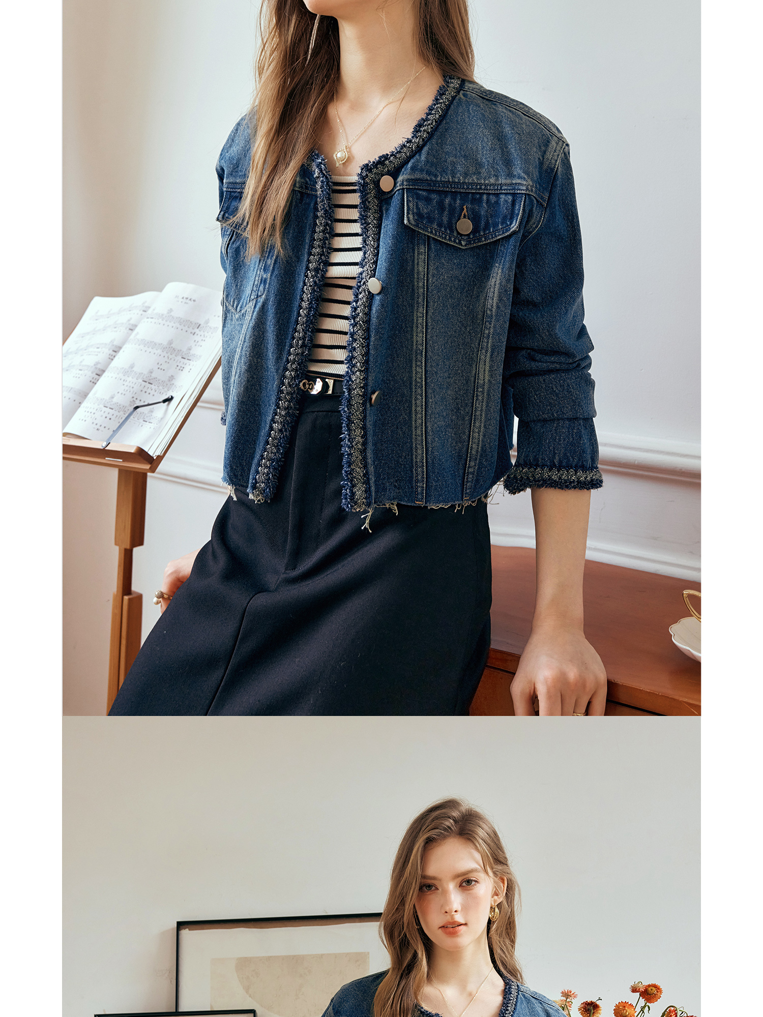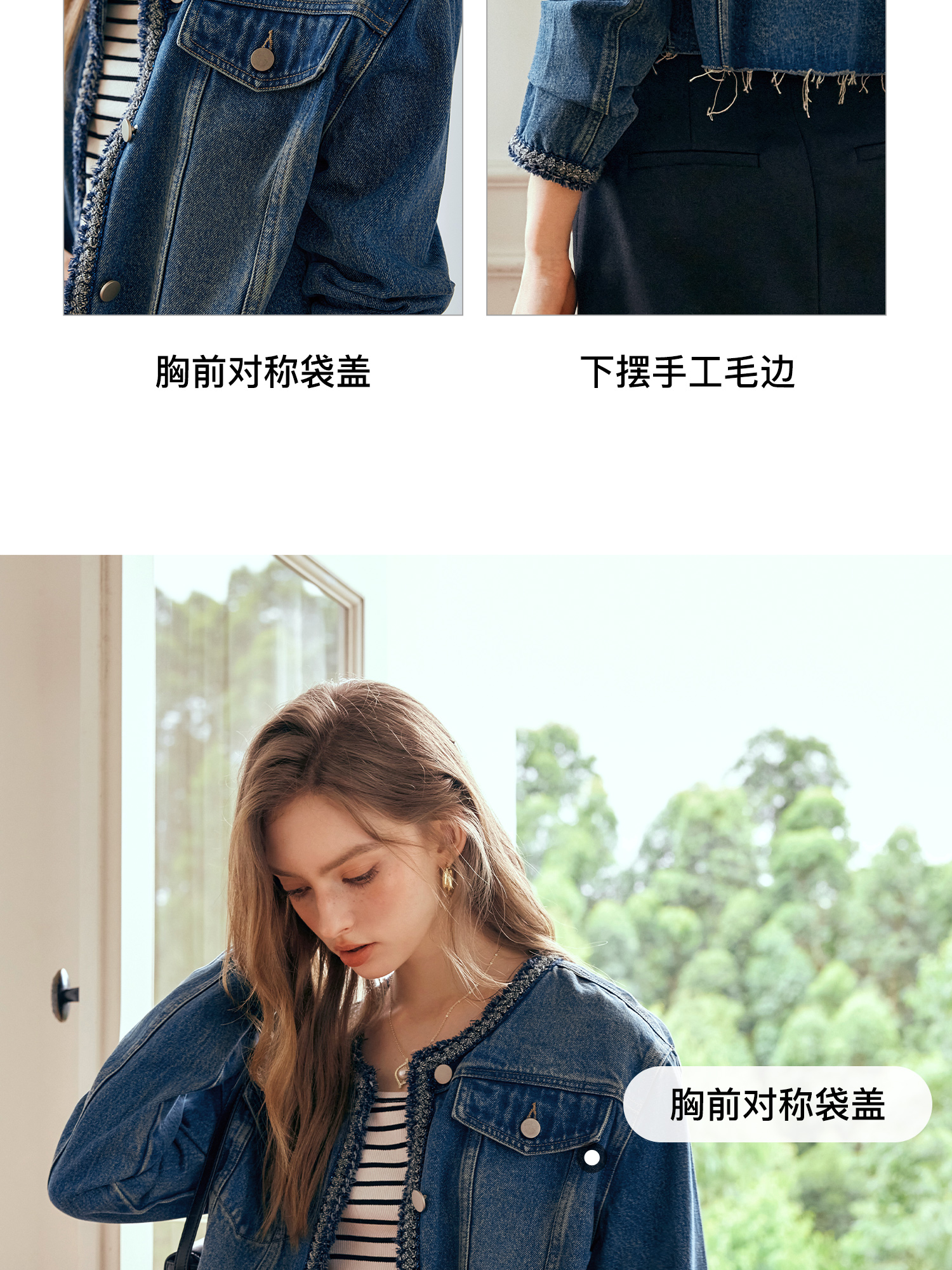 OLrain欧芮儿蓝色牛仔外套女早秋2024年新款手工编织小香风上衣