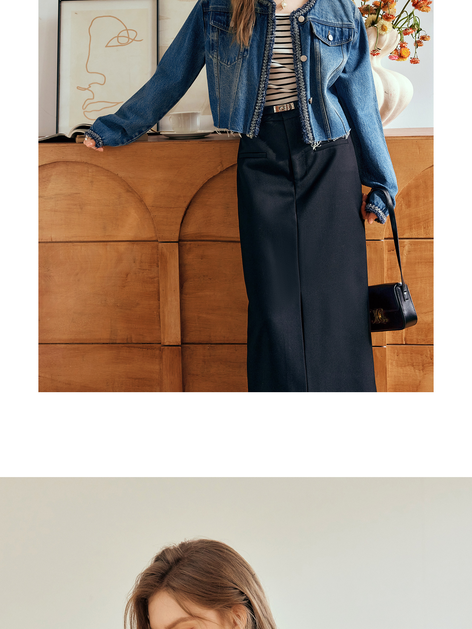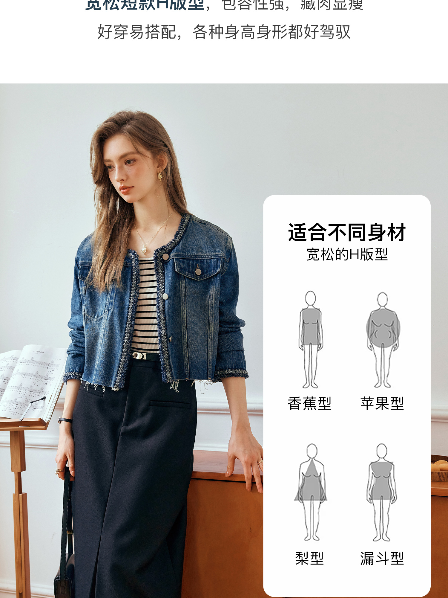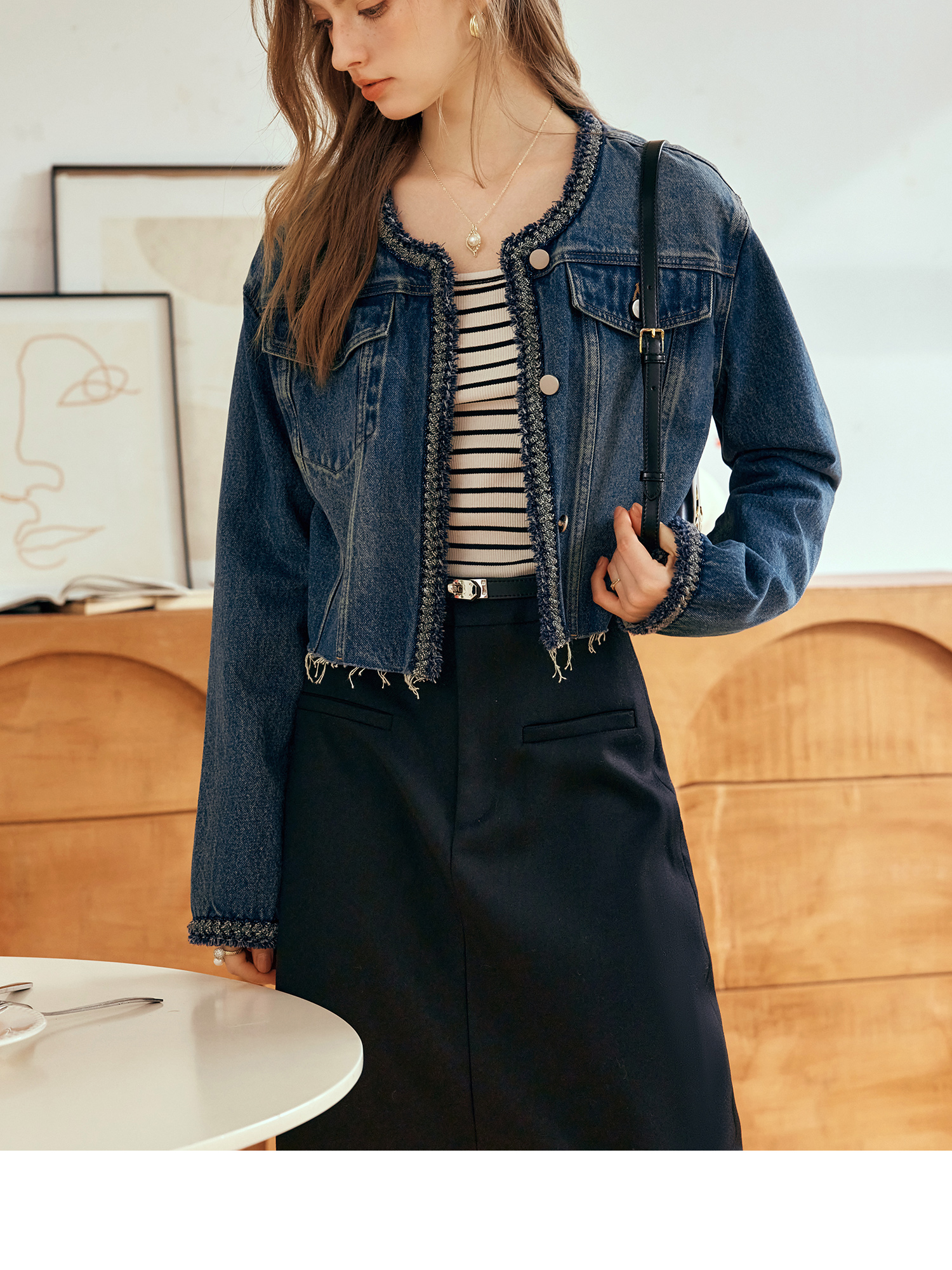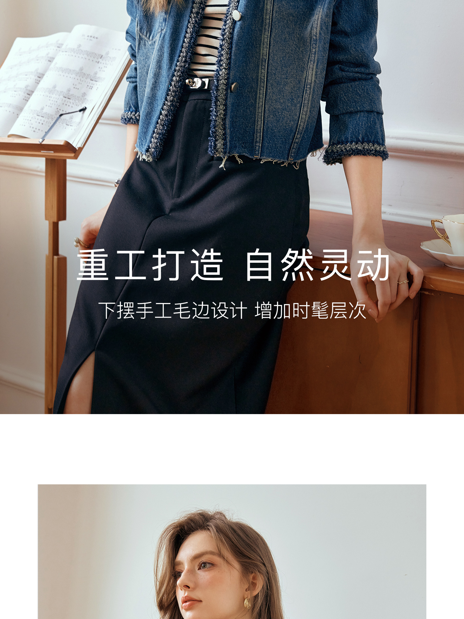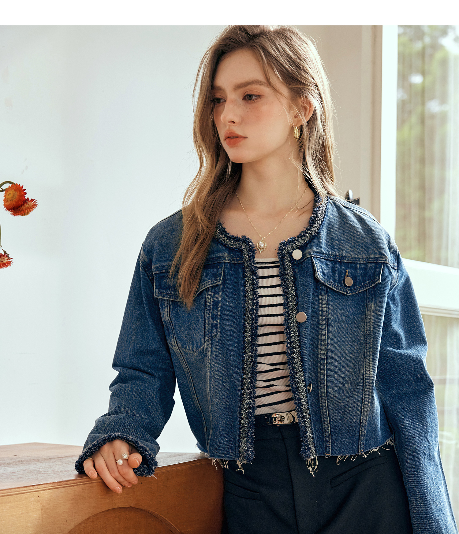 OLrain欧芮儿蓝色牛仔外套女早秋2024年新款手工编织小香风上衣