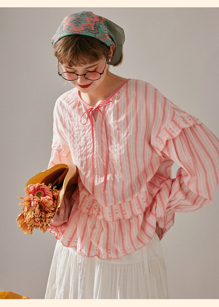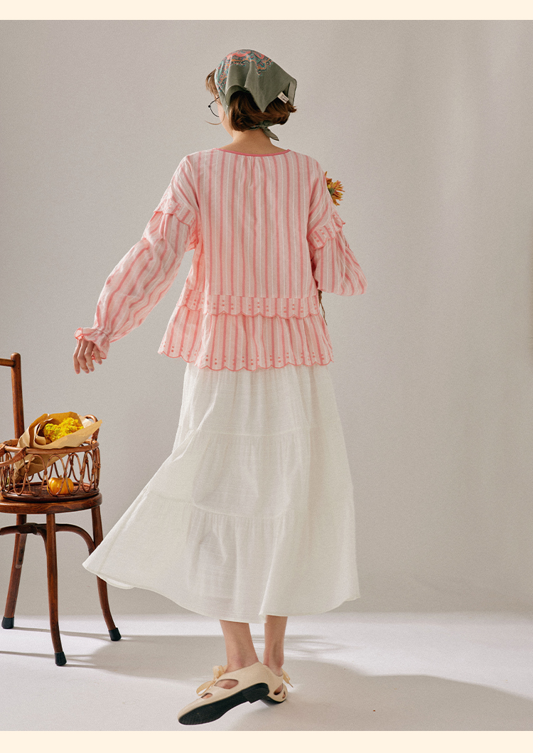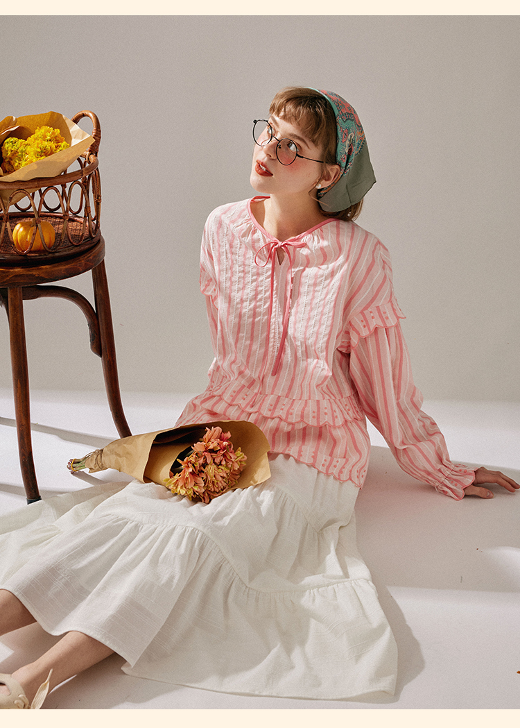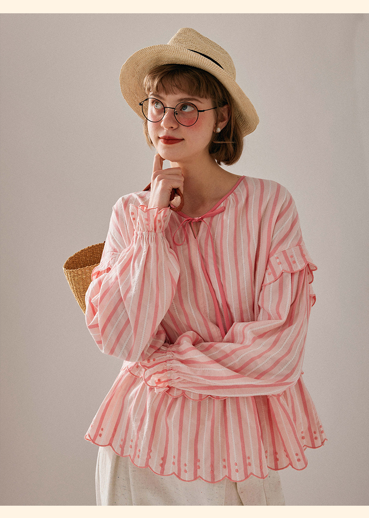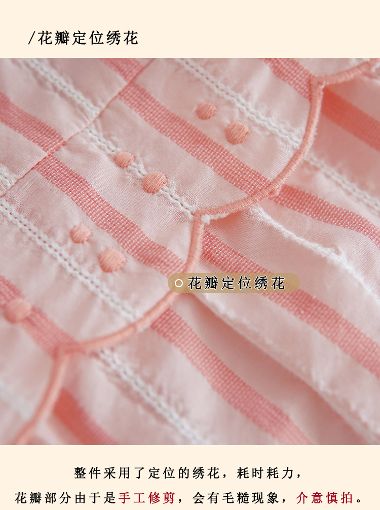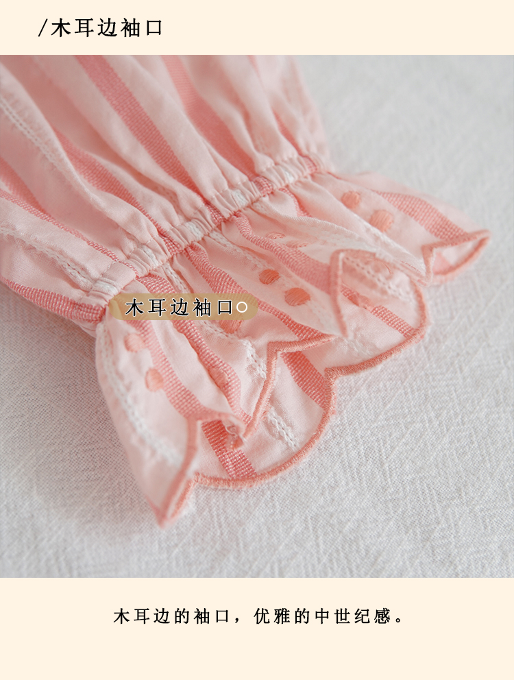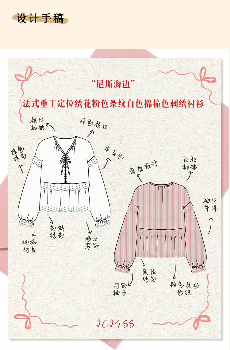 浮生八记/24A019/法式重工定位粉色条纹白色棉撞色刺绣衬衫