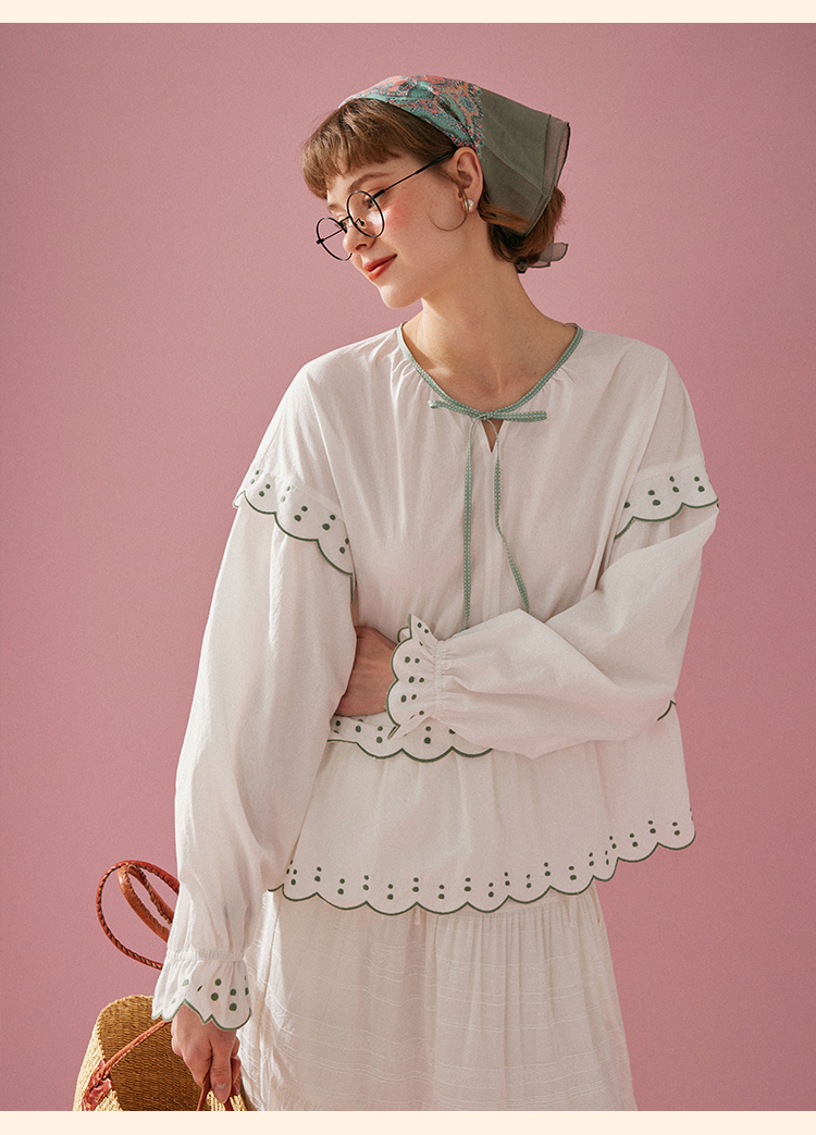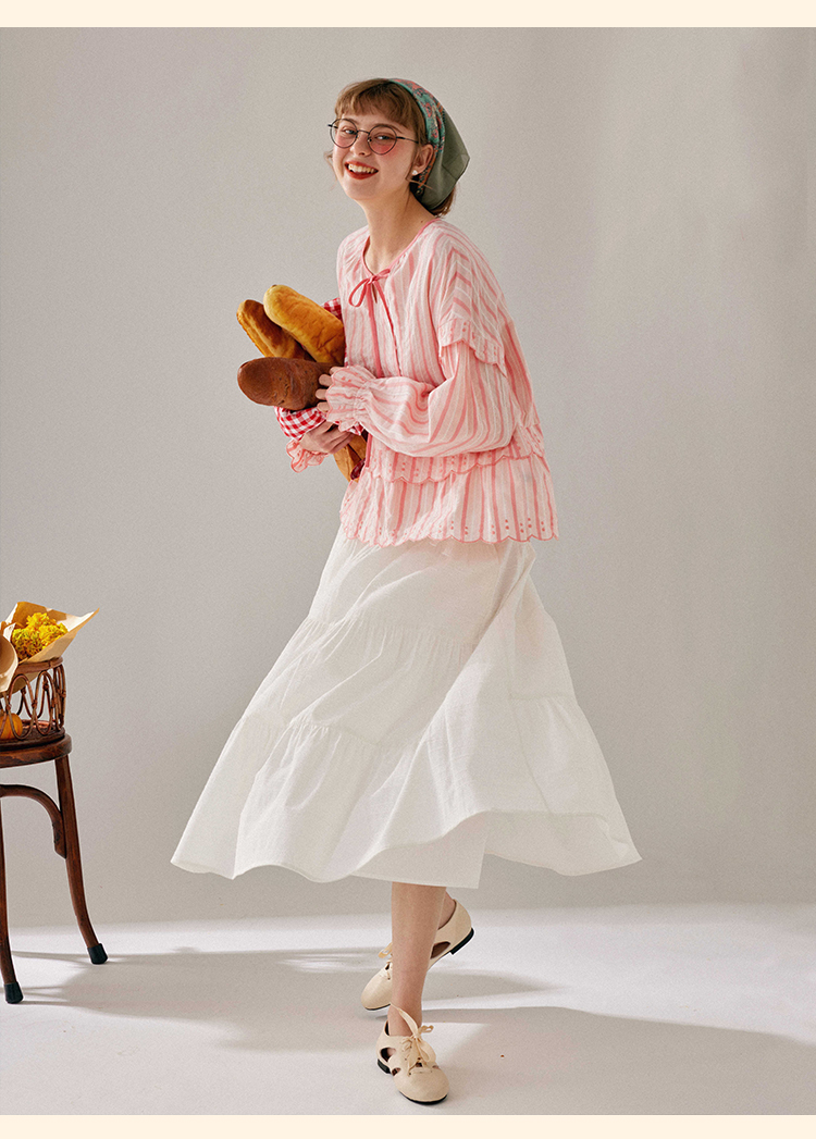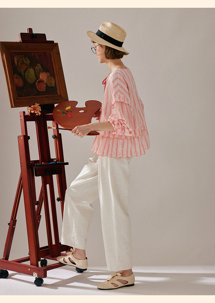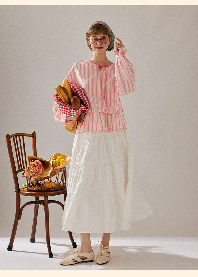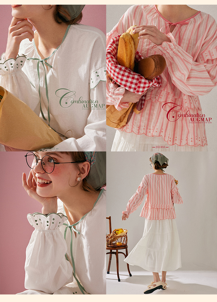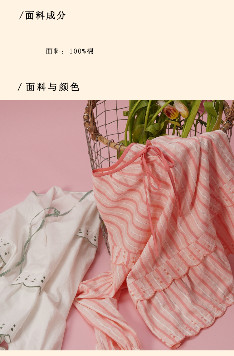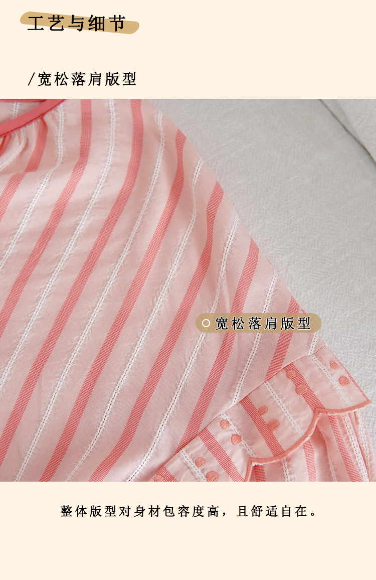 浮生八记/24A019/法式重工定位粉色条纹白色棉撞色刺绣衬衫