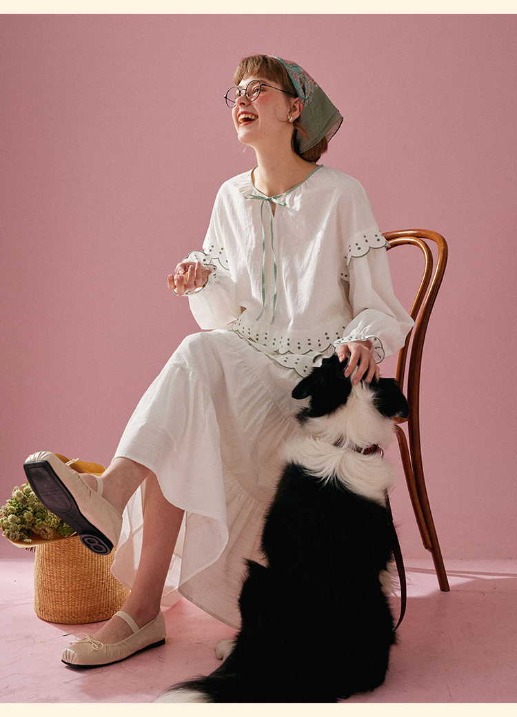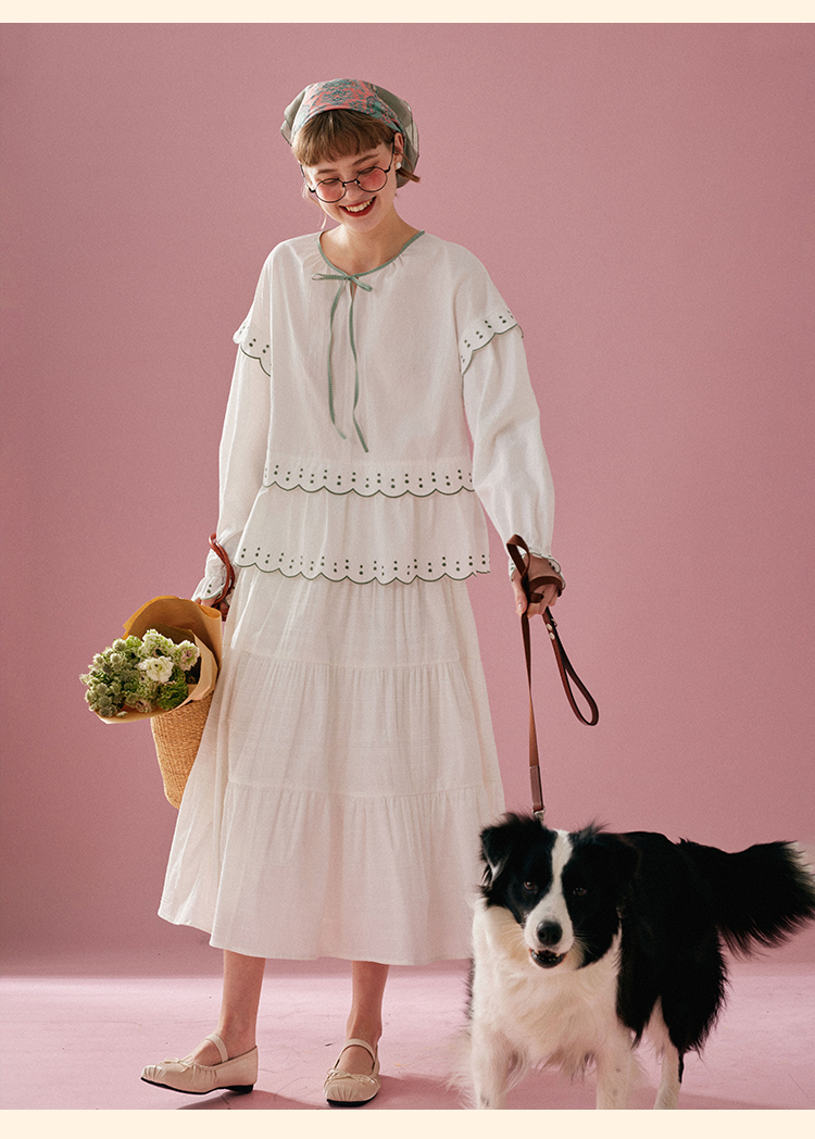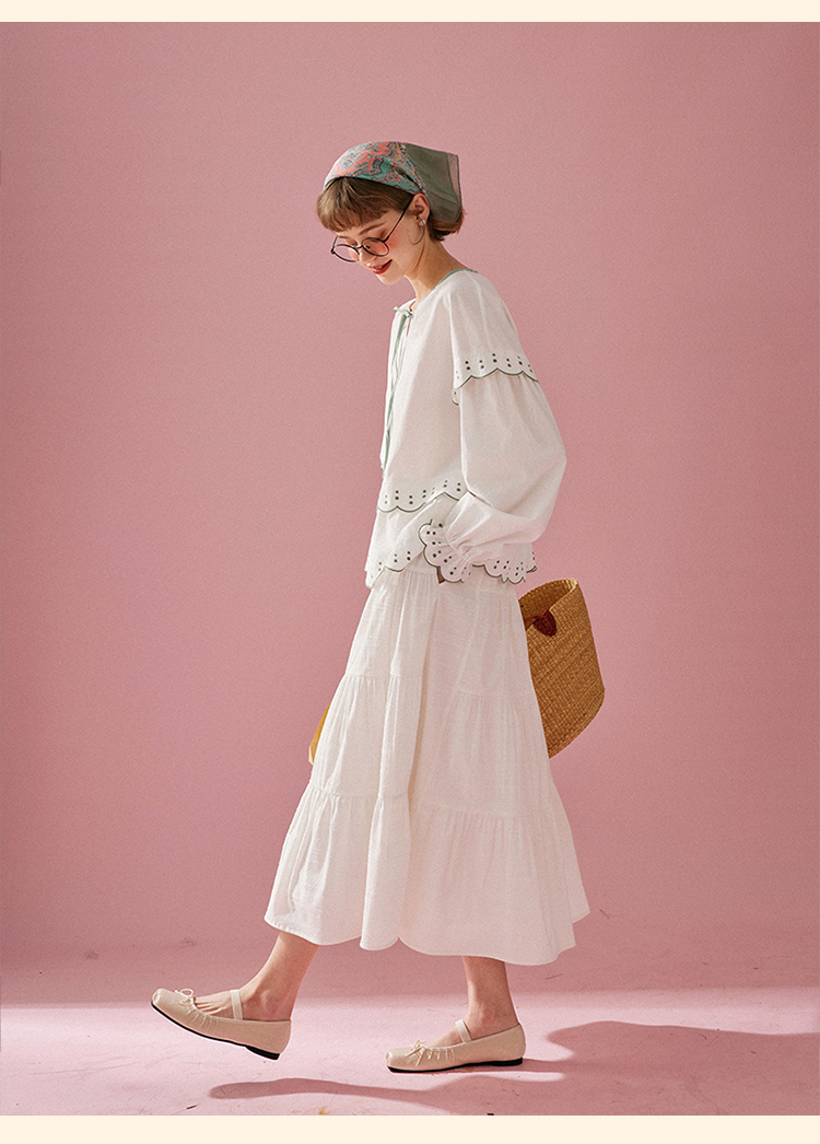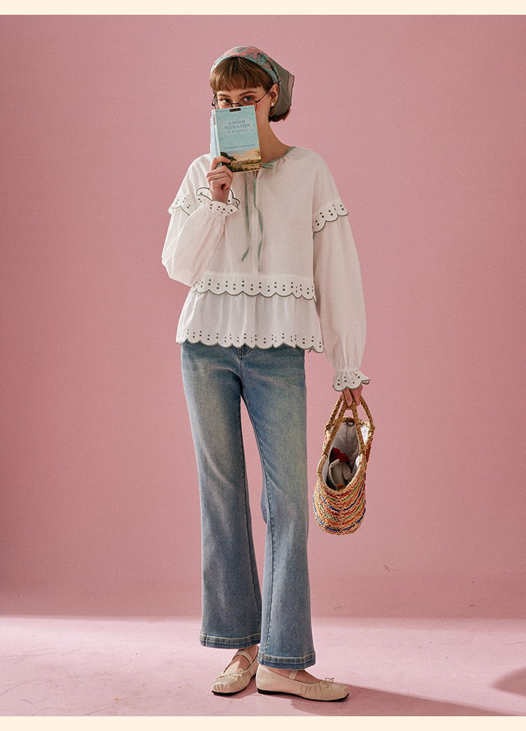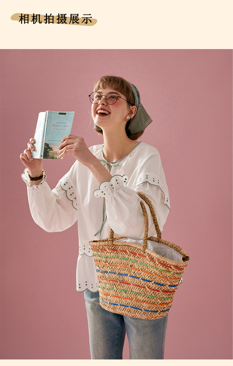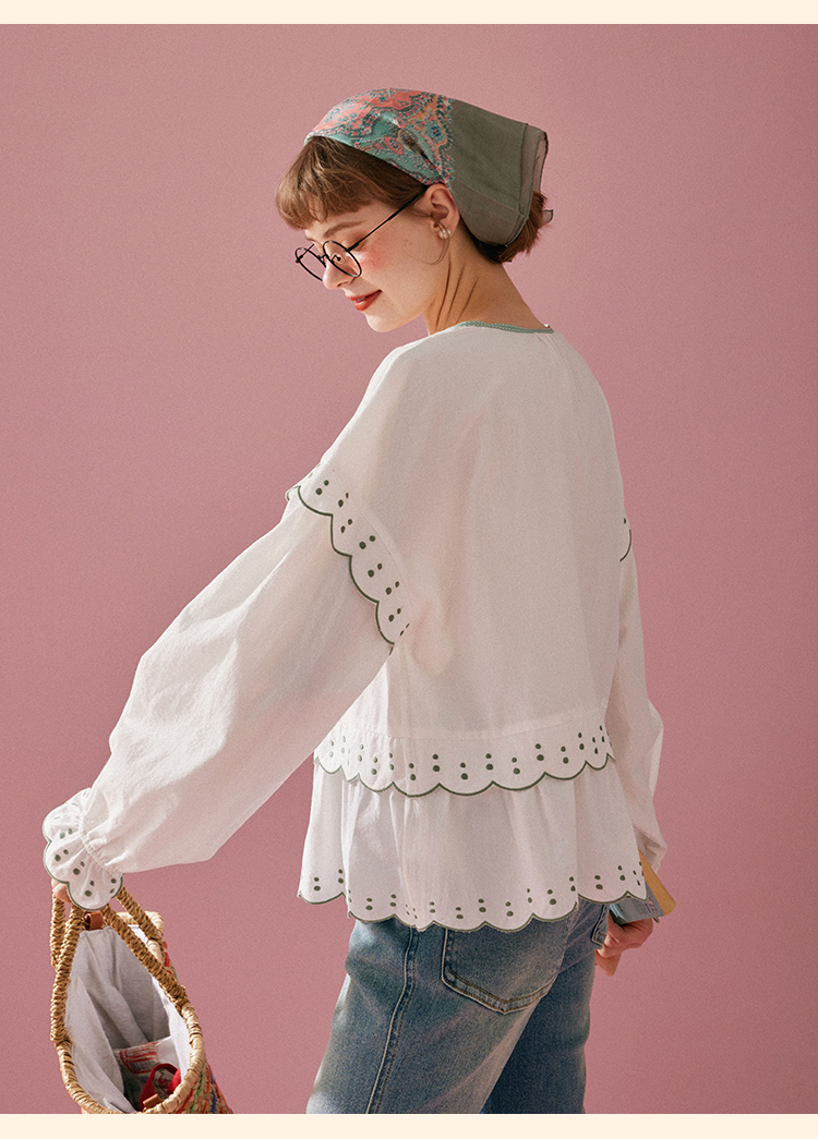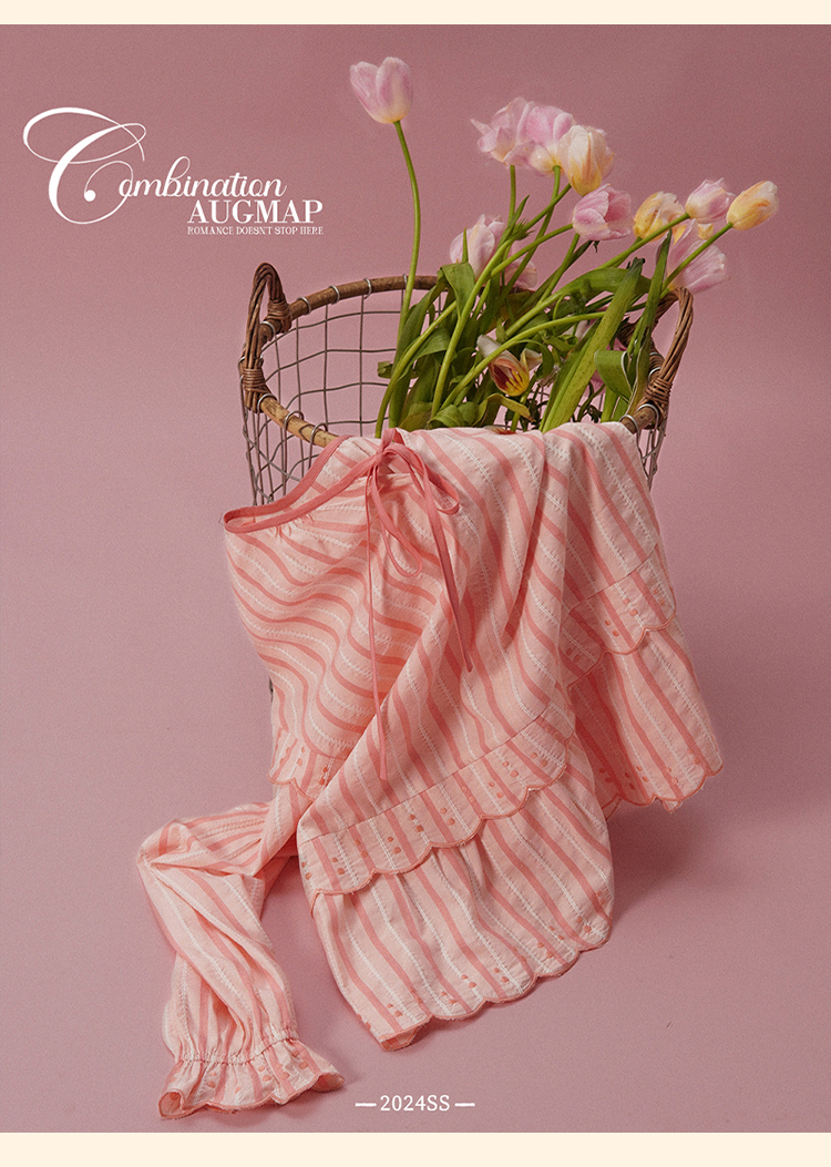 浮生八记/24A019/法式重工定位粉色条纹白色棉撞色刺绣衬衫