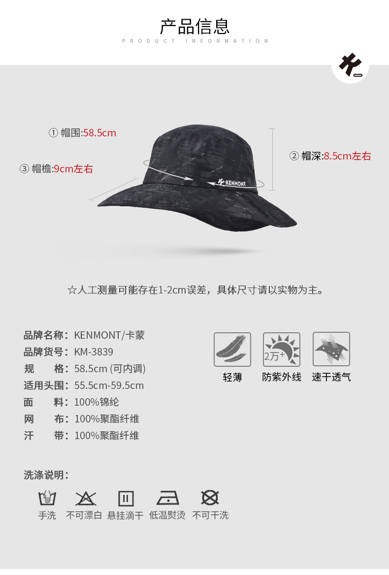 卡蒙帽子2021夏季新款户外遮阳帽休闲运动帽垂钓男帽女帽渔夫帽 KM-3839-01