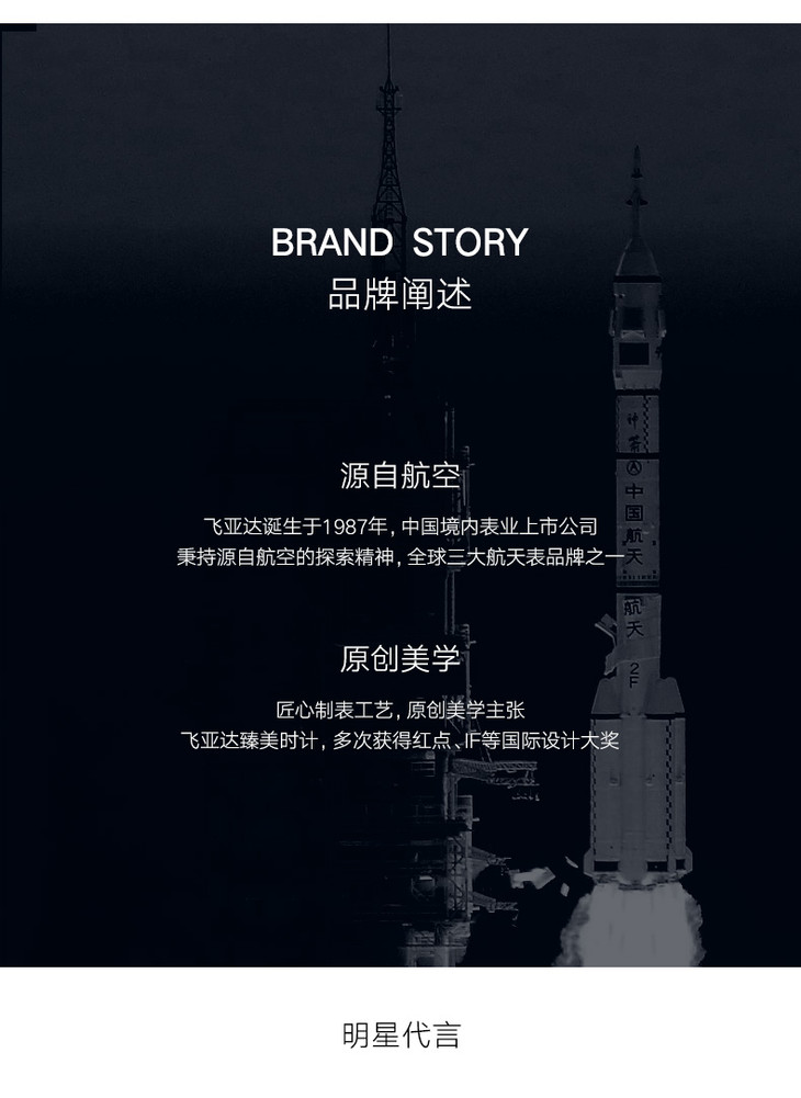 - 飞亚达表秉持源自航空的超精密工艺,飞亚达以专业与美感兼具的腕表设计,演绎对“飞”的艺术化探索,诠释非凡向上的品牌风范,讲述“一旦拥有,别无所求”的故事。