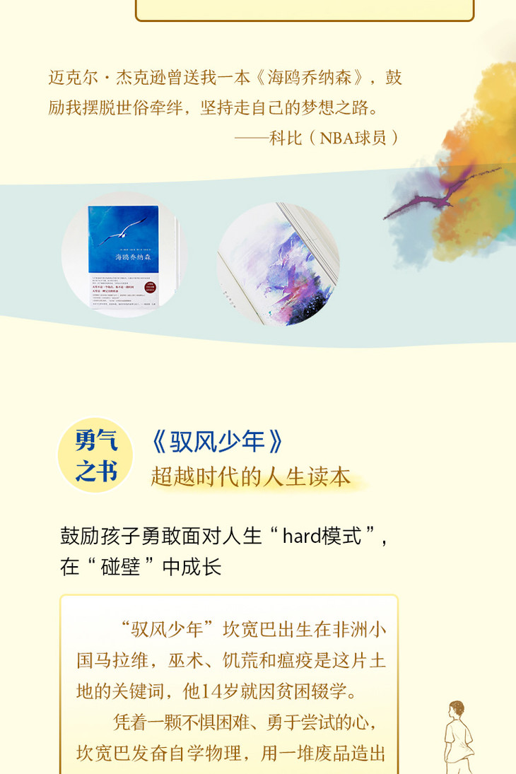★《海鸥乔纳森》入选美英法德日教科书、“北大版”大学语文全国通用教科书,是《纽约时报》《时代周刊》“世纪之书”,也是NBA球员科比、迈克尔·杰克逊的梦想之书