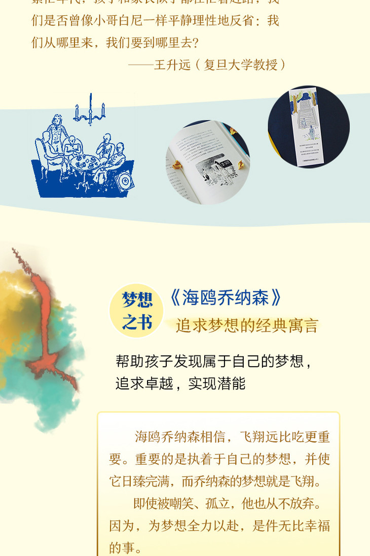 《海鸥乔纳森》:海鸥乔纳森相信,飞翔远比吃更重要。重要的是执着于梦想,并使它日臻完满,而乔纳森的梦想就是飞翔。即使被嘲笑、孤立,他也从不放弃。因为,为梦想全力以赴,是件无比幸福的事。这部追求梦想的经典寓言,帮助孩子发现属于自己的梦想,追求卓·越,实现潜能。