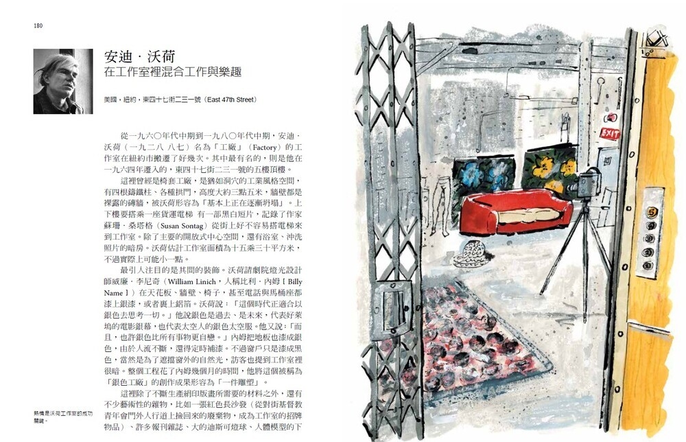 ★ 跨越时空和流派,亚历克斯.强森汇集了五十位艺术家,带领读者到他们工作室中心──从阁楼和榖仓、从地下室到工厂,有时整座城市都是他们的创作空间,其多样化与特殊性,令人惊奇。