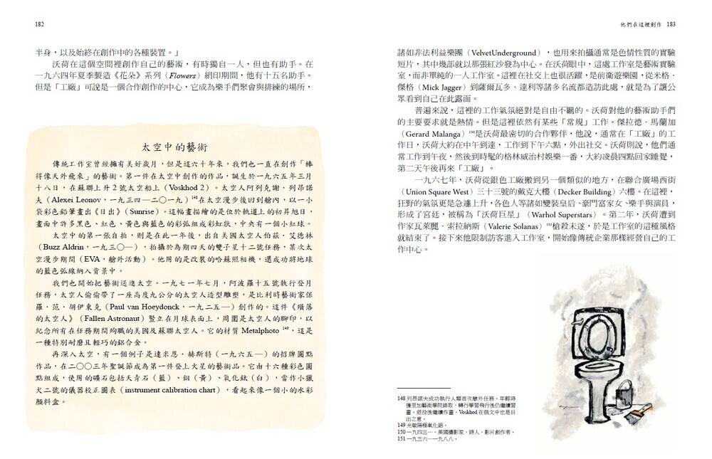 狭小的阁楼、华丽的沙龙、起居室、展览区、教学区、画廊,化妆室、轰炸机工厂、劳斯莱斯,庄园、城堡、街道……任何地方都可能成为艺术家的灵感来源,作者亚历克斯.强森偕同插画家詹姆斯.欧瑟斯二度合作,带领读者穿梭这些充满奇思妙想的空间,让人得以一窥艺术家的创作心灵、态度与想法。
