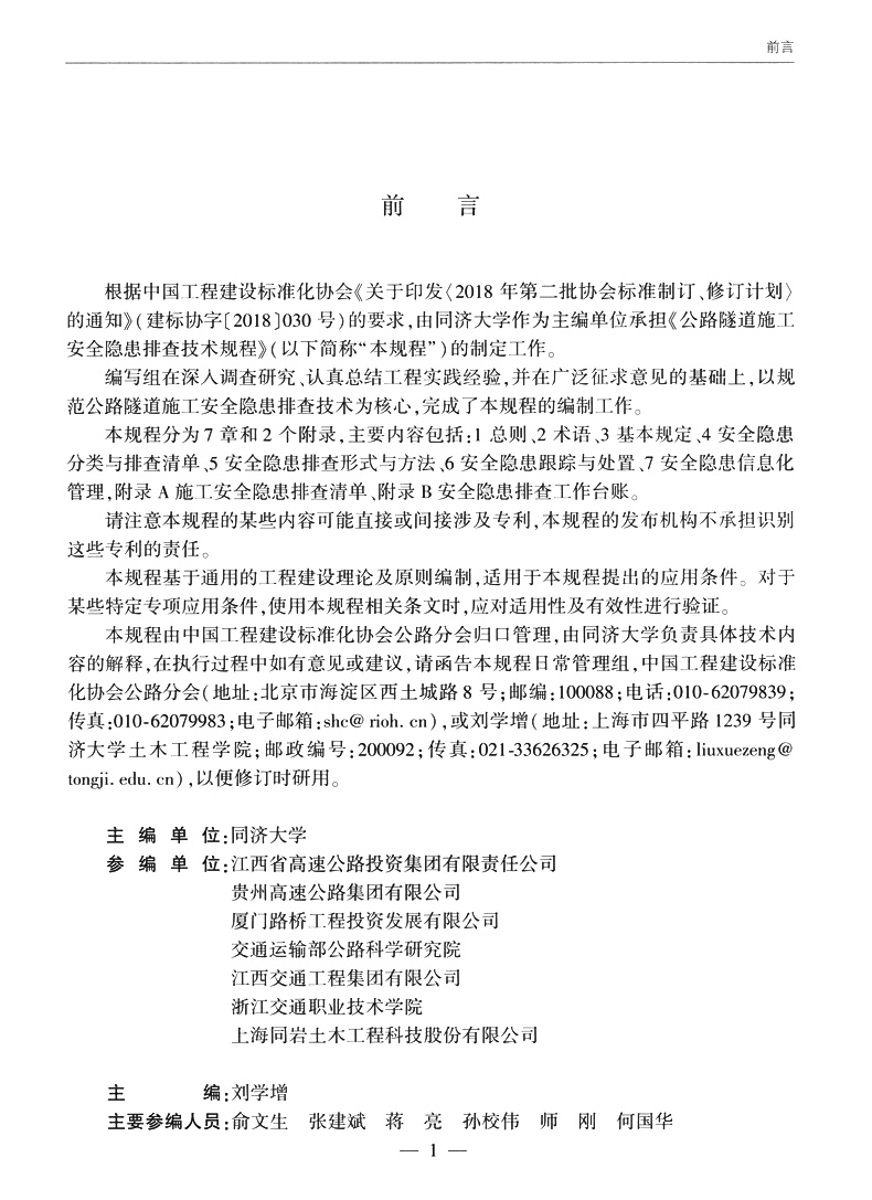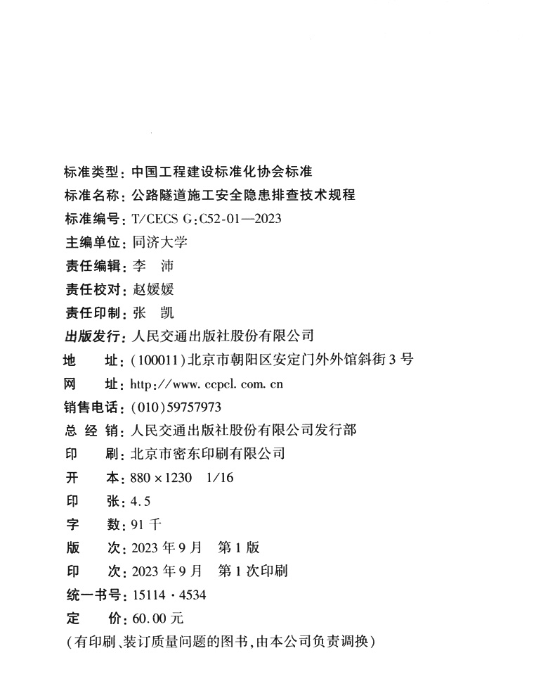 书名:公路隧道施工安全隐患排查技术规程(T/CECS G:C52-01—2023)