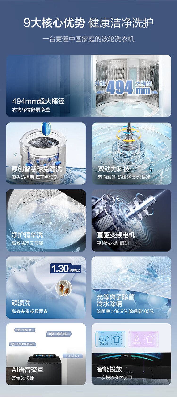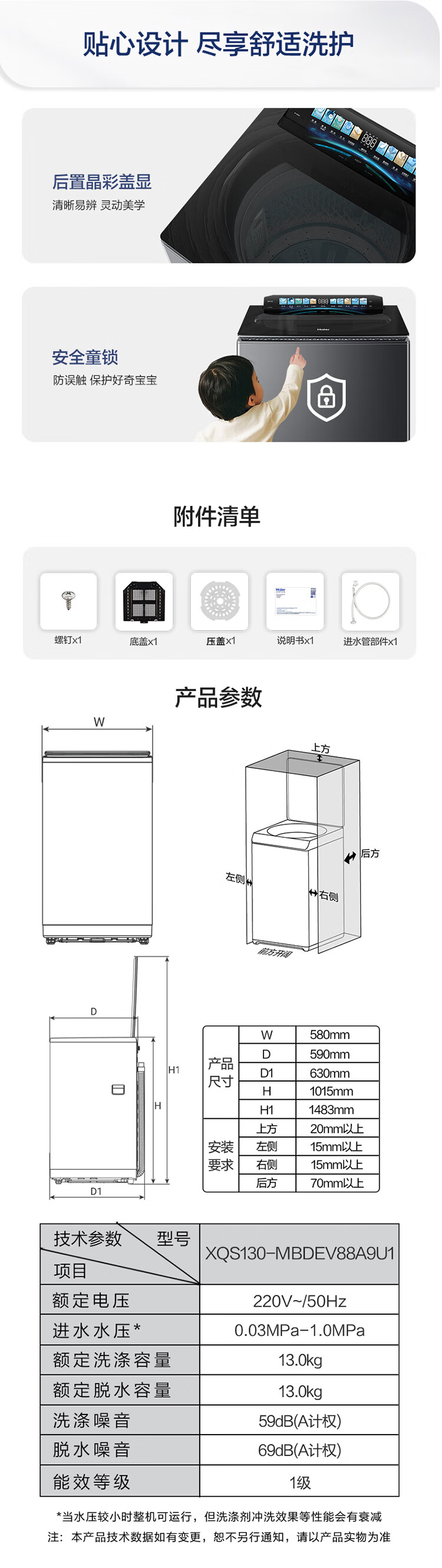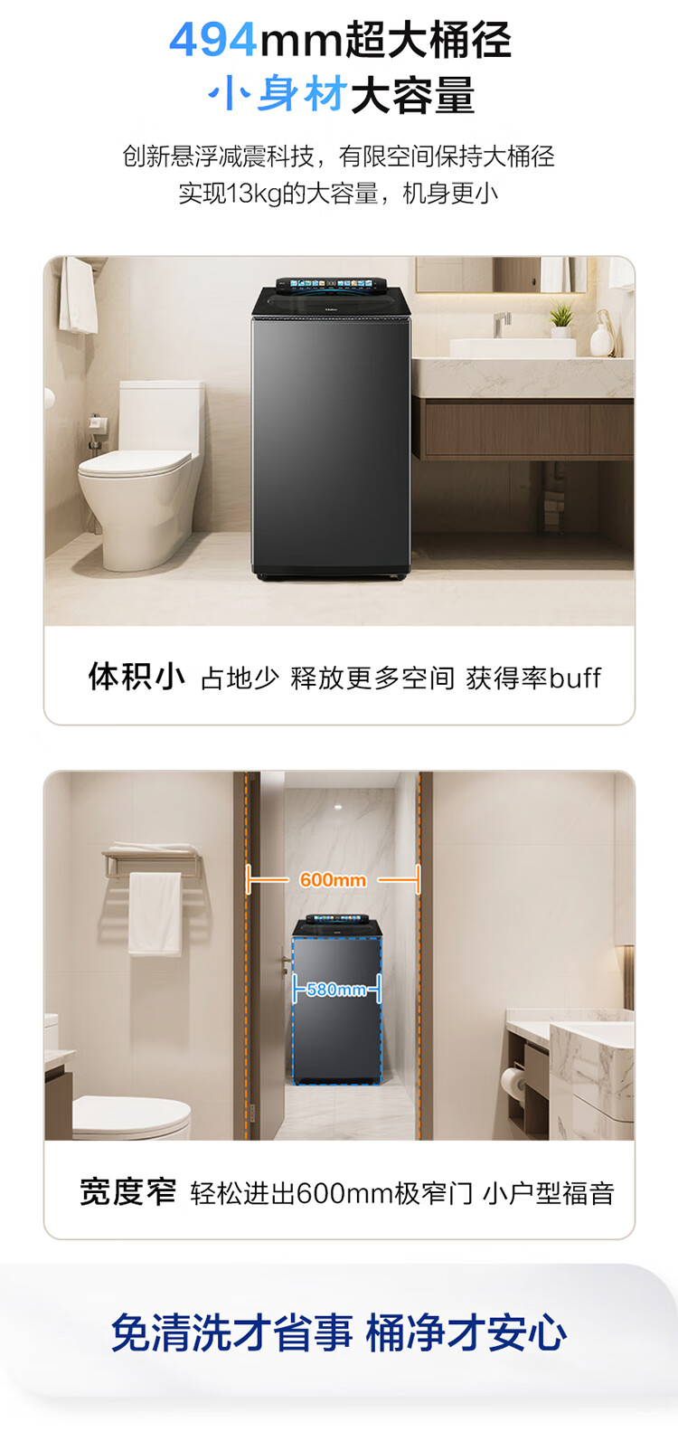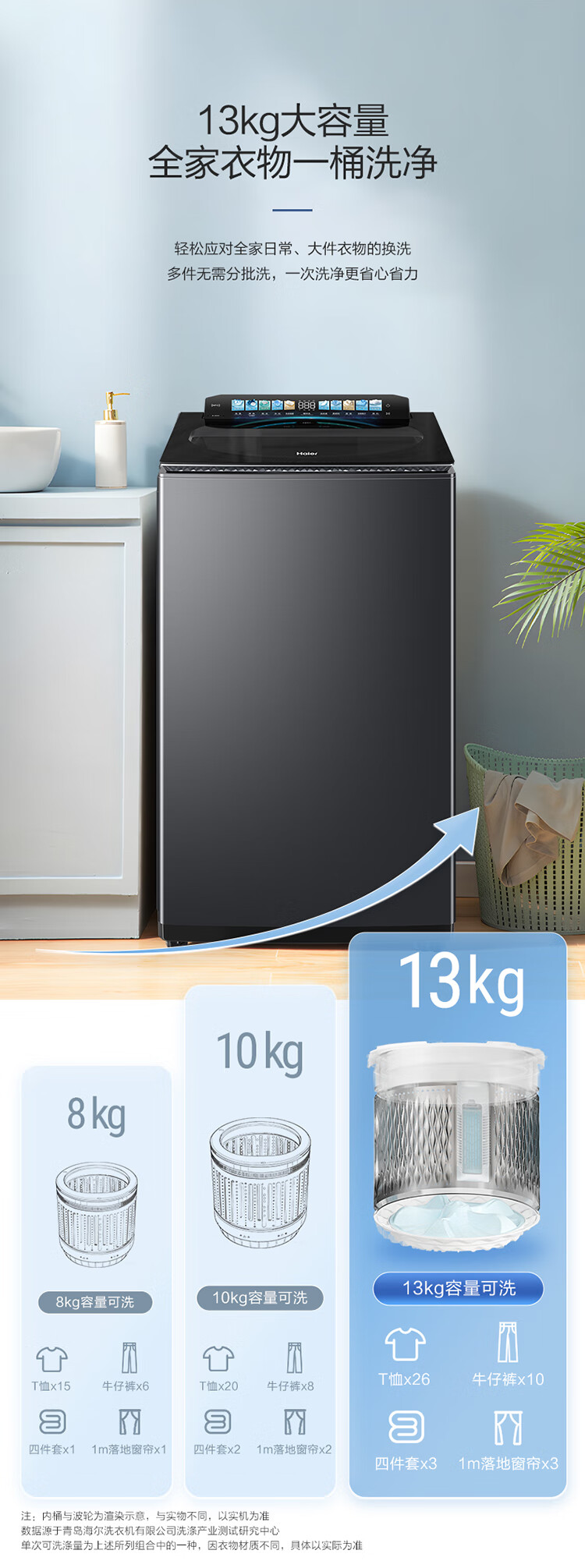 海尔(Haier)波轮洗衣机全自动13KG 25年新品丨双动力+智慧球+494大筒+智投精华洗 商场同款XQS130-MBDEV88A9U1