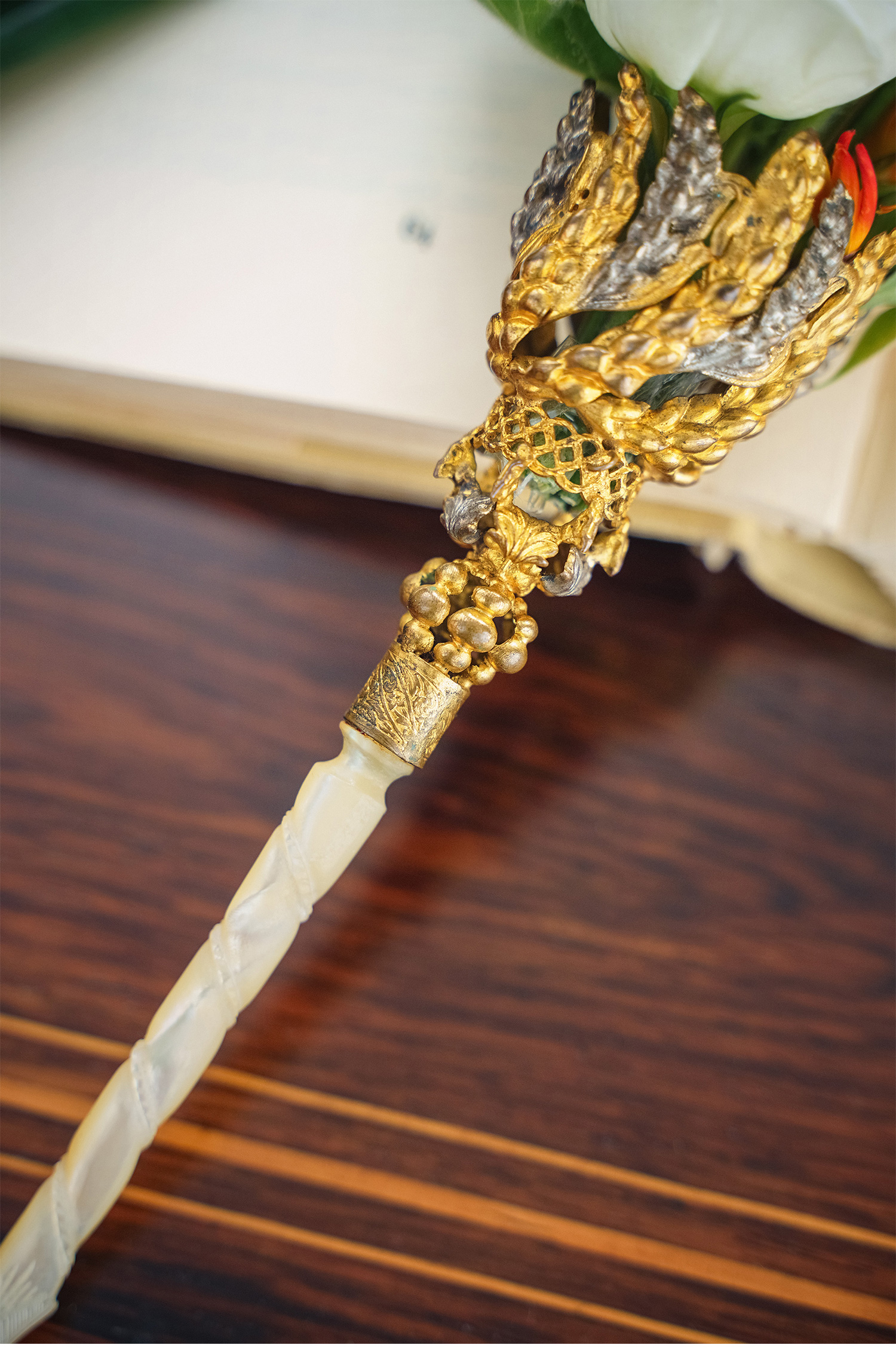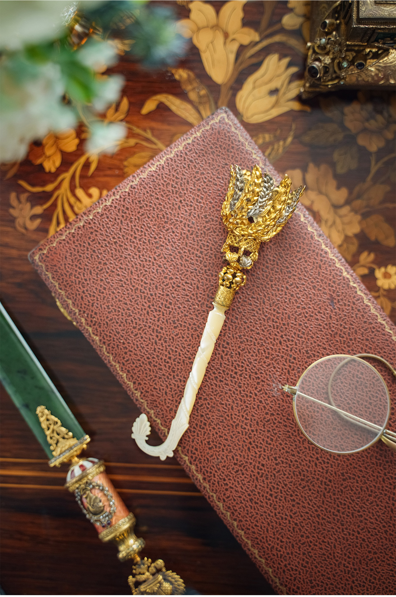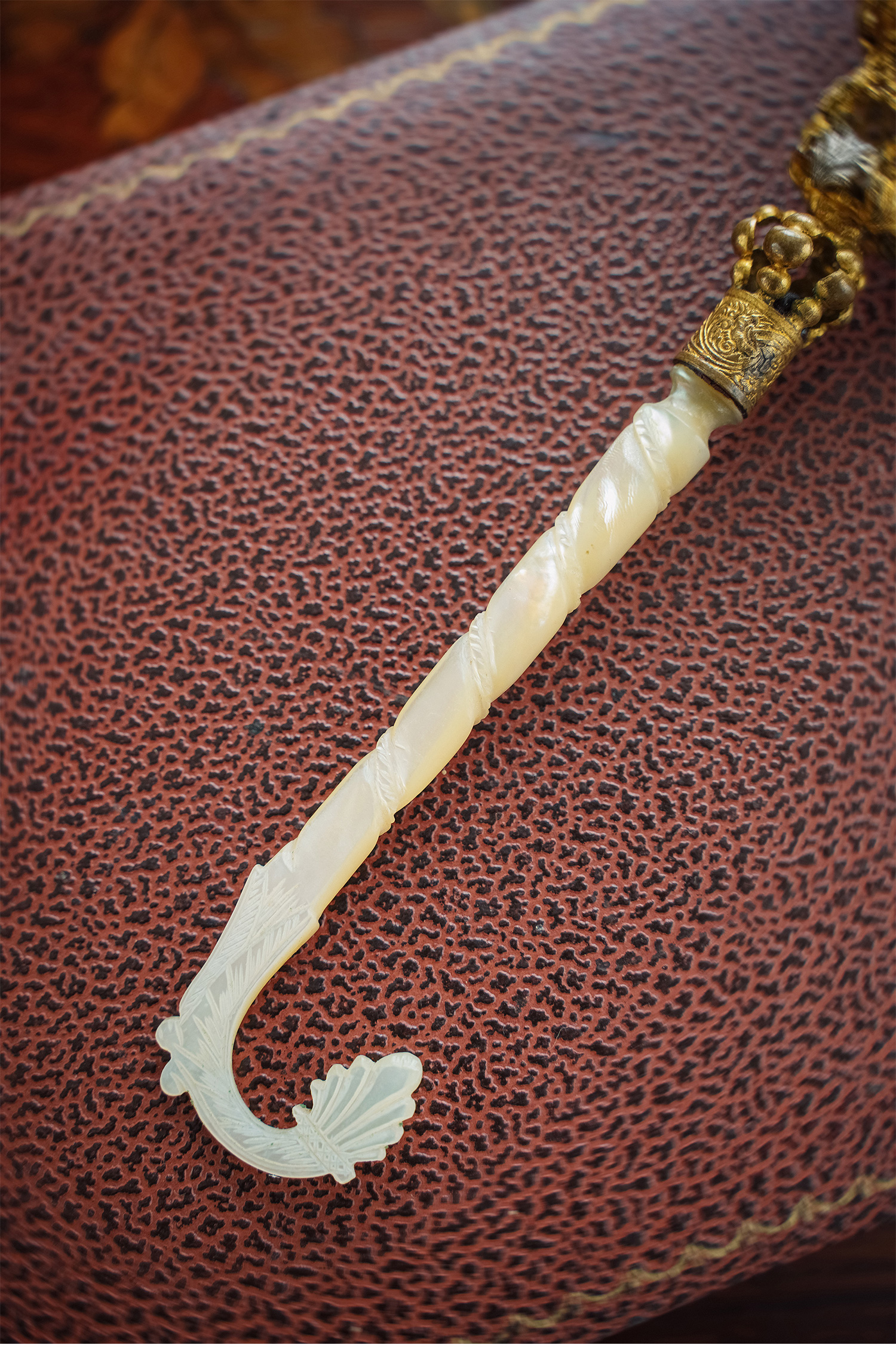 1850-1880年代法国出品麦穗主题铜鎏金精雕母贝手柄捧花棒