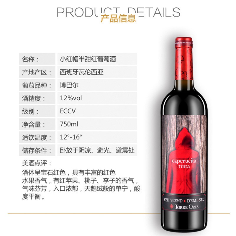西班牙奥兰小红帽红酒半甜红葡萄酒750ml*1瓶/6瓶