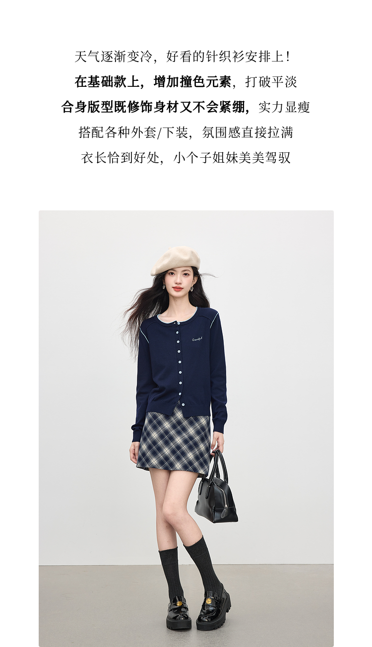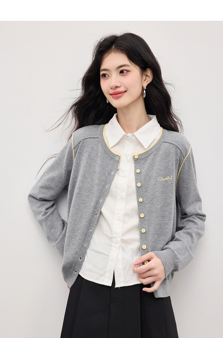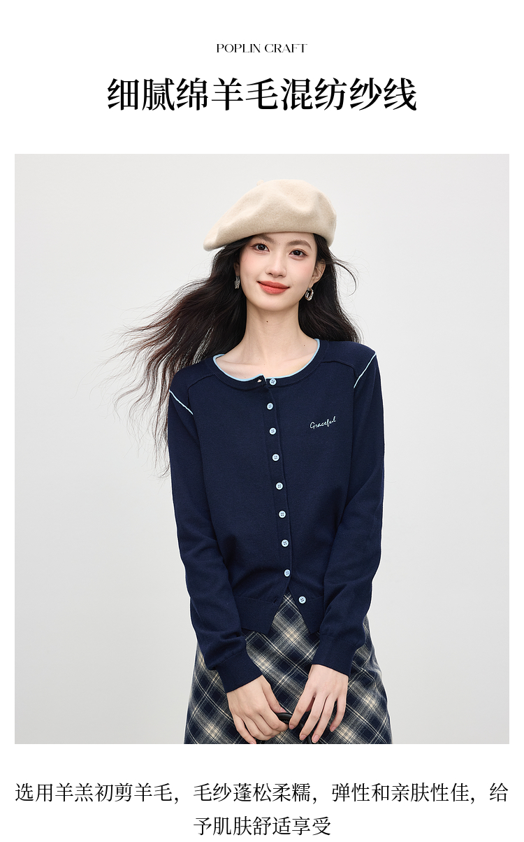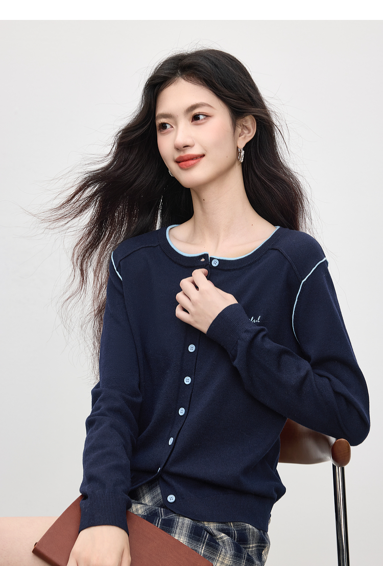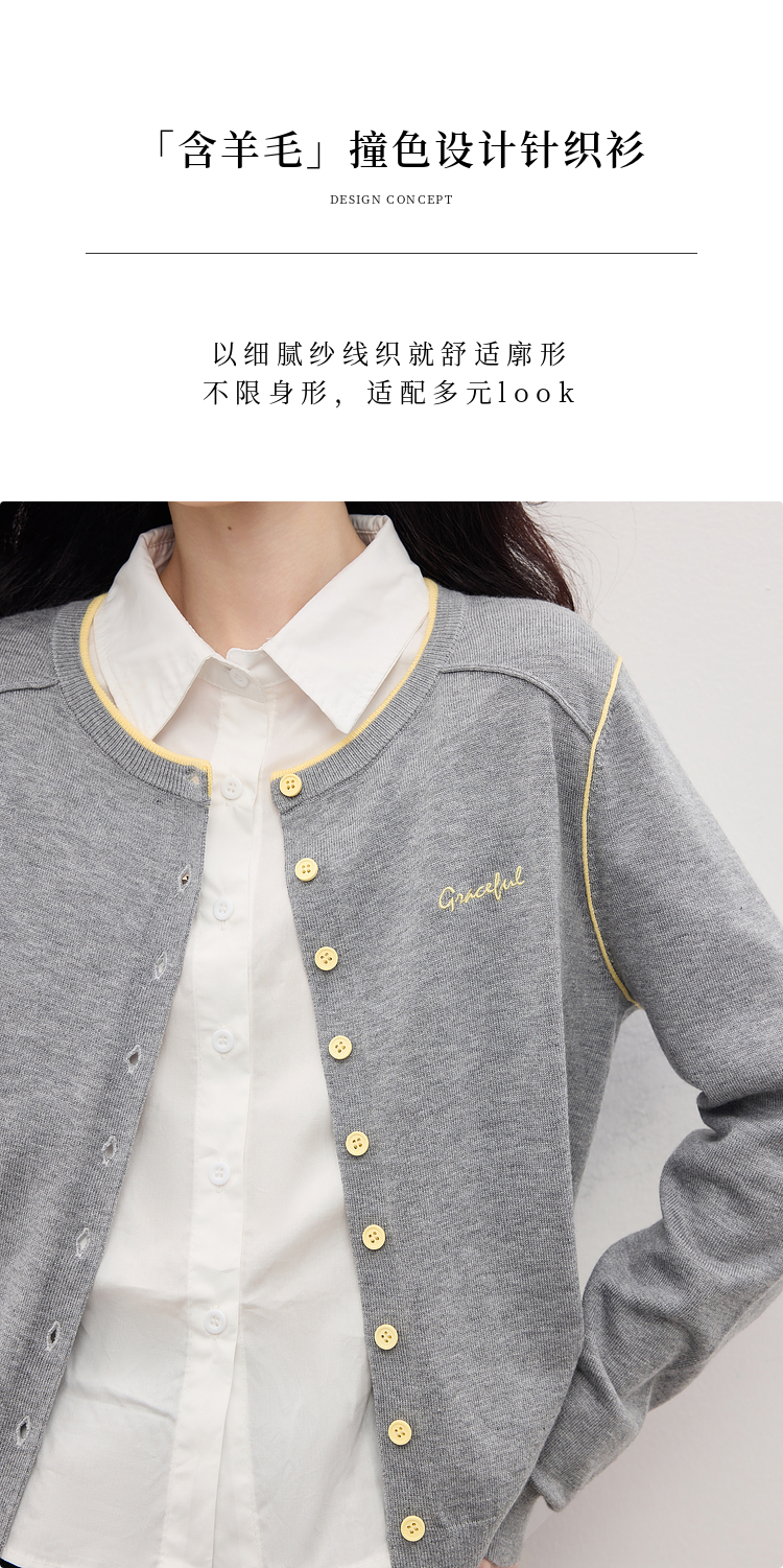 【09/03新品】熙世界含羊毛撞色圆领针织衫女长袖时尚百搭毛衣开衫2025秋季新款