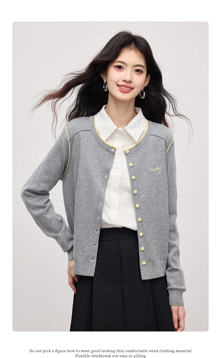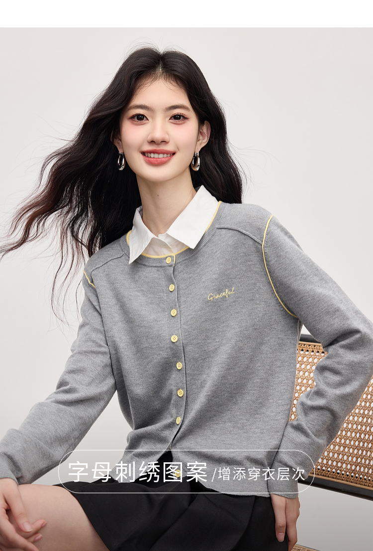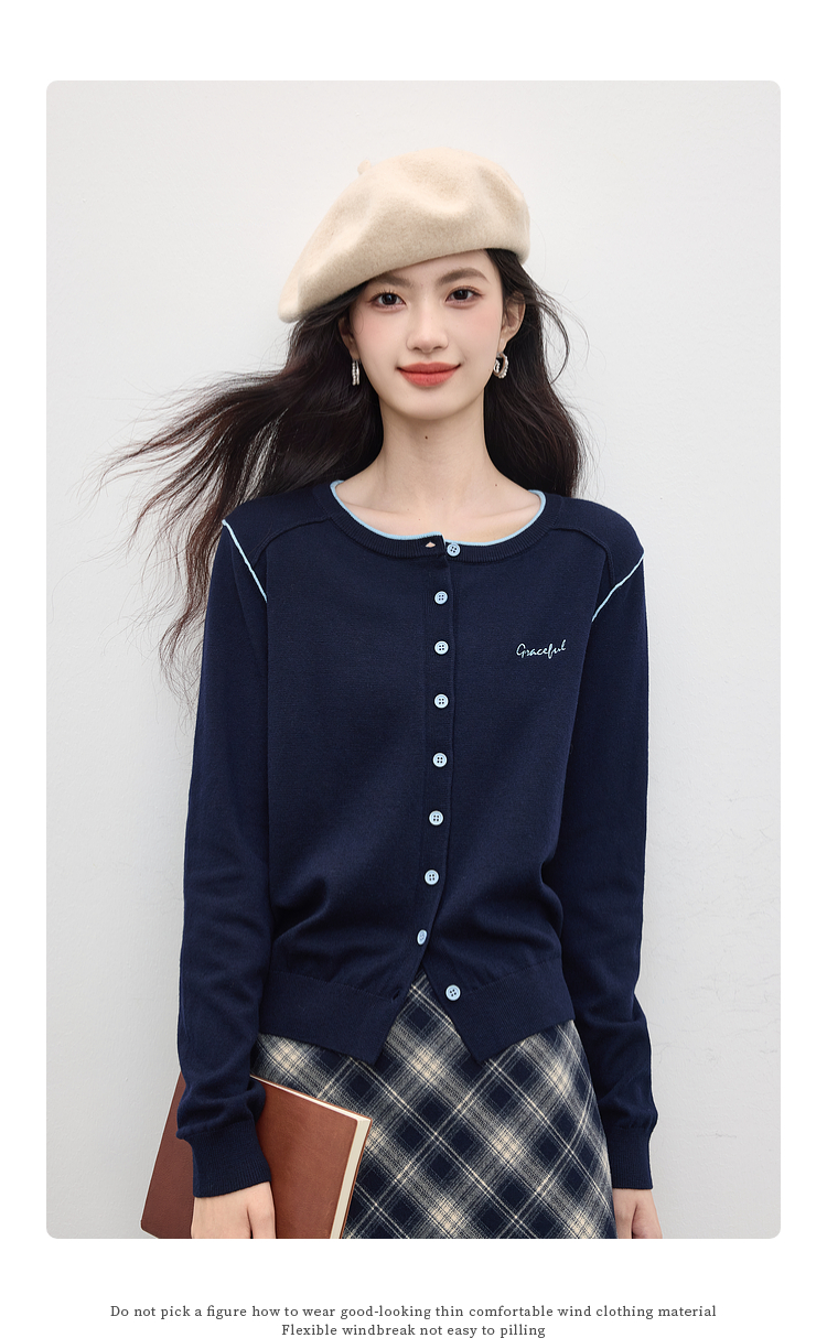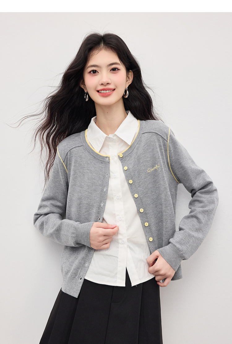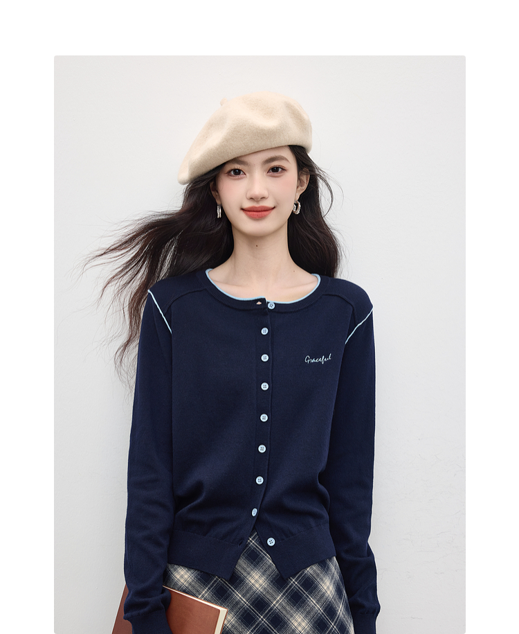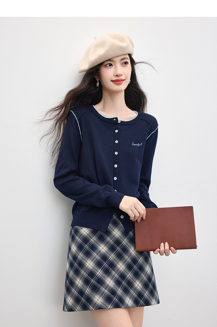 【09/03新品】熙世界含羊毛撞色圆领针织衫女长袖时尚百搭毛衣开衫2025秋季新款