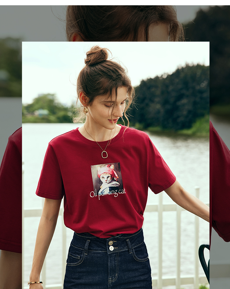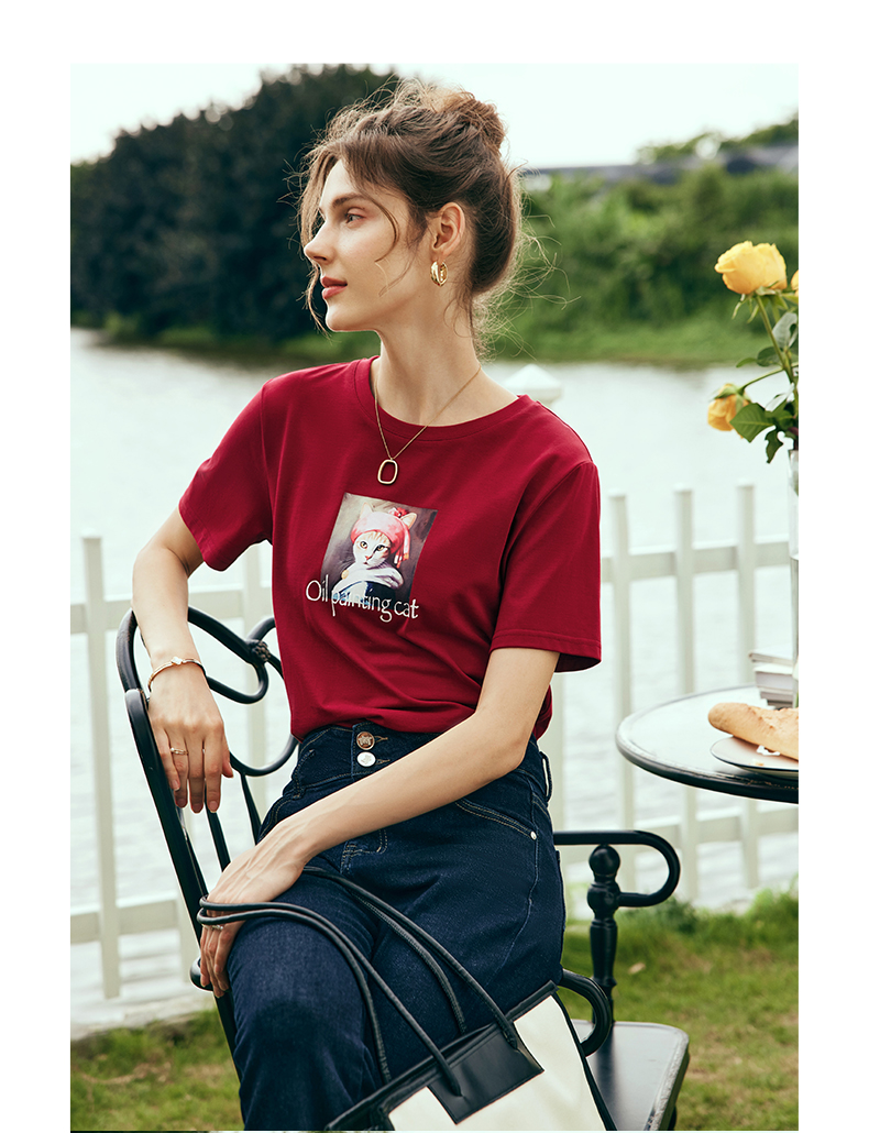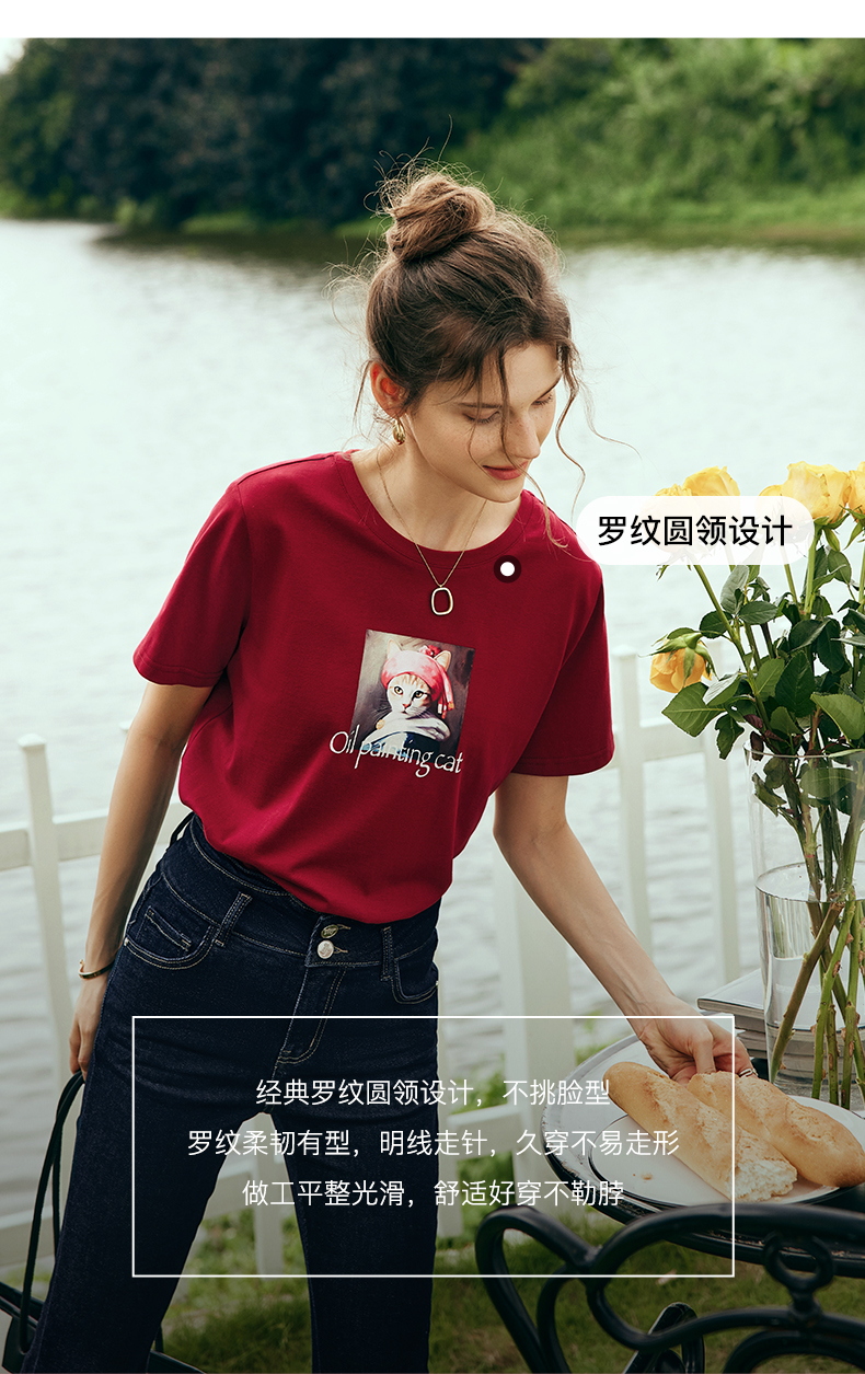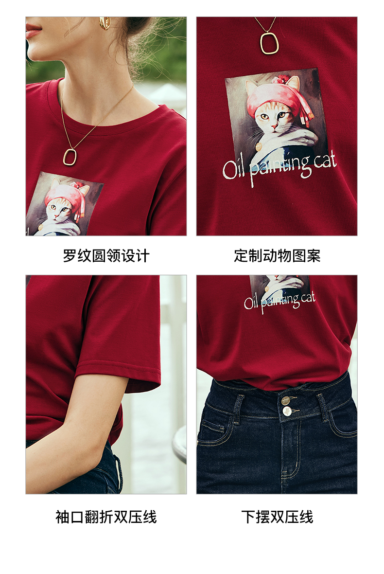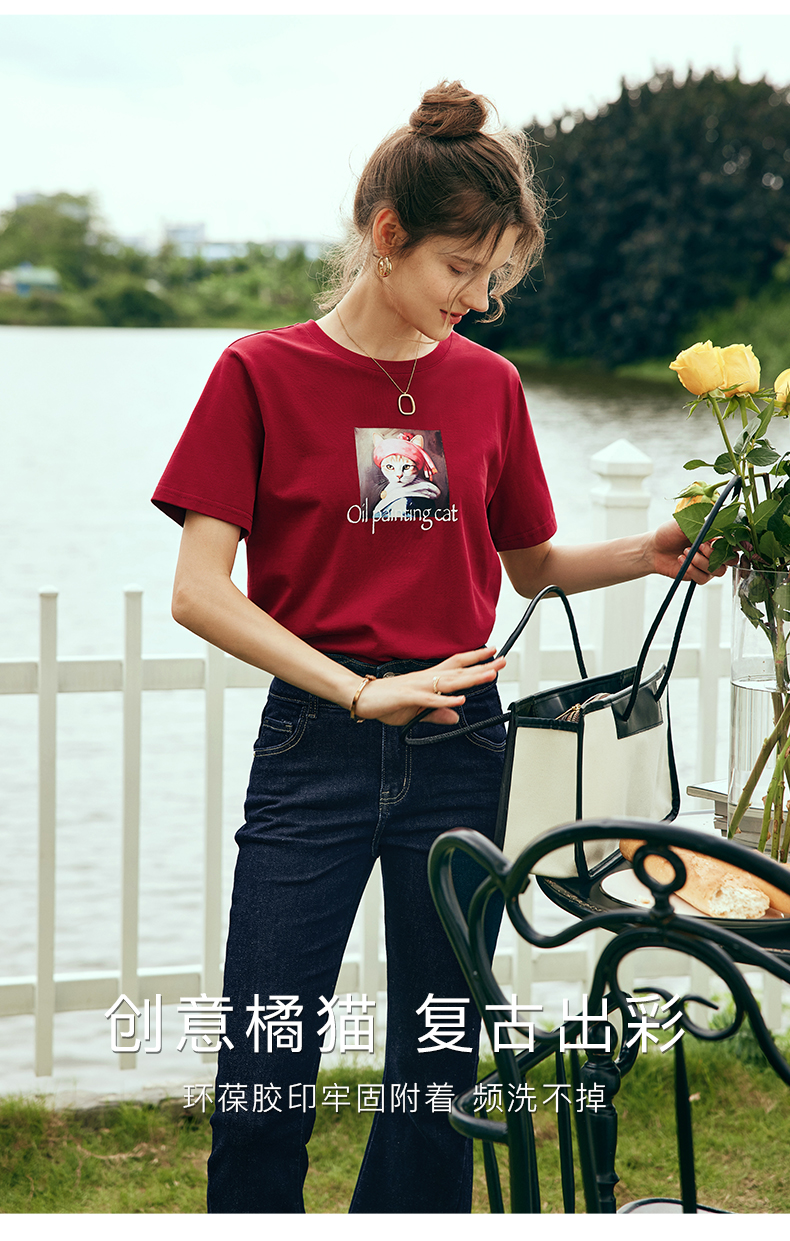 OLrain欧芮儿法式红色短袖T恤女夏季2023新款宽松小橘猫印花上衣
