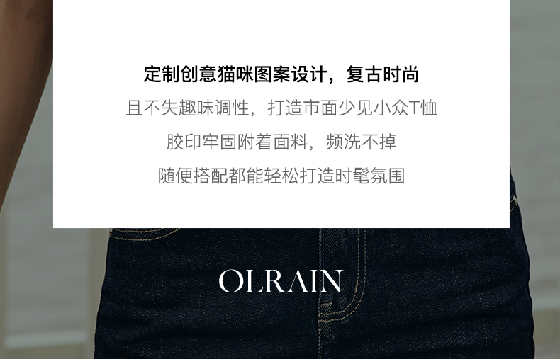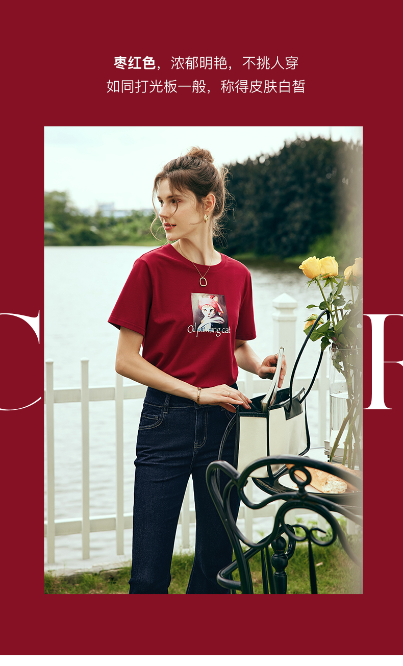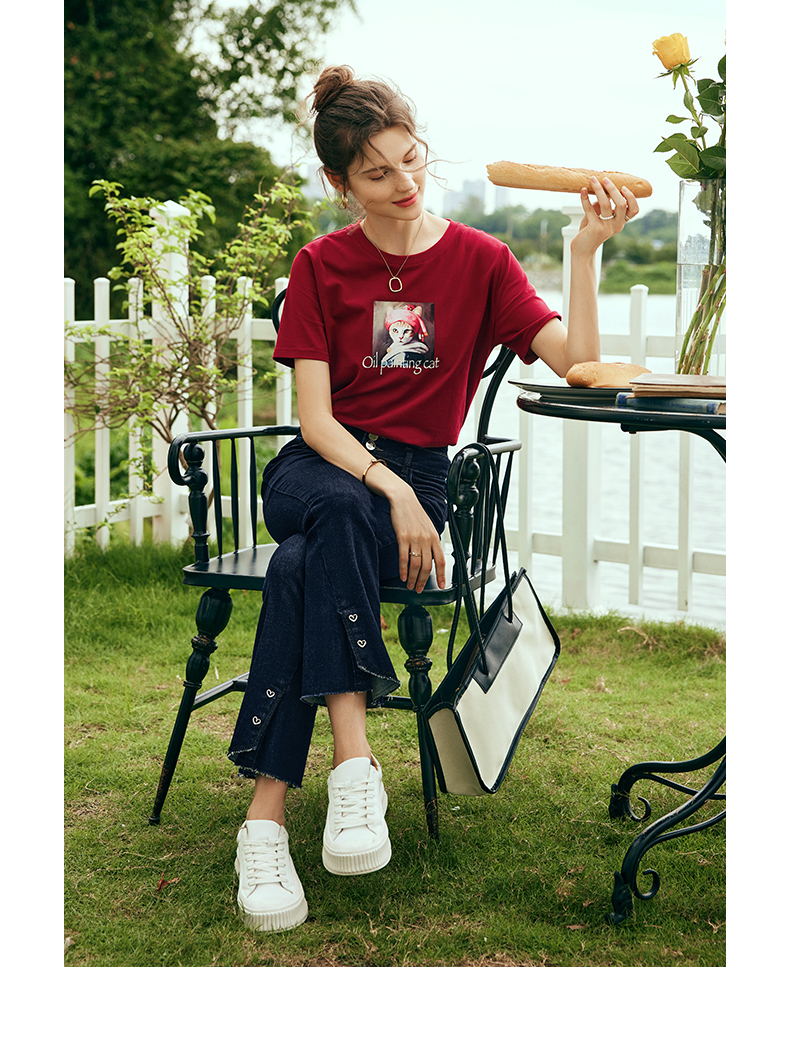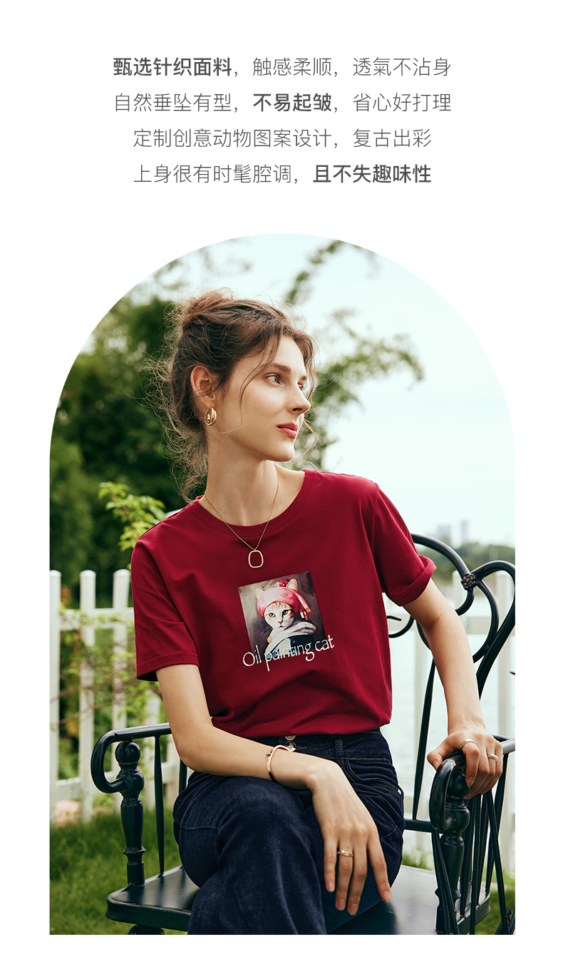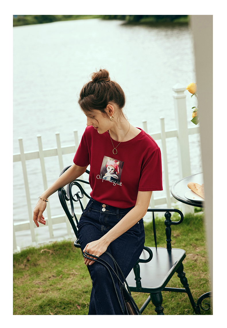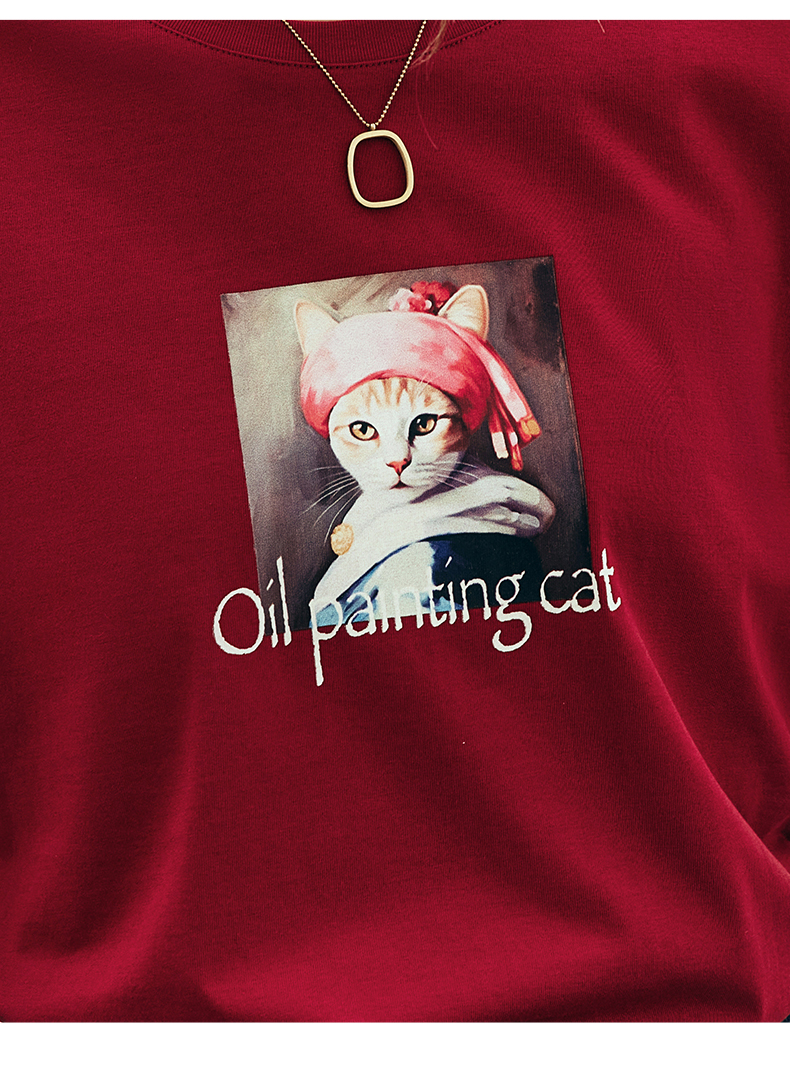 OLrain欧芮儿法式红色短袖T恤女夏季2023新款宽松小橘猫印花上衣