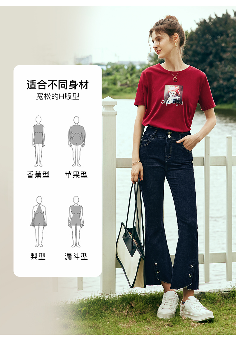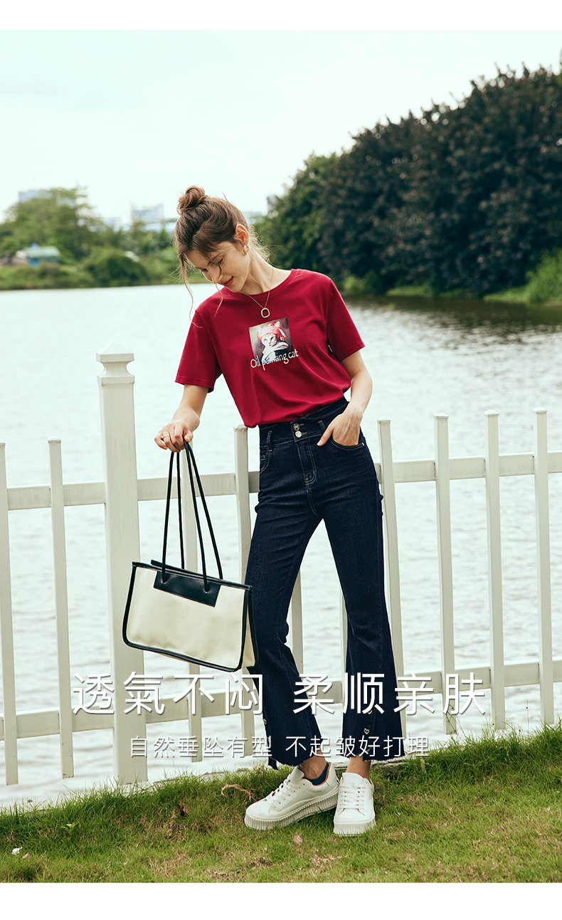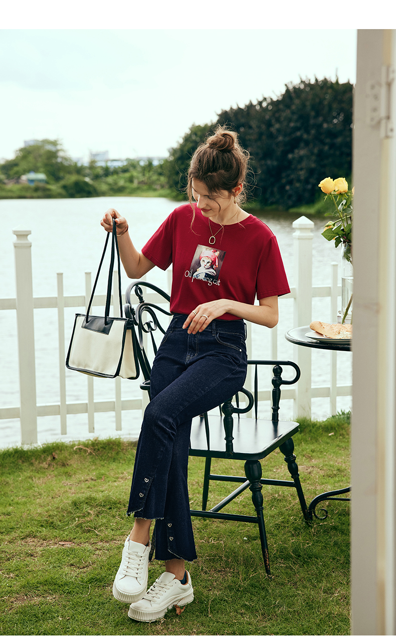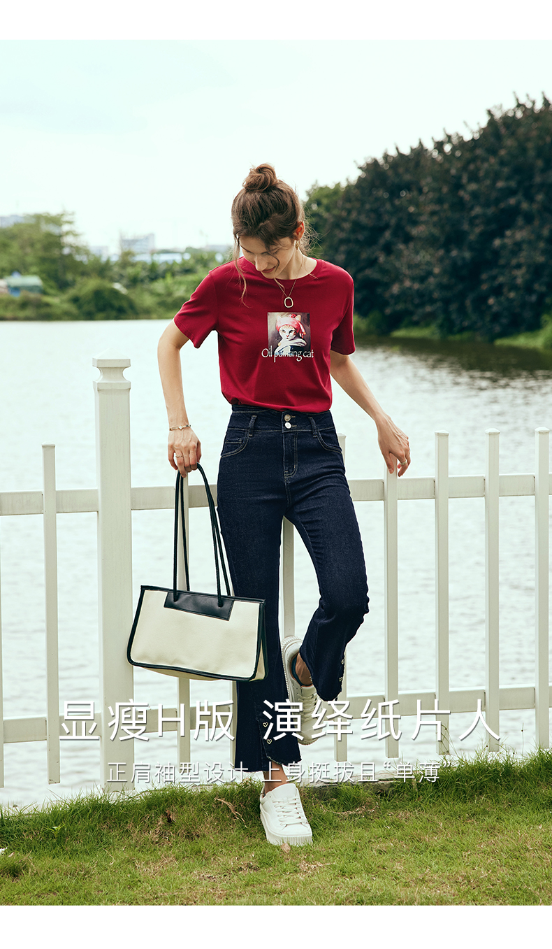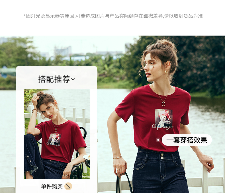 OLrain欧芮儿法式红色短袖T恤女夏季2023新款宽松小橘猫印花上衣
