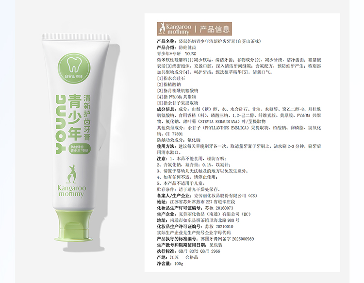 【青少年牙膏】防蛀去口气 袋鼠妈妈青少年清新护齿牙膏(柠檬白茶/白雾山茶/青青子提)100g