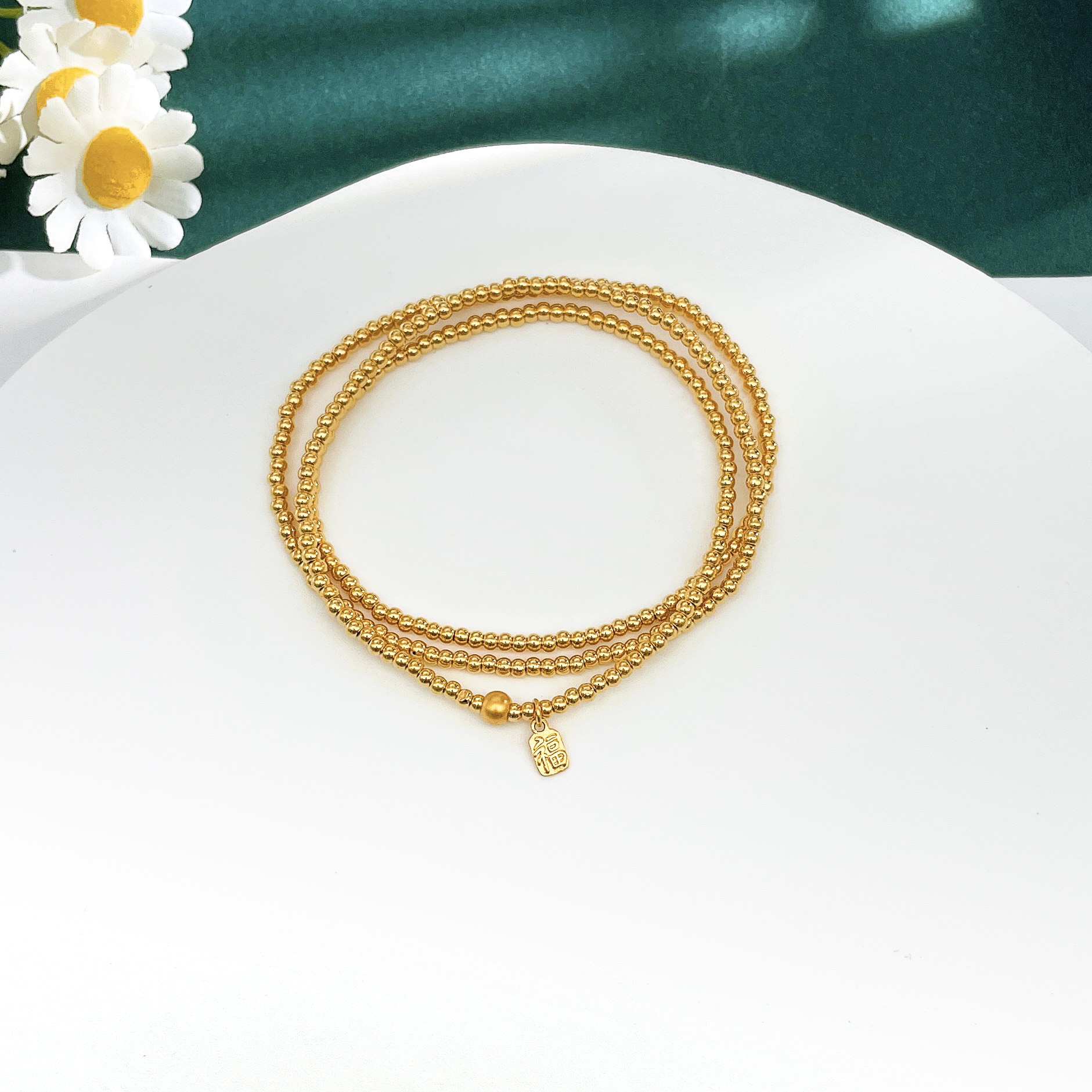 【限时克减150元】足金 #超轻 3D硬金空心小福字吊饰圆珠手串弹力绳成品三圈幸运手串(珠约2.2mm)(AK3DSC00009)预售产品下单后不退款不退货不换货不补差价