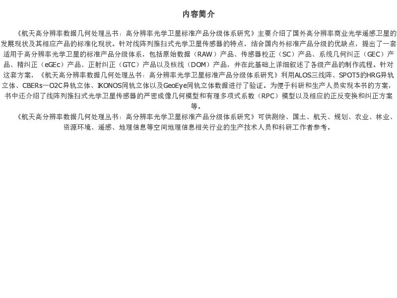《航天高分辨率数据几何处理丛书:高分辨率光学卫星标准产品分级体系研究》(张过,秦绪文,潘红播,等)
