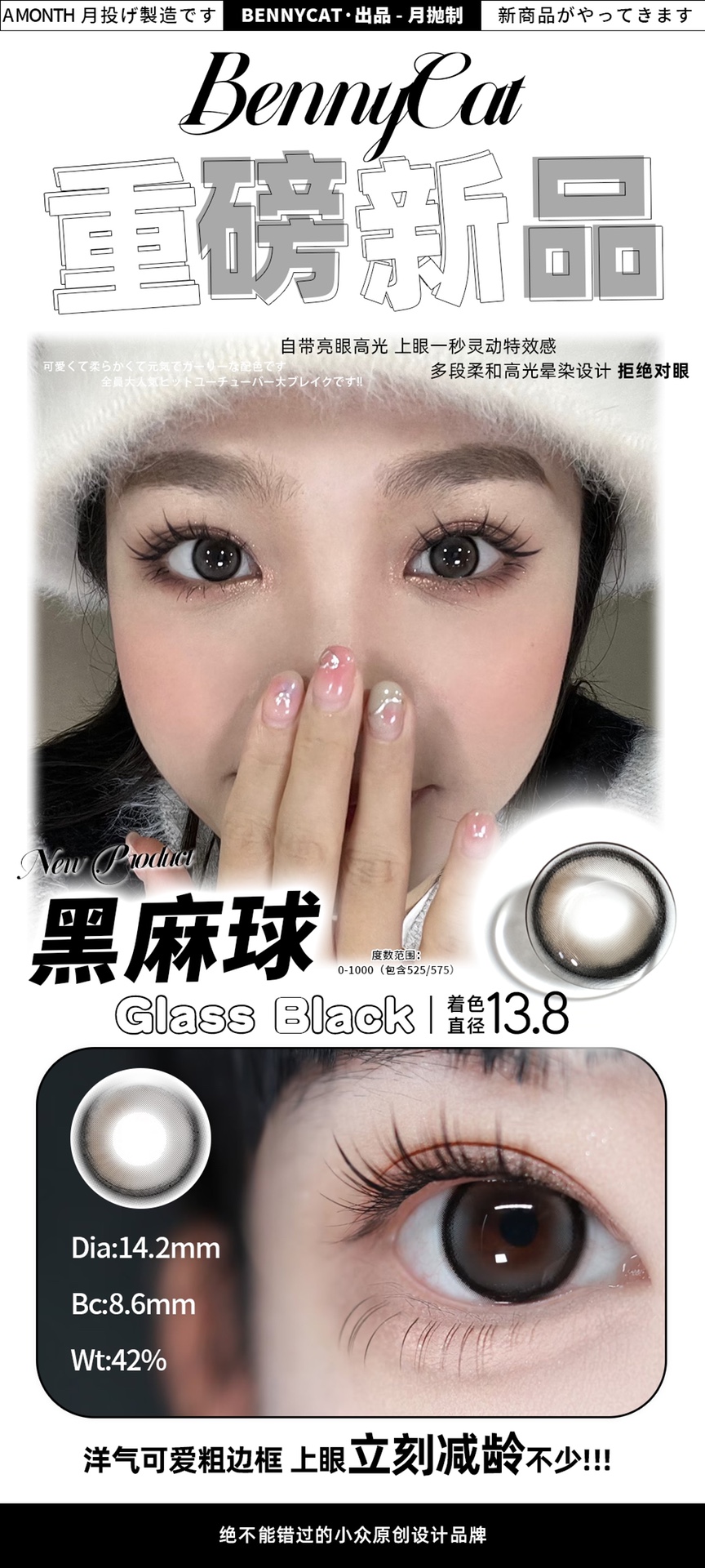Bennycat 黑麻球 月抛 2片 14.2mm 着色13.8mm 基弧8.6 含水42% 新锐国货