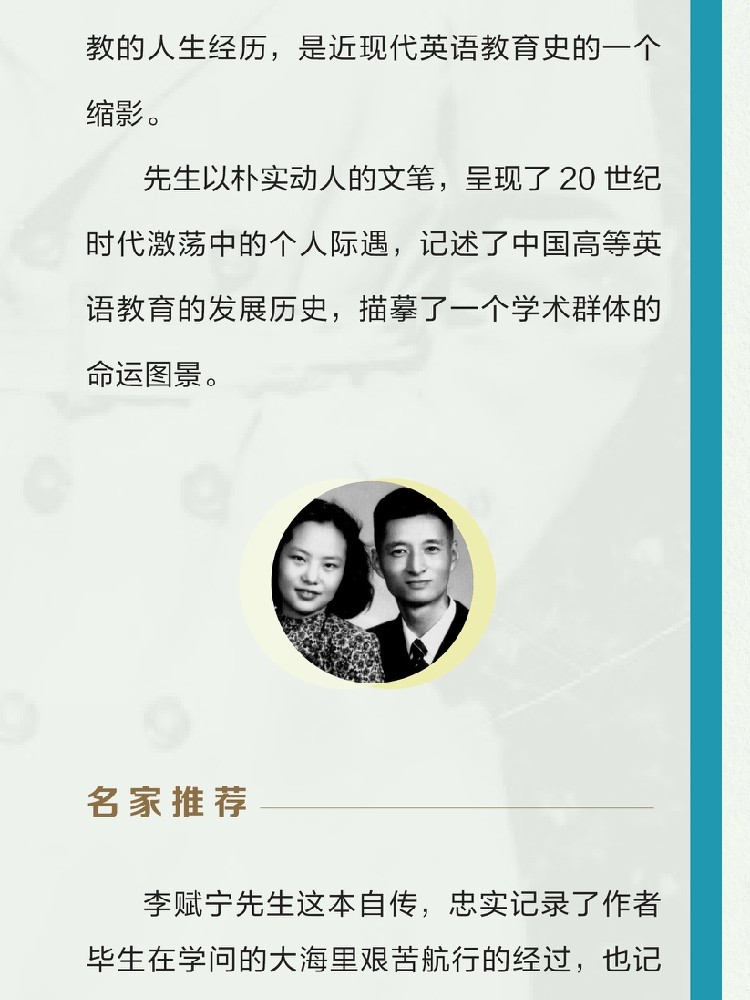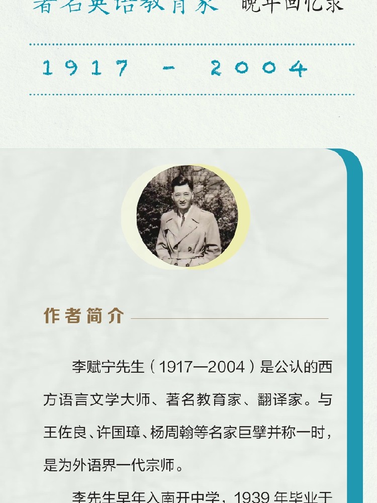 2. 李赋宁先生的人生经历很有代表性,他曾求学并任教于西南联大、清华大学和北京大学,历任北京大学副教务长,西语系、英语系系主任等职。作为历史的亲历者和见证者,他的回忆录为了解20世纪中外高等学府的教育状况,提供了宝贵的一手资料。