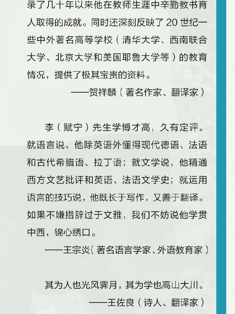 李(赋宁)先生学博才高,久有定评。就语言说,他除英语外懂得现代德语、法语和古代希腊语、拉丁语;就文学说,他精通西方文艺批评和英语、法语文学史;就运用语言的技巧说,他既长于写作,又善于翻译。如果不嫌措辞过于文雅,我们不妨说他学贯中西,锦心绣口。