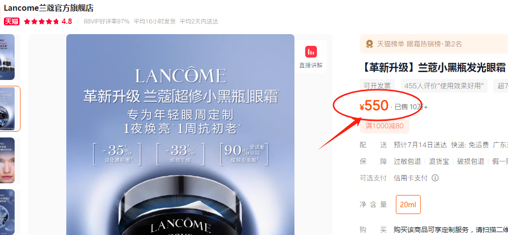 【品名】兰蔻小黑瓶发光眼霜 保湿紧致淡化细纹黑眼圈 15ml