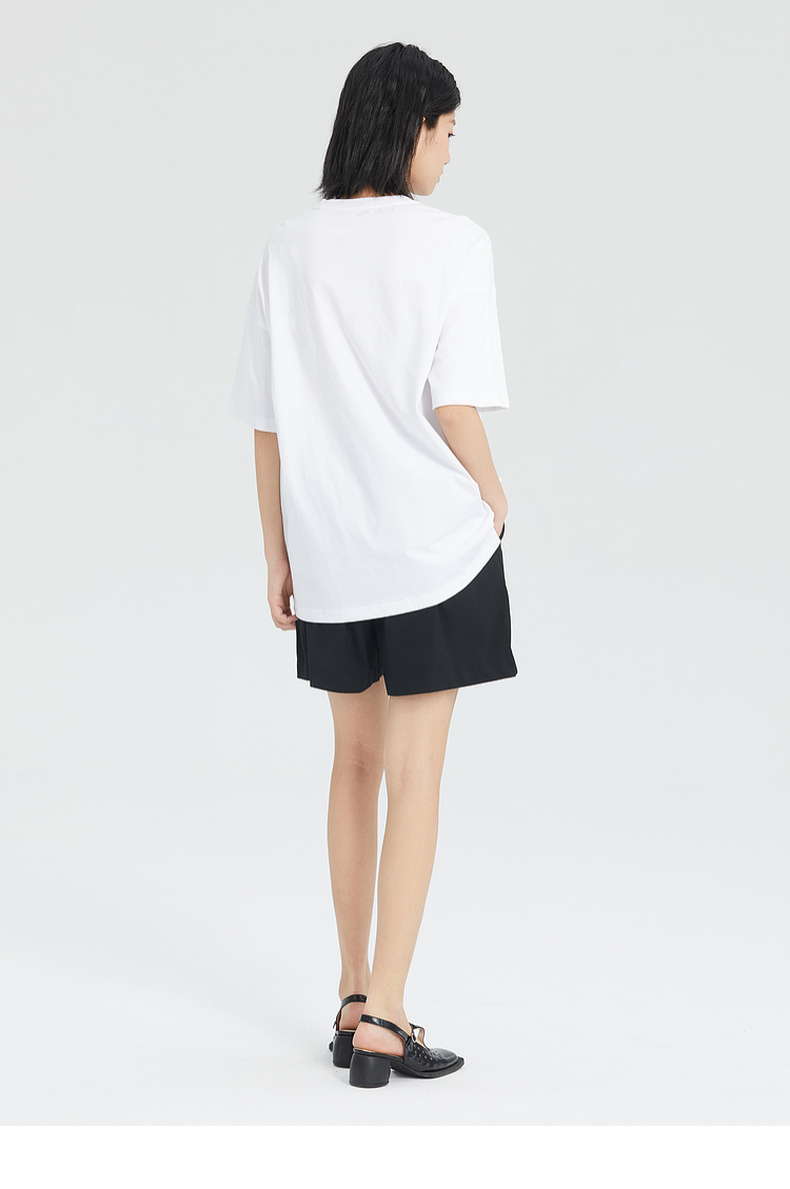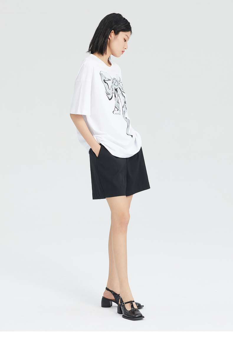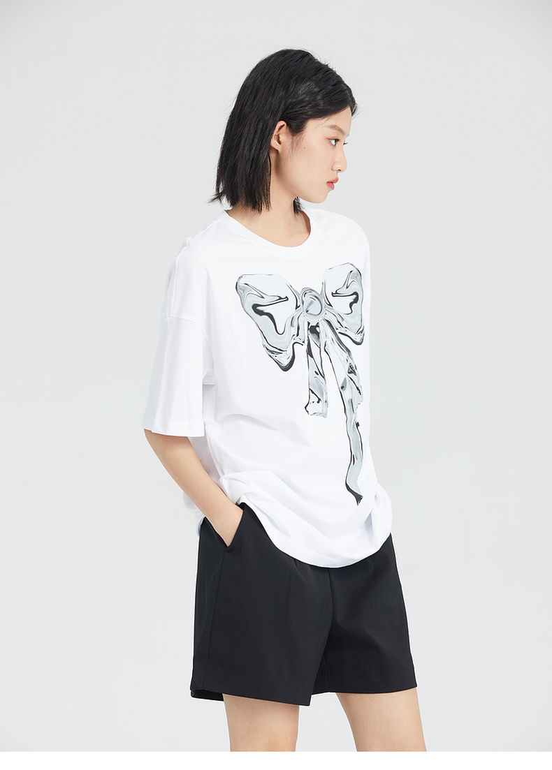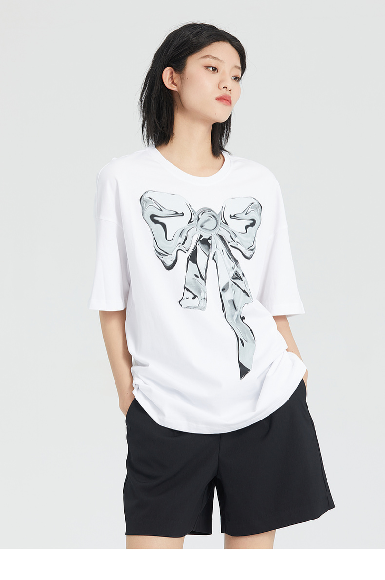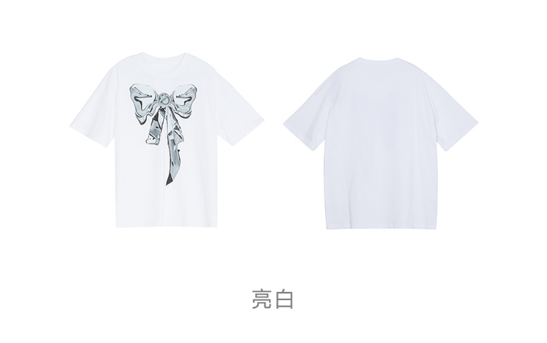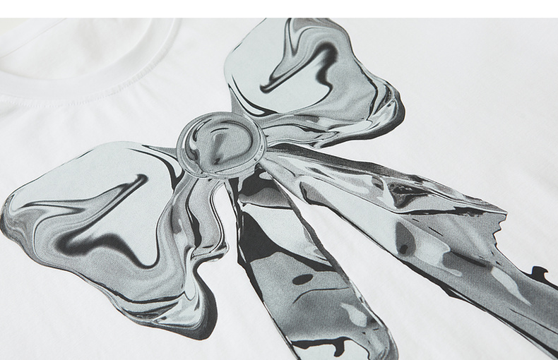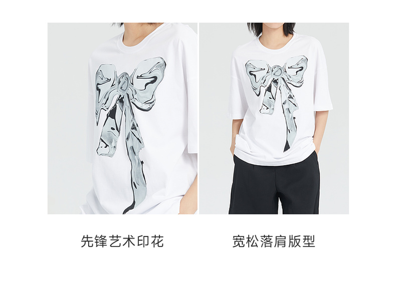 谜底短袖T恤女2023夏新款宽松蝴蝶结印花中长款圆领上衣236MT7074