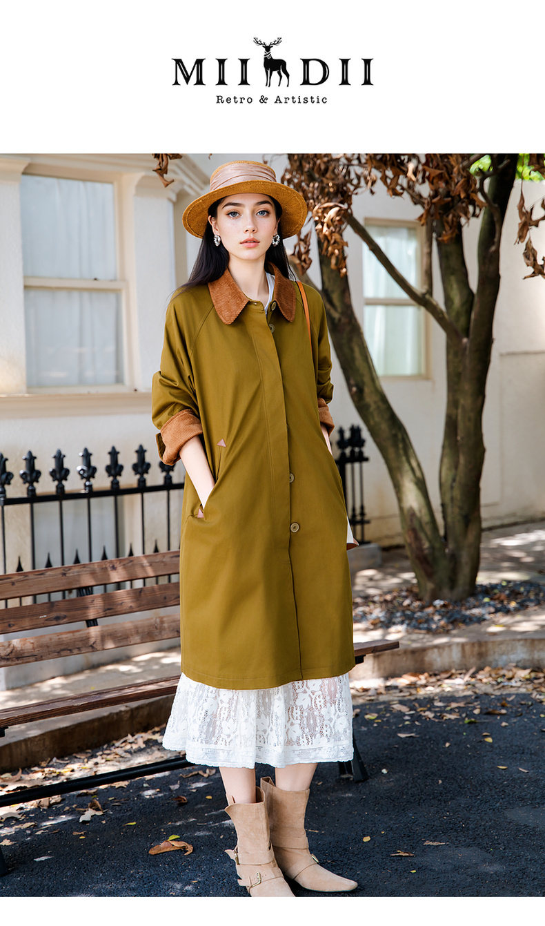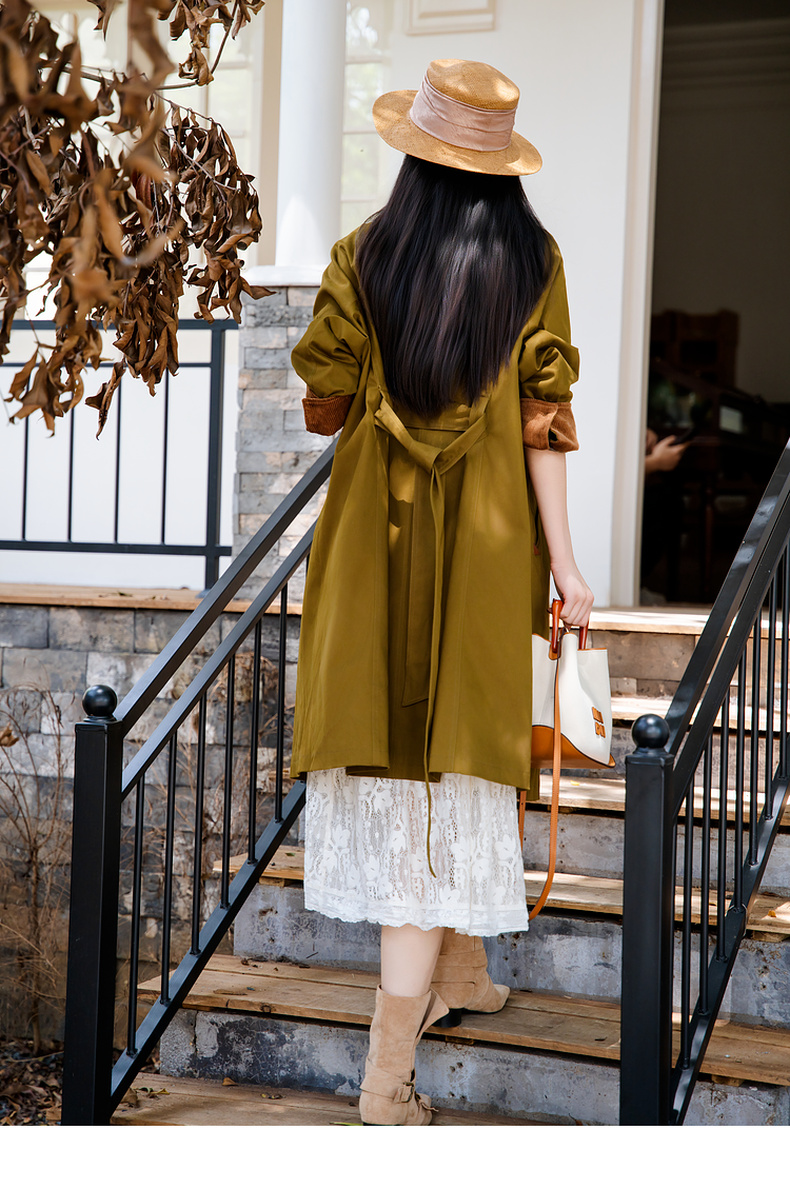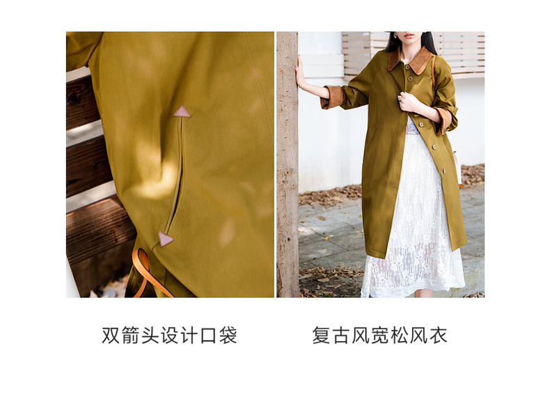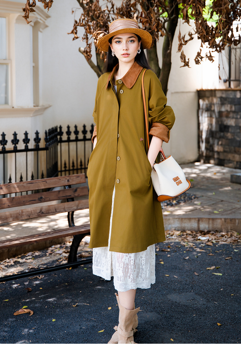 谜底大廓形风衣女士2025秋新款通勤简约领口拼接长外套25CME5007