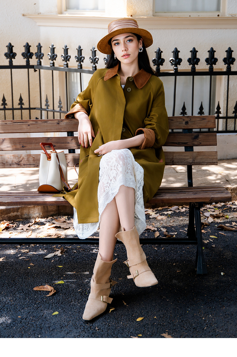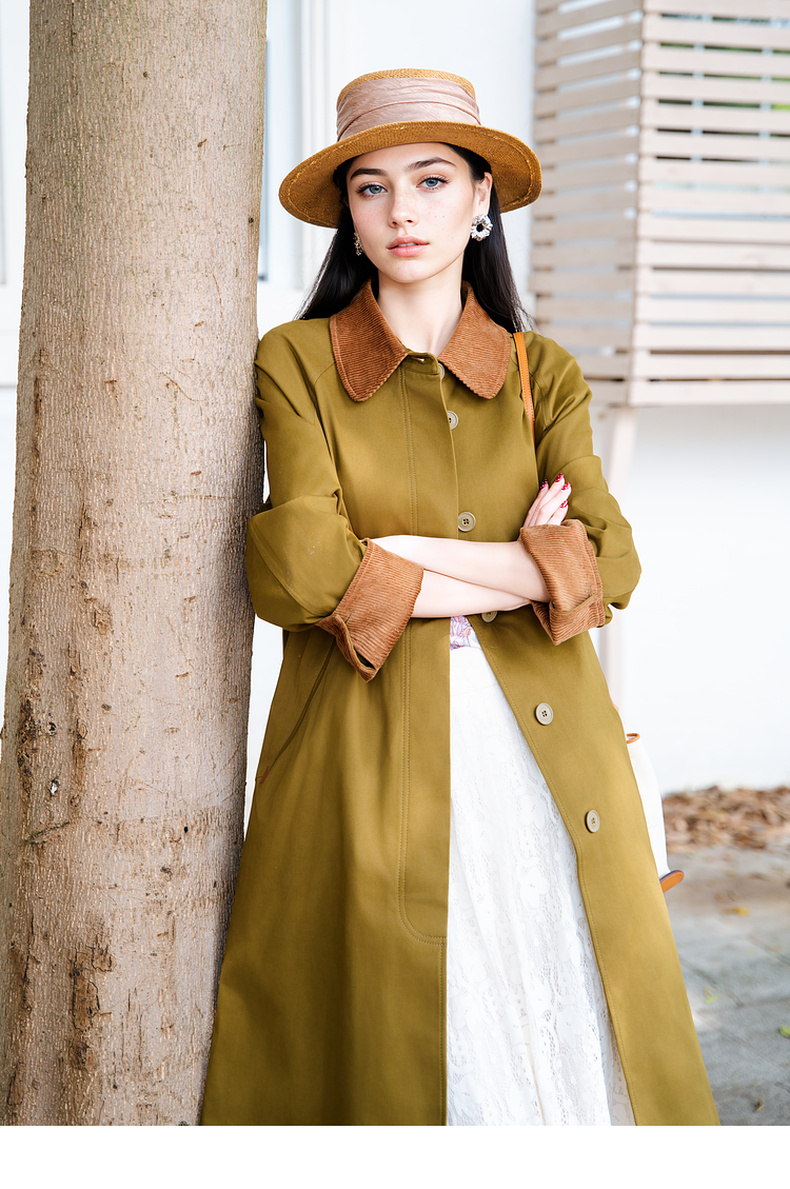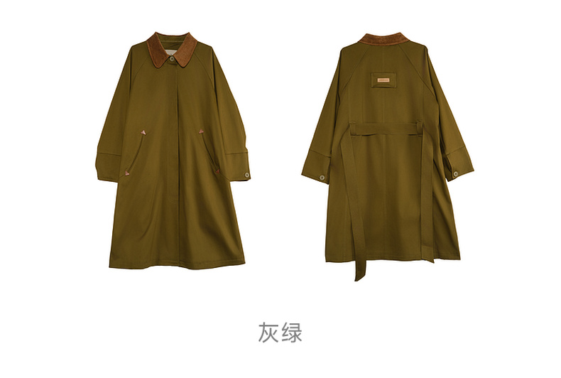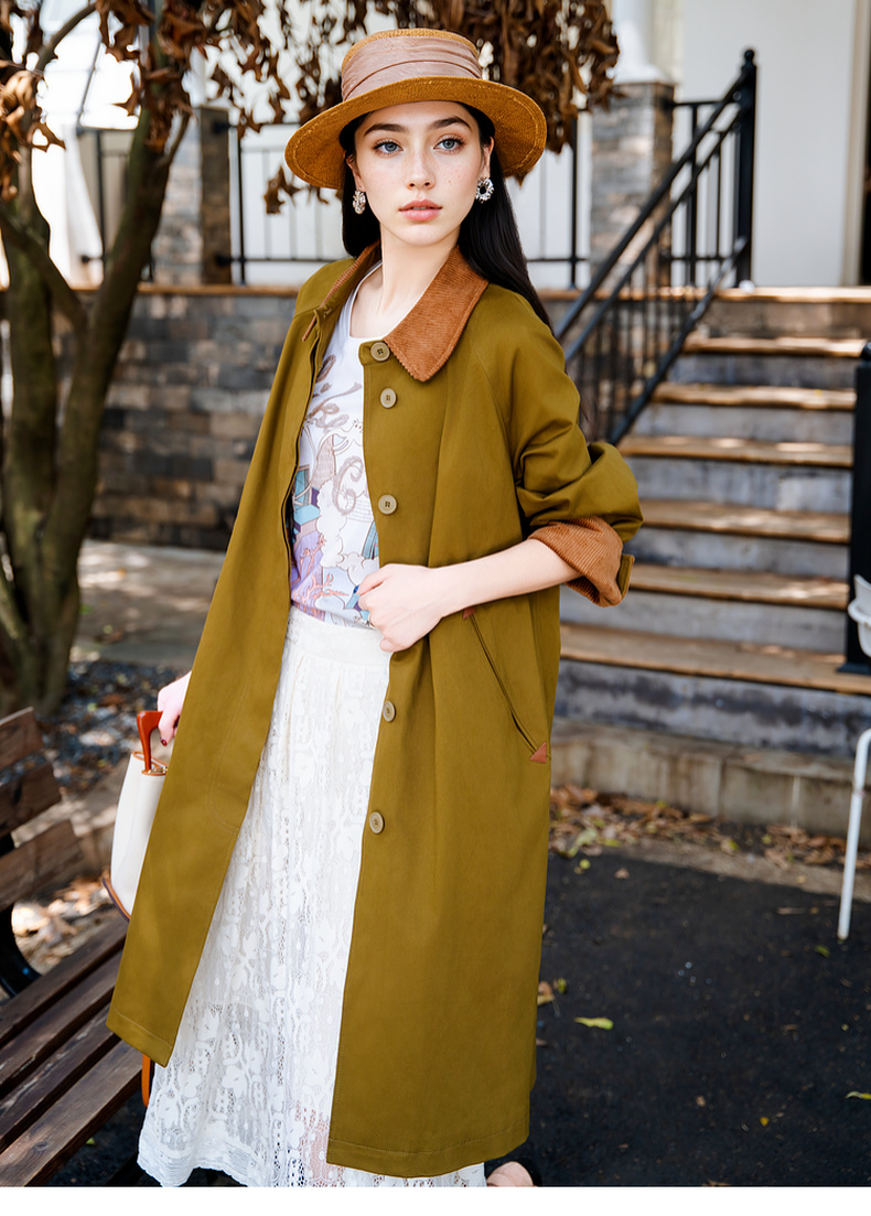 谜底大廓形风衣女士2025秋新款通勤简约领口拼接长外套25CME5007