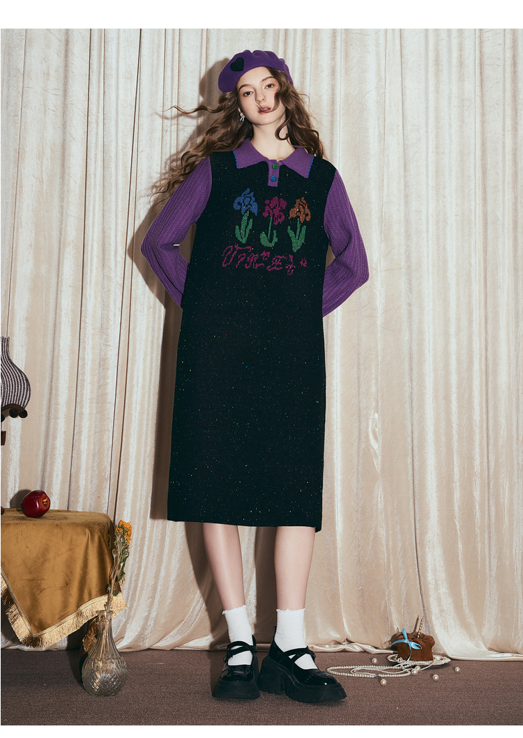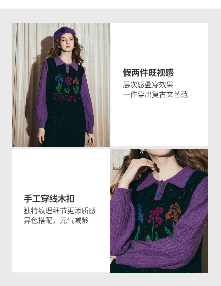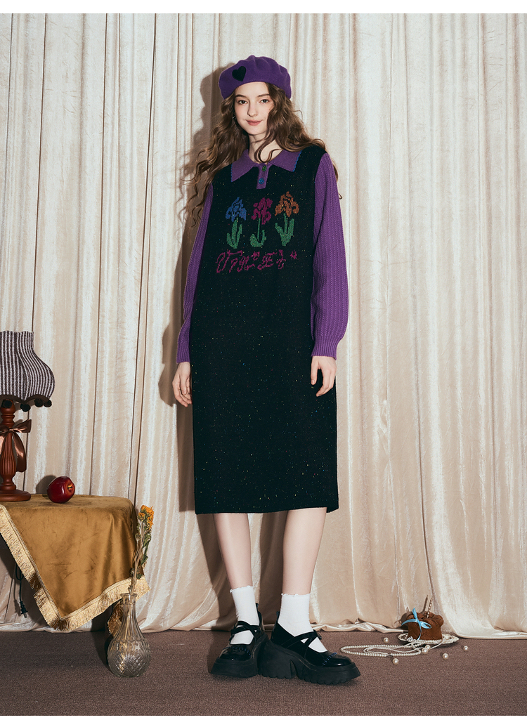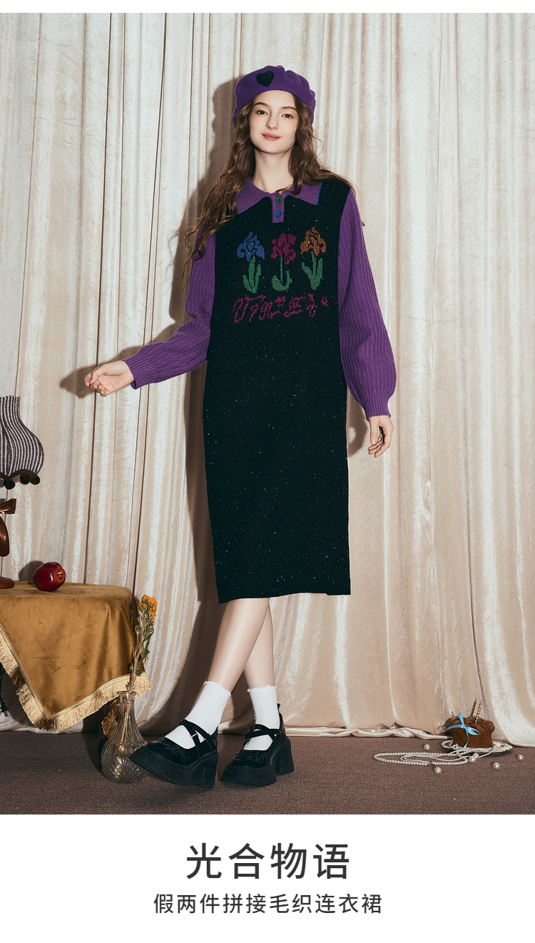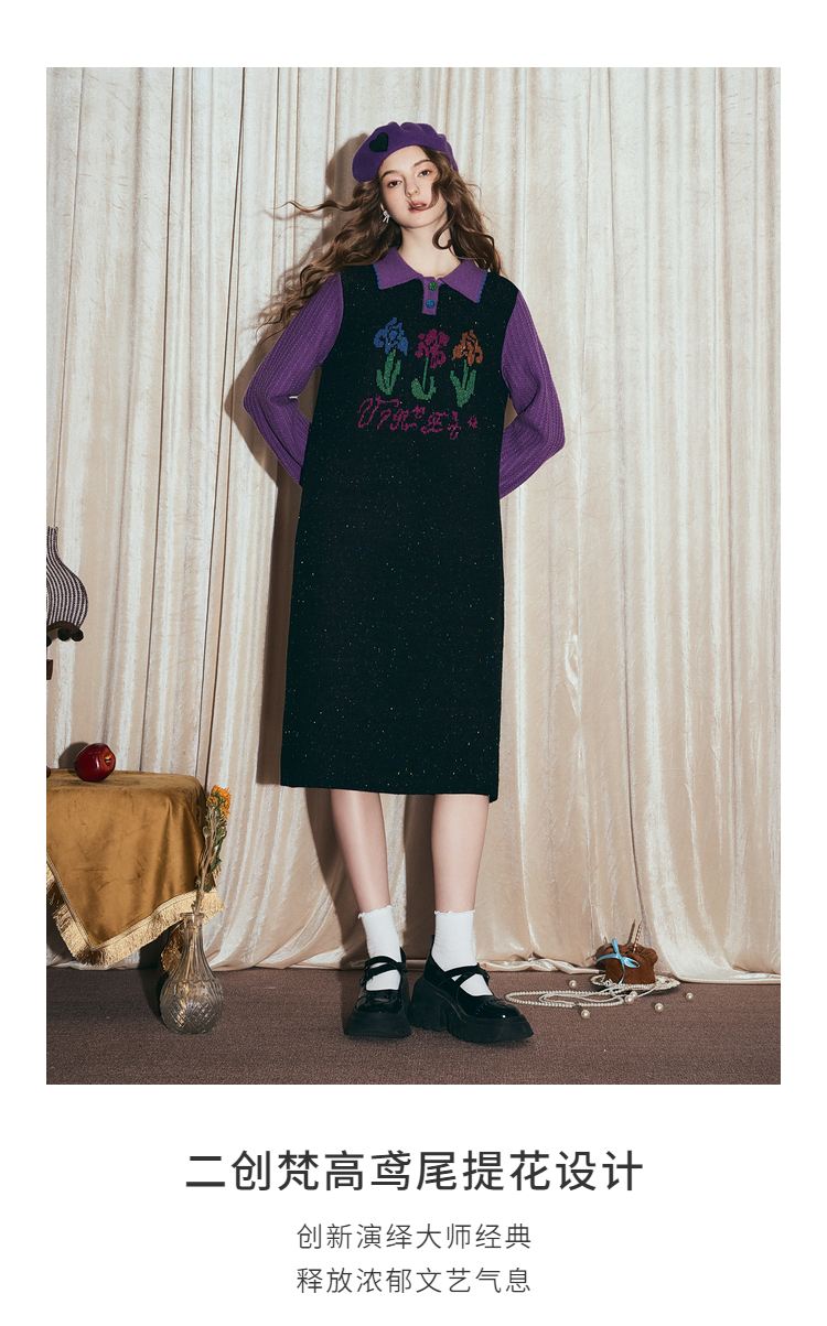 两三事梵高文艺光合物语2025冬新款鸢尾花拼色假两件毛衣裙连衣裙