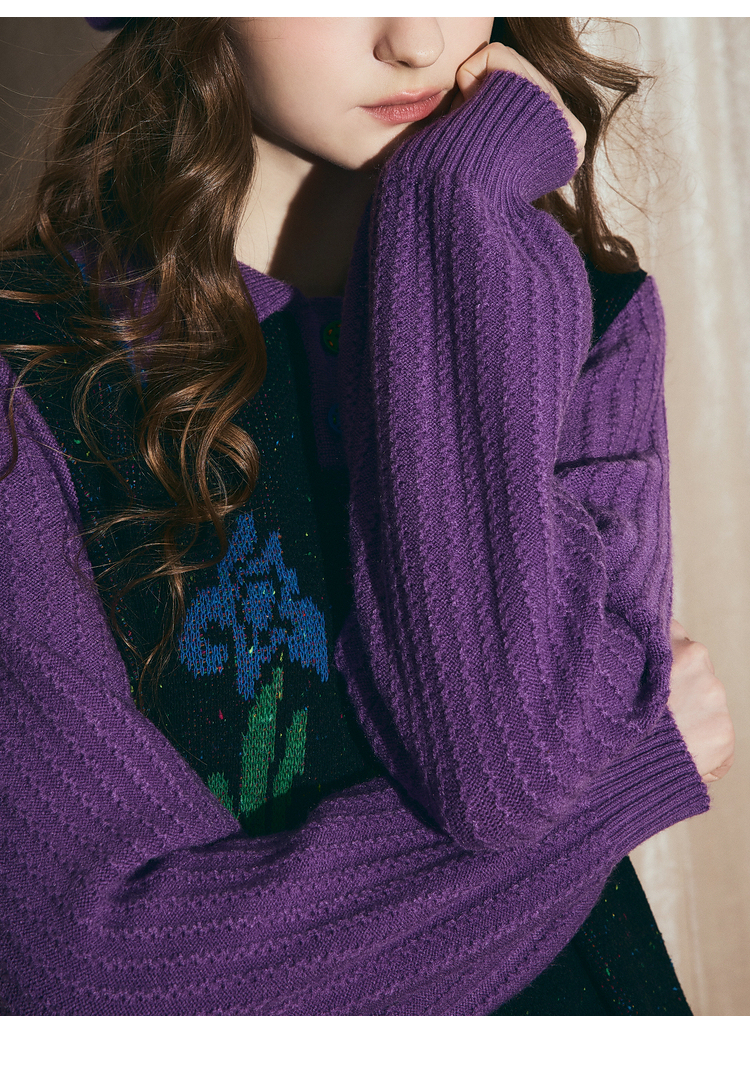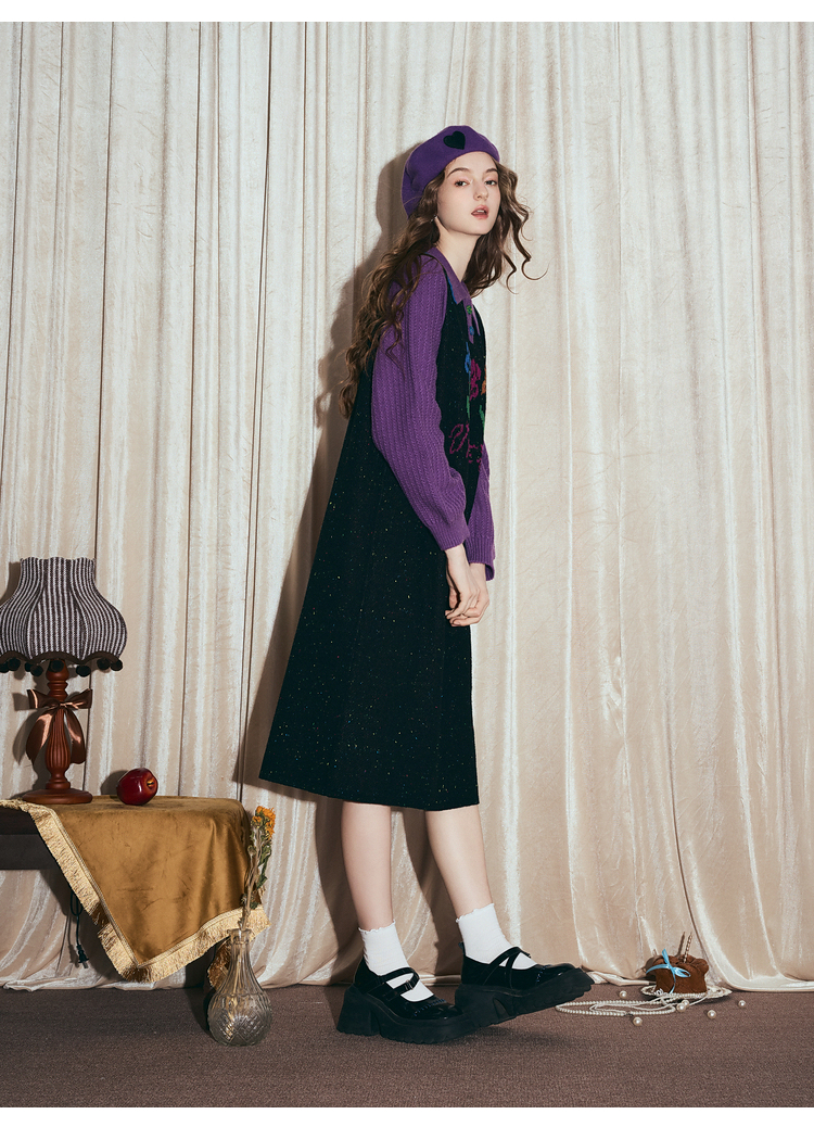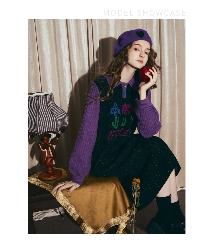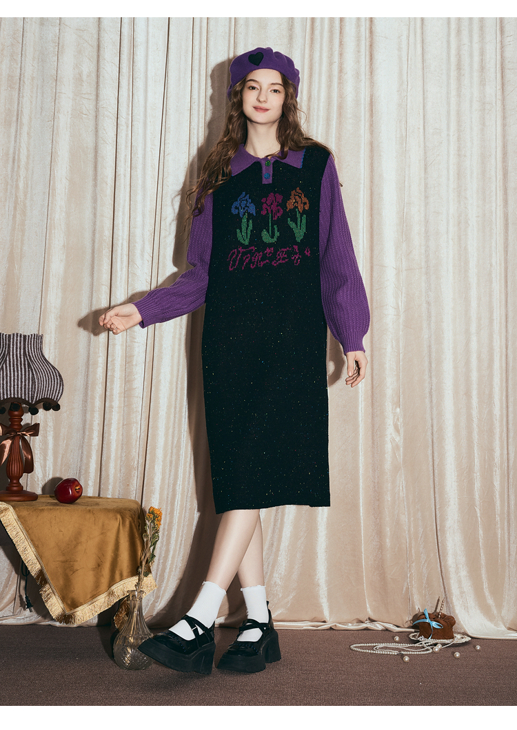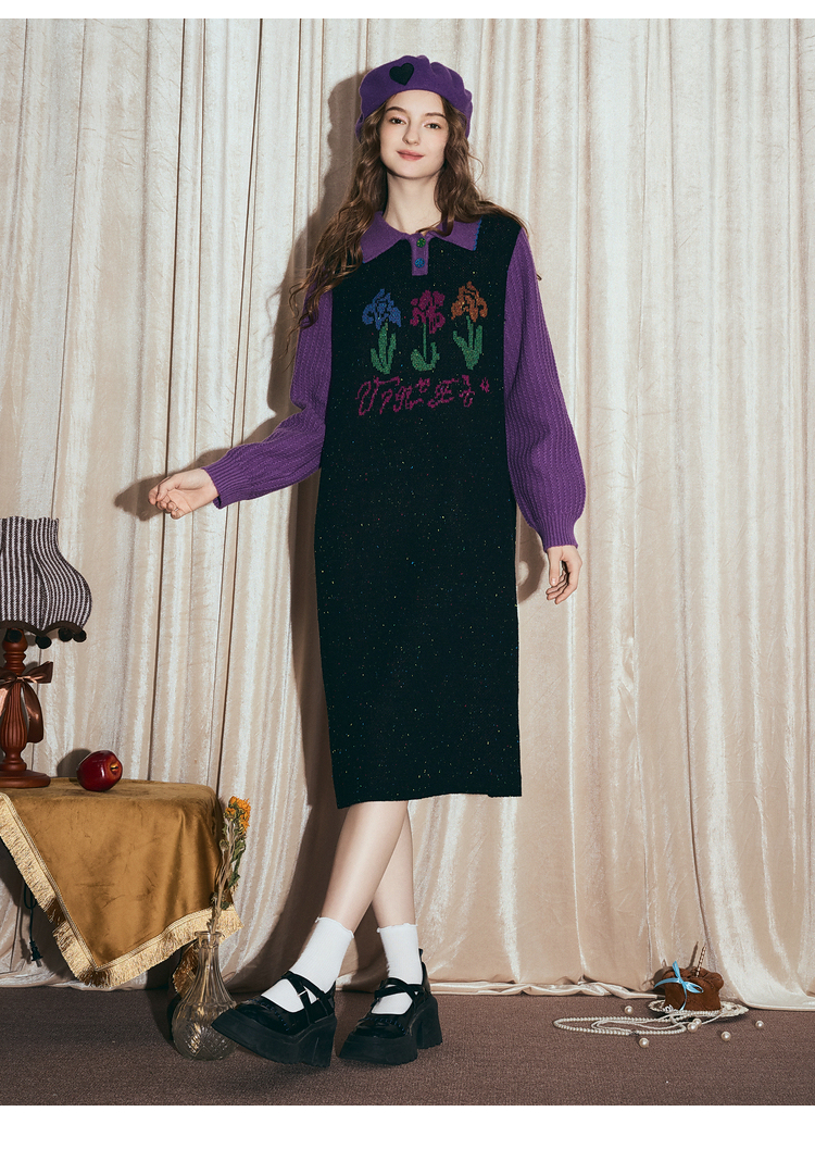 两三事梵高文艺光合物语2025冬新款鸢尾花拼色假两件毛衣裙连衣裙