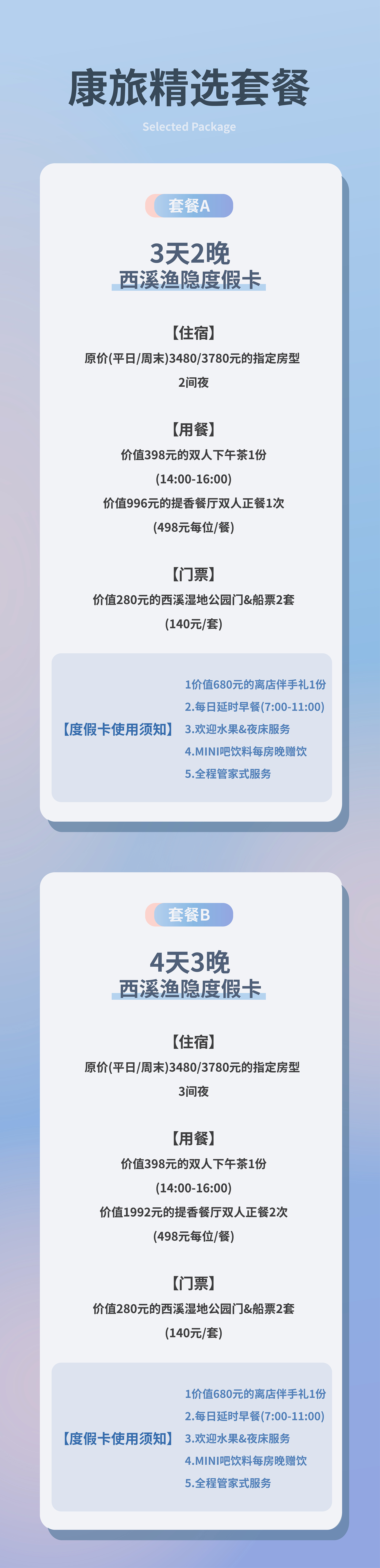 所见•西溪度假卡的产品,限2位成人入住使用,景点门票包含2张;当您在实际度假行程中超出产品规定人数时,所有景点门票需按价另外收取费用。