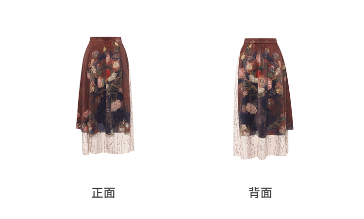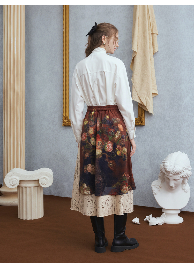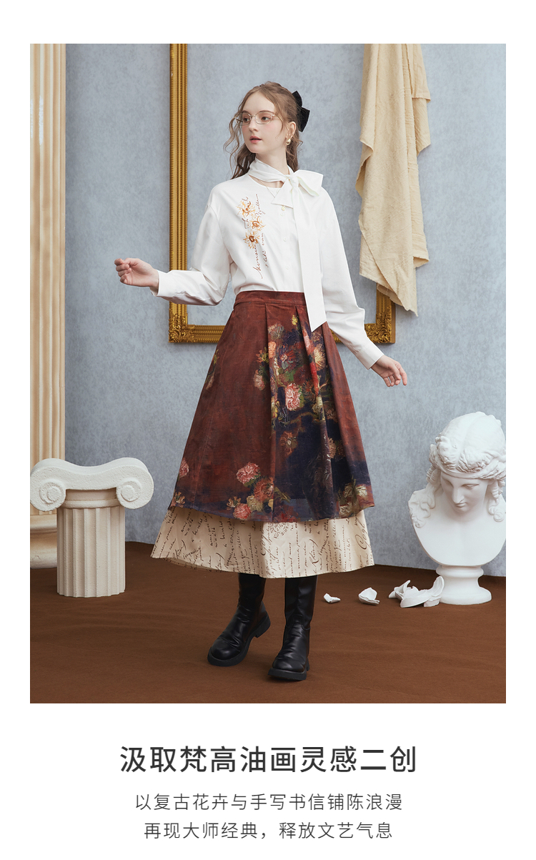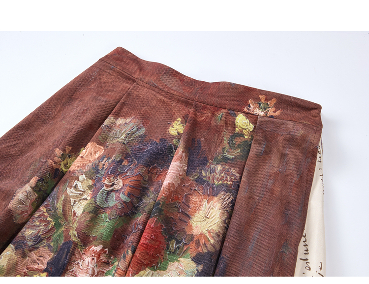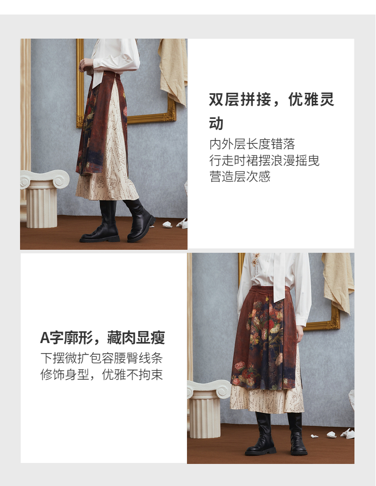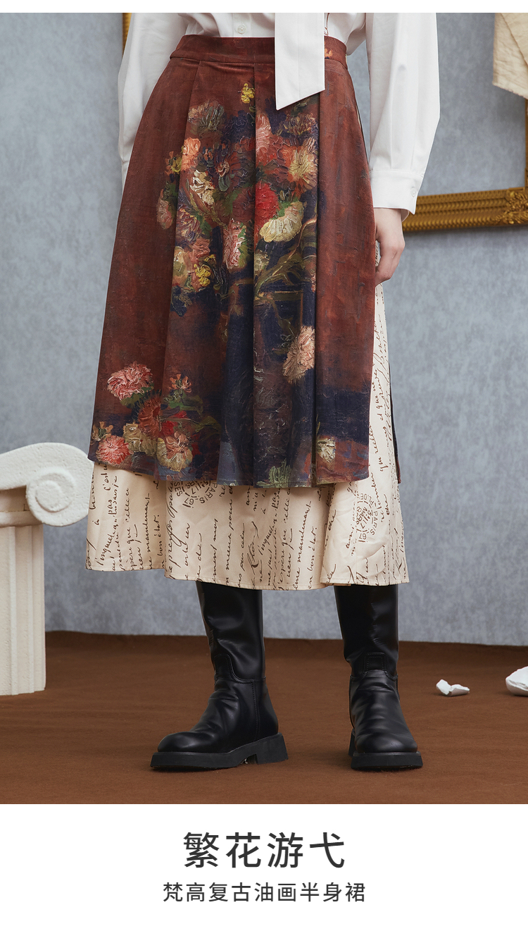 两三事梵高文艺 繁花游弋 2025冬季新款印花双层裙摆半身裙