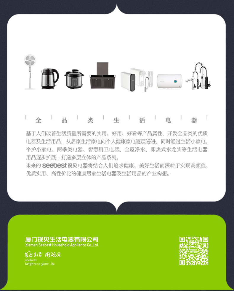 厦门视贝科技有限公司是集产品自主设计,研发,生产,销售于一体的高科技企业。拥有80000平方米的制造厂房,核心员工2000多人。产品线涵盖照明、电工,卫浴,线路,集成风暖等领域。
