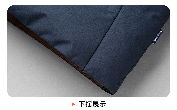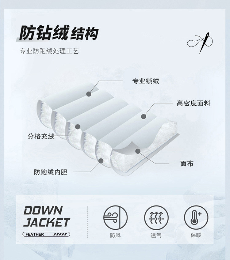 面料上层:100%聚酯纤维 下层:100%聚酯纤维 (非物质纤维除外);里料:100%聚酯纤维 胆料:100%聚酯纤维 相拼料上层:100%聚酯纤维 下层:100%聚酯纤维 (非物质纤维除外) 填充物:白鸭绒(绒子含量90%) 其他填充物:100%聚酯纤维