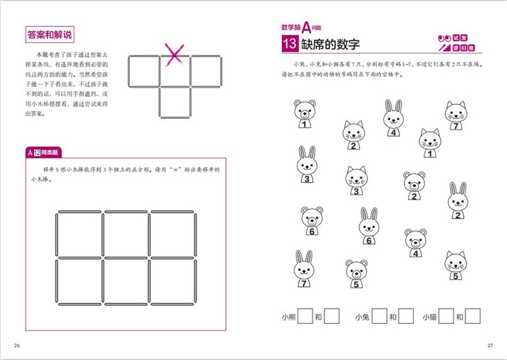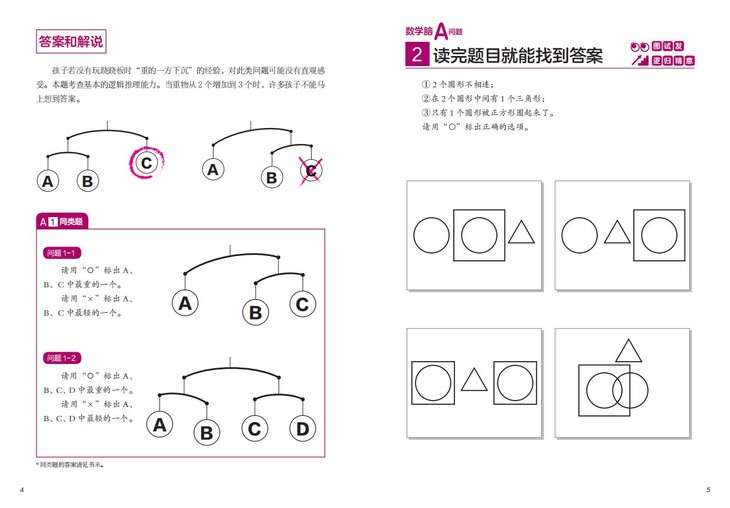 遵循由易到难的原则,设有A级问题和B级问题,在题目翻页后搭配了详细的图解;每种题型后面还设置了相似的问题,培养数学思维能力,让孩子快乐学数学!