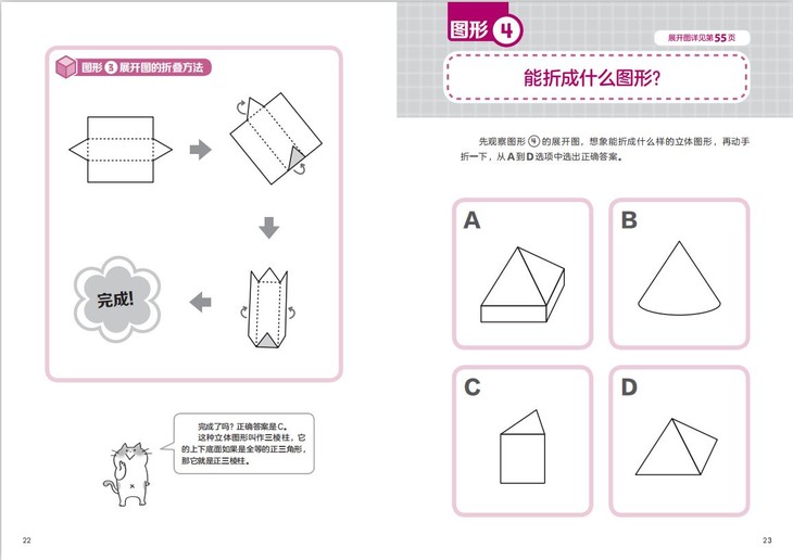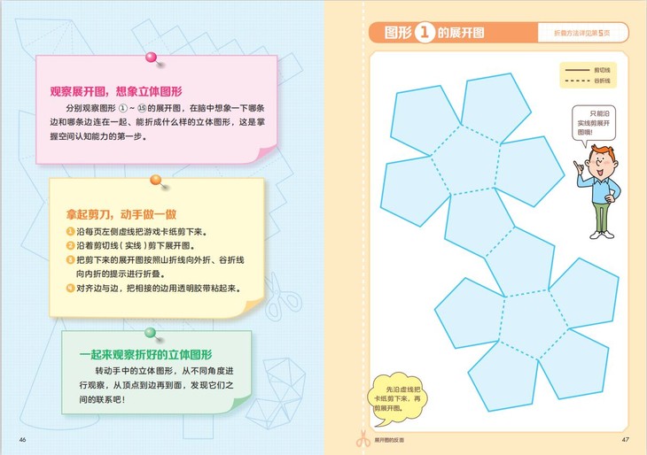 孩子在解答立体图形问题时,需要在脑中想象立体图形,改变观察视角,或者转动立体图形,培养空间认知能力。本书的正文部分为思考展开图,讲述了展开图的折叠方法和立体图形的知识;书后附有13张游戏卡纸,让孩子体验把展开图折叠成立体图形的乐趣。期待孩子通过折纸游戏,不知不觉地锻炼空间认知能力,爱上学数学。