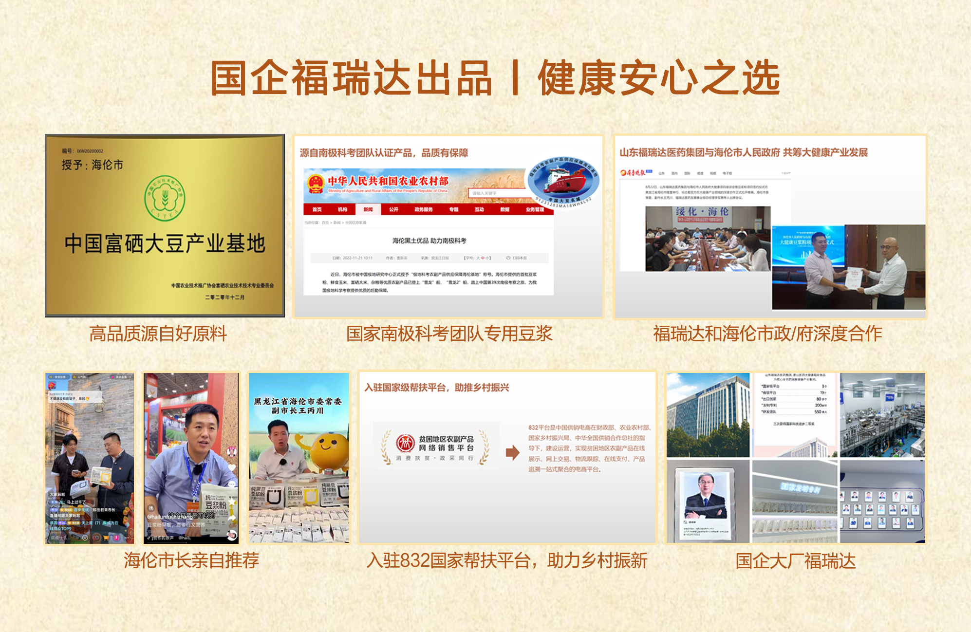 福瑞达豆浆,甄选黑龙江海伦市的寒地黑土生长的大豆,更天然!更营养!更安全