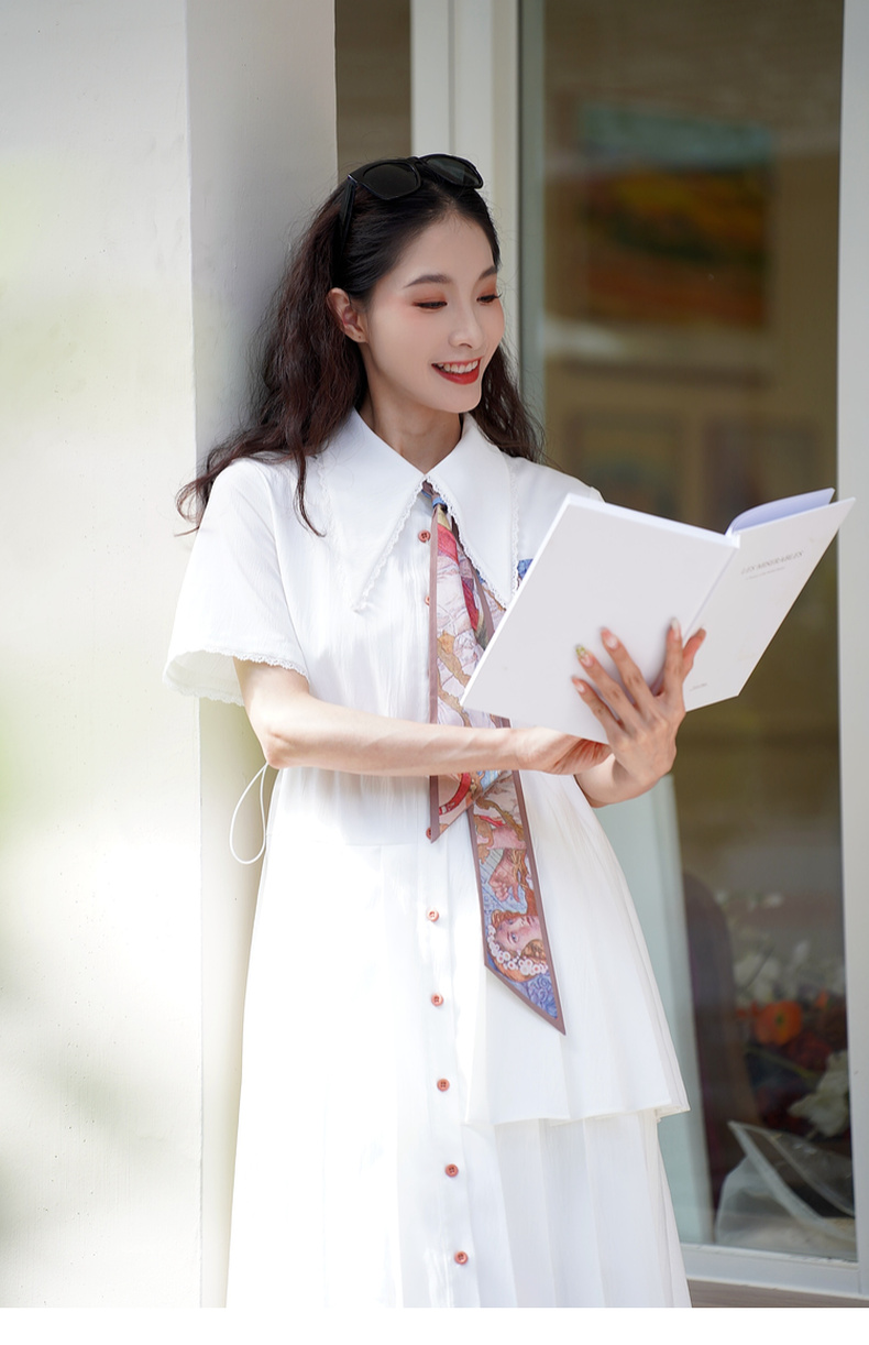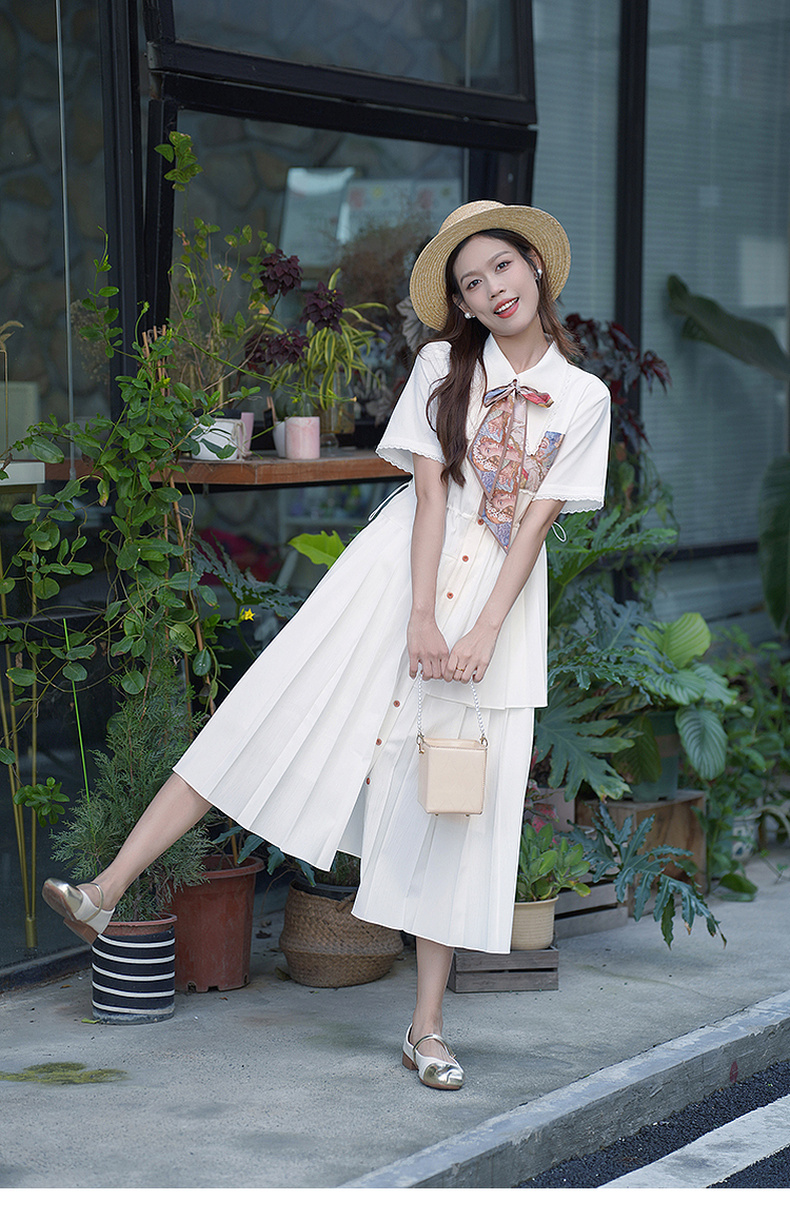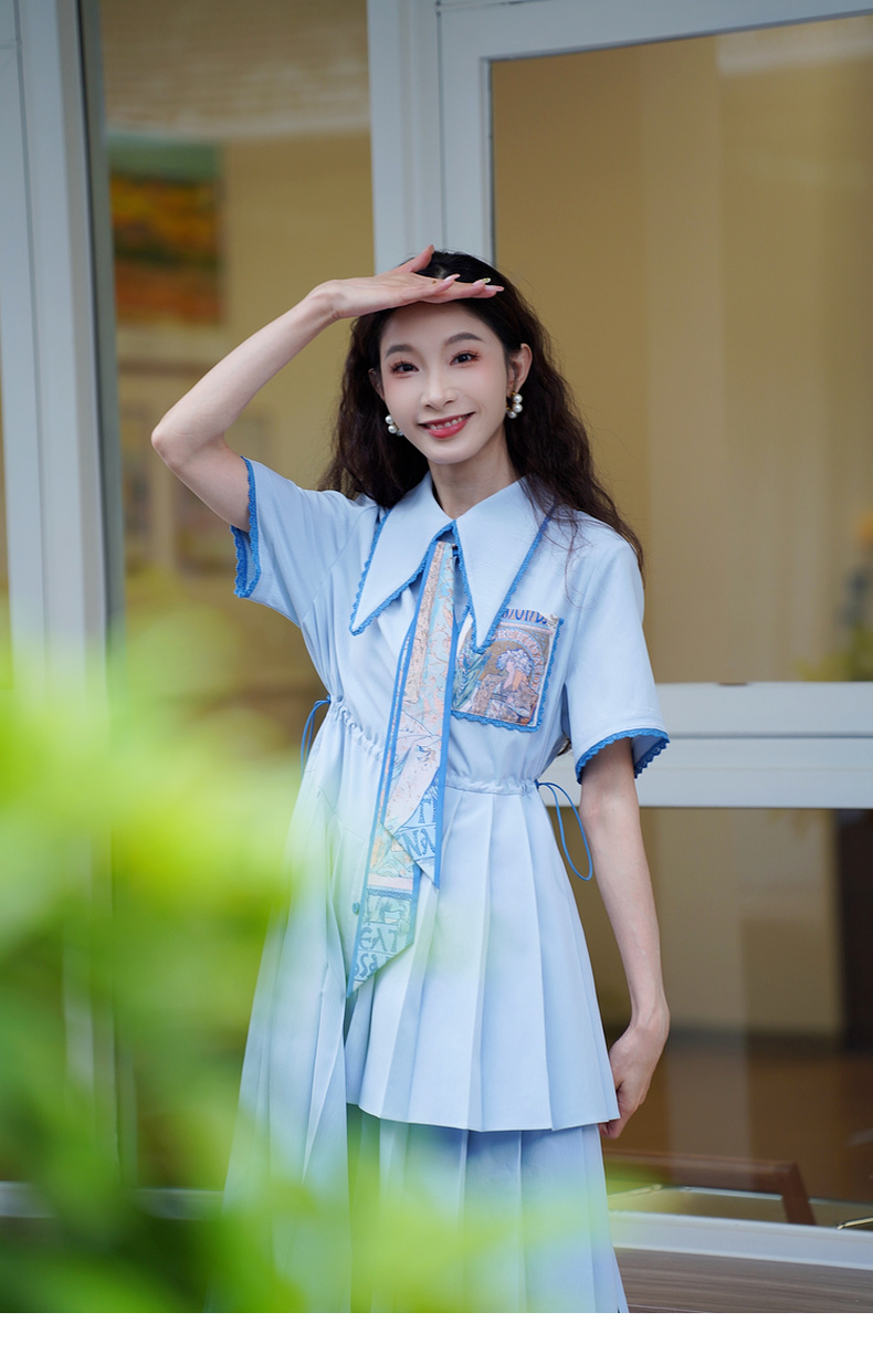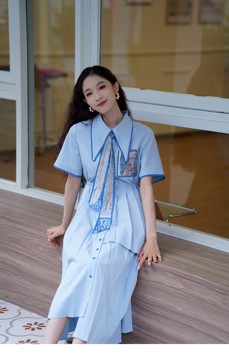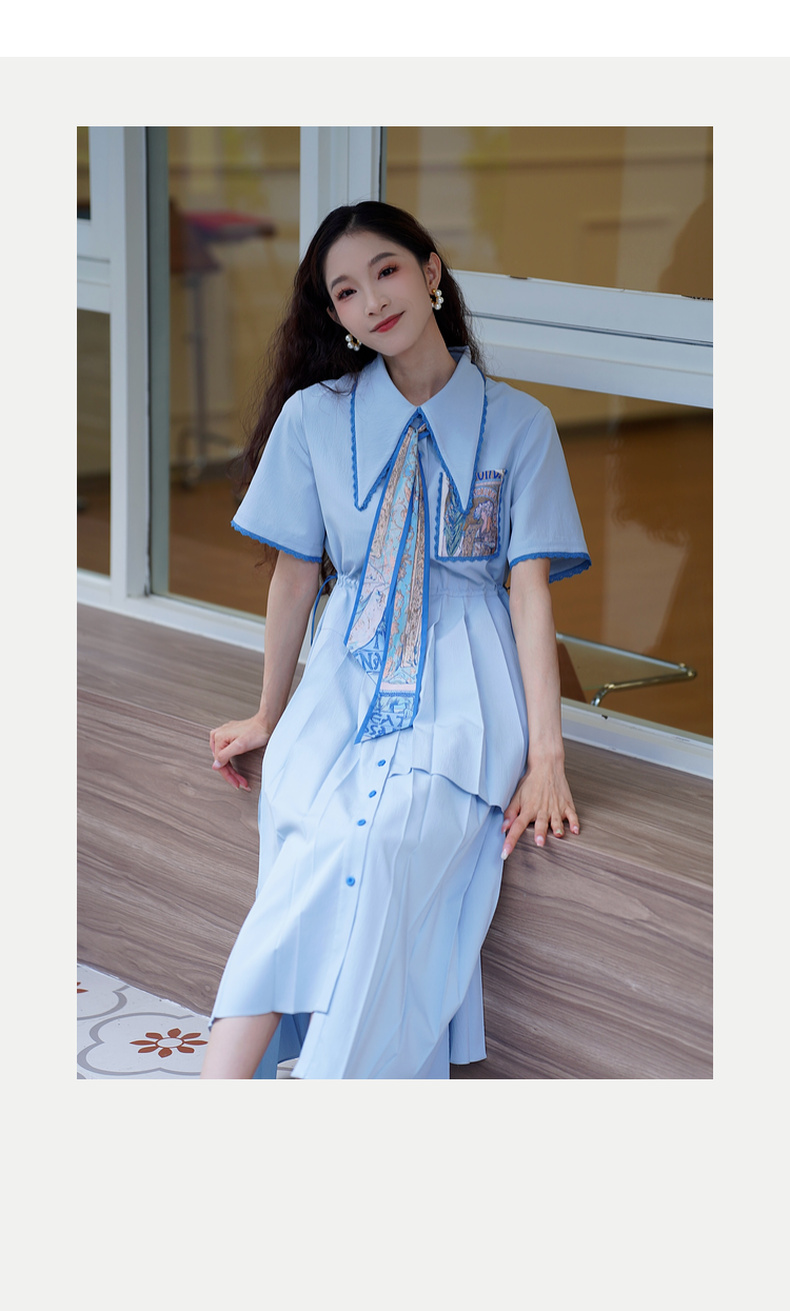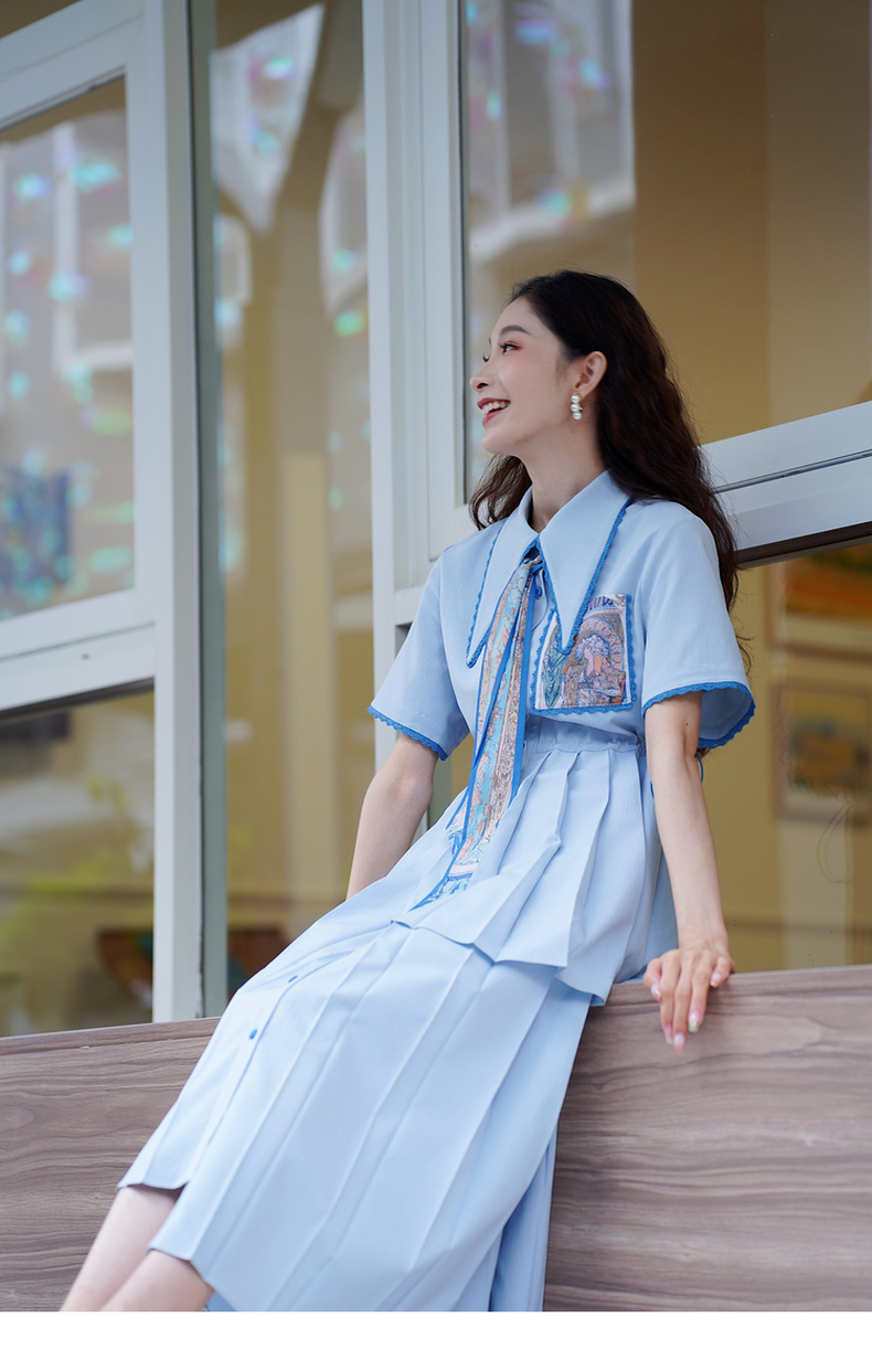 两三事 倾心学院 2024夏季新款小清新印花领带压褶下摆连衣裙