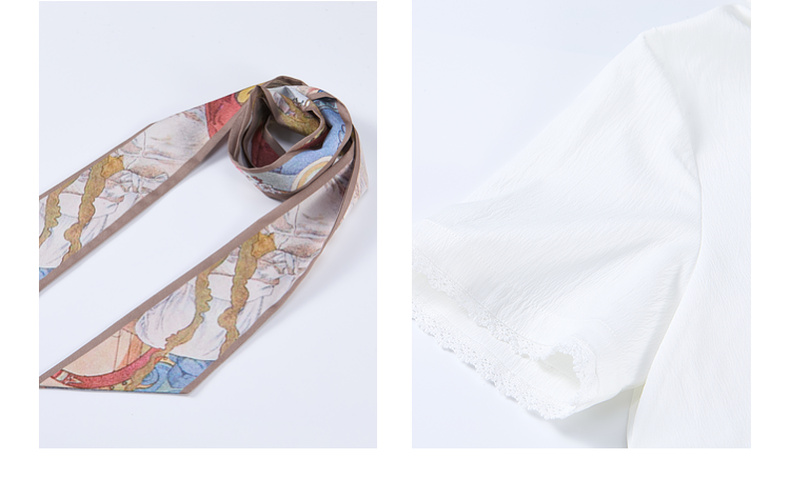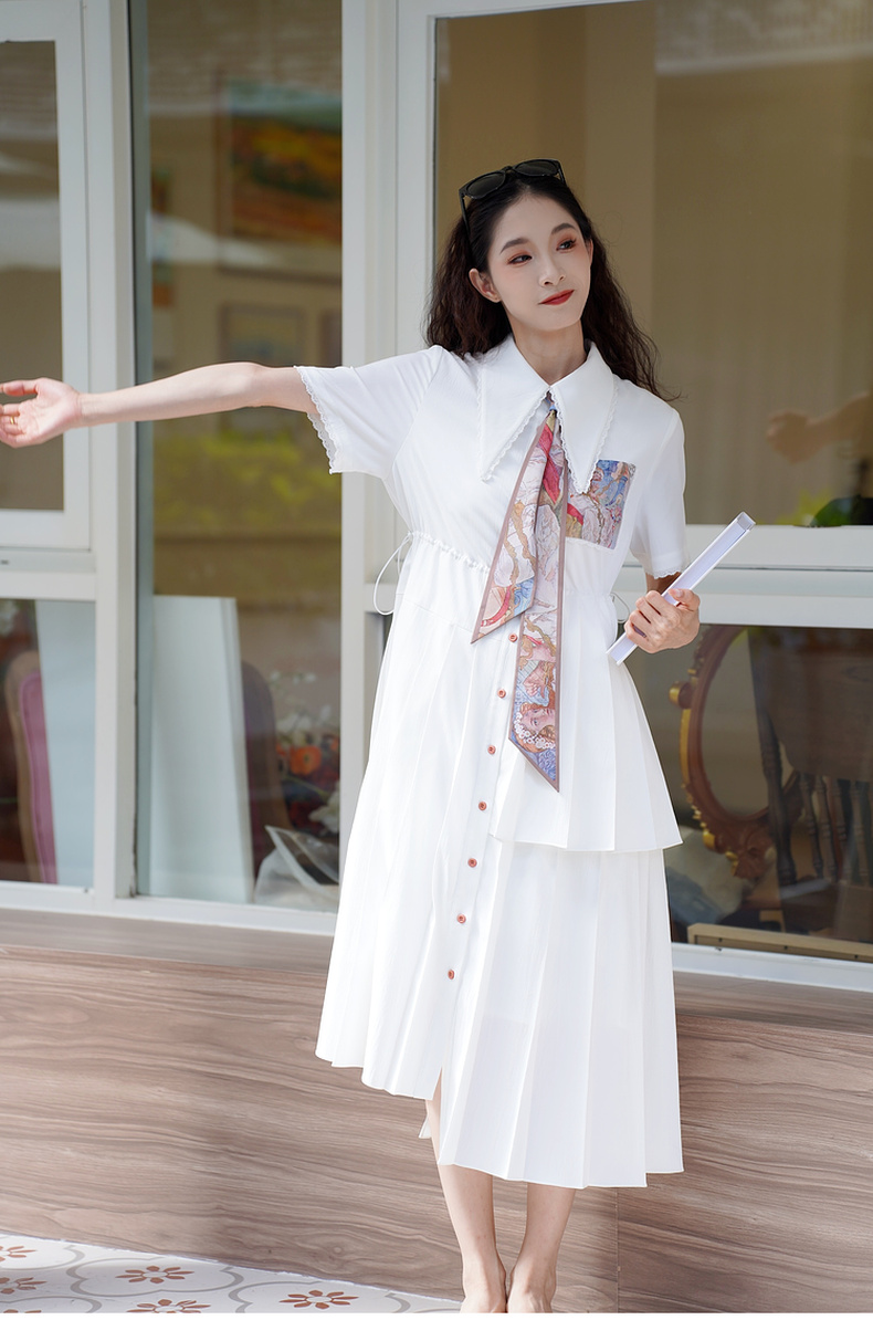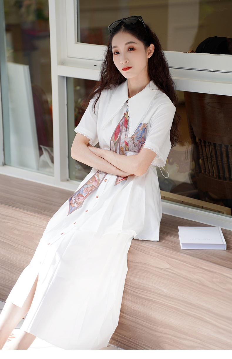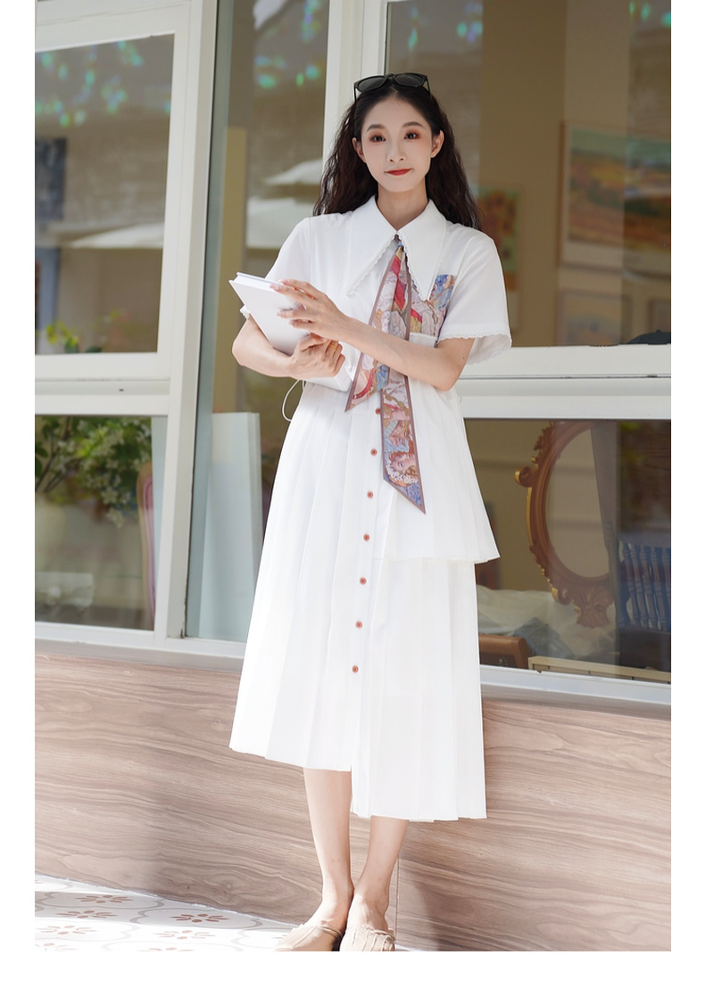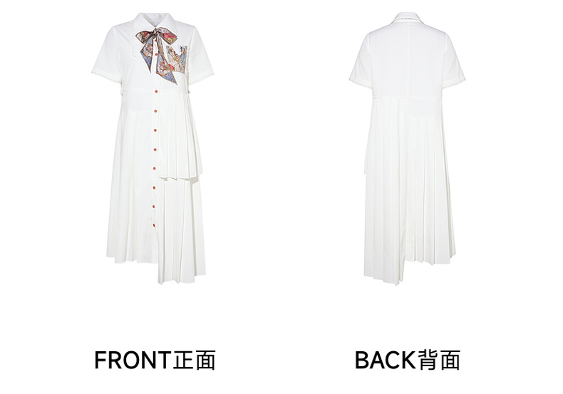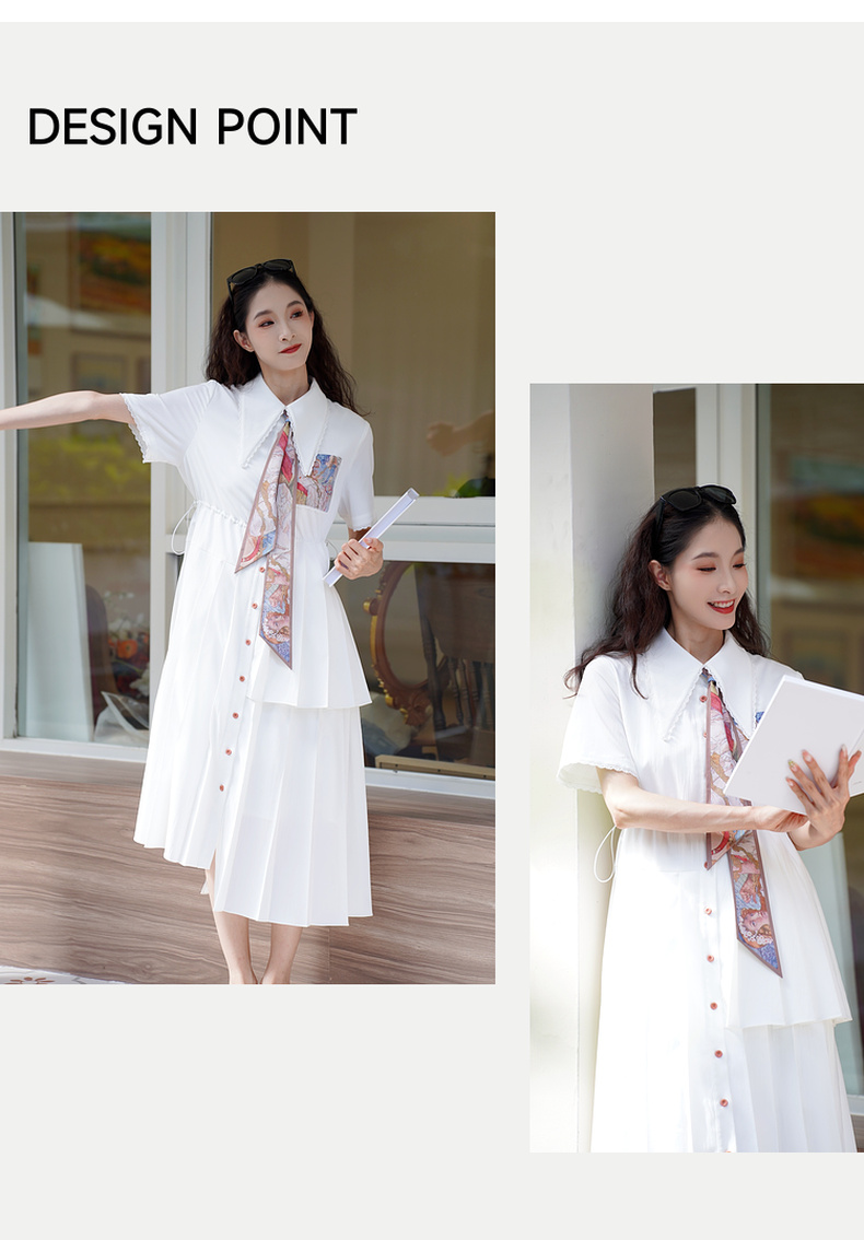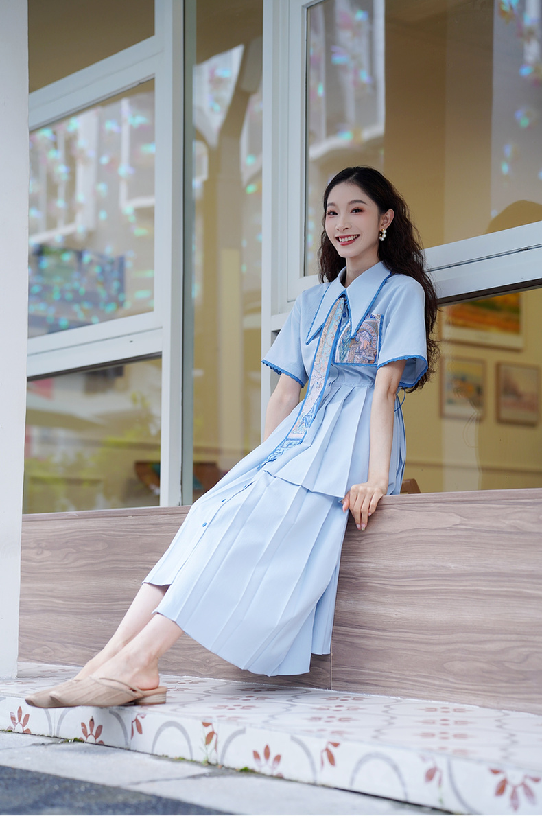 两三事 倾心学院 2024夏季新款小清新印花领带压褶下摆连衣裙