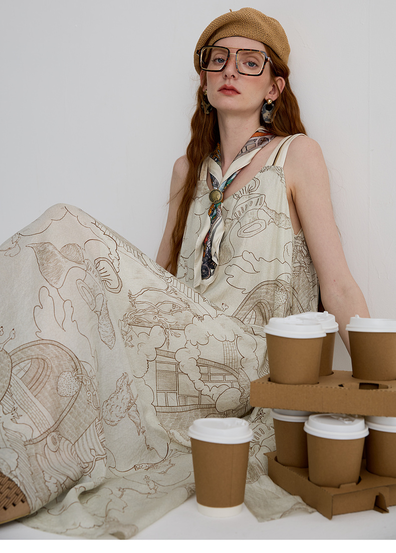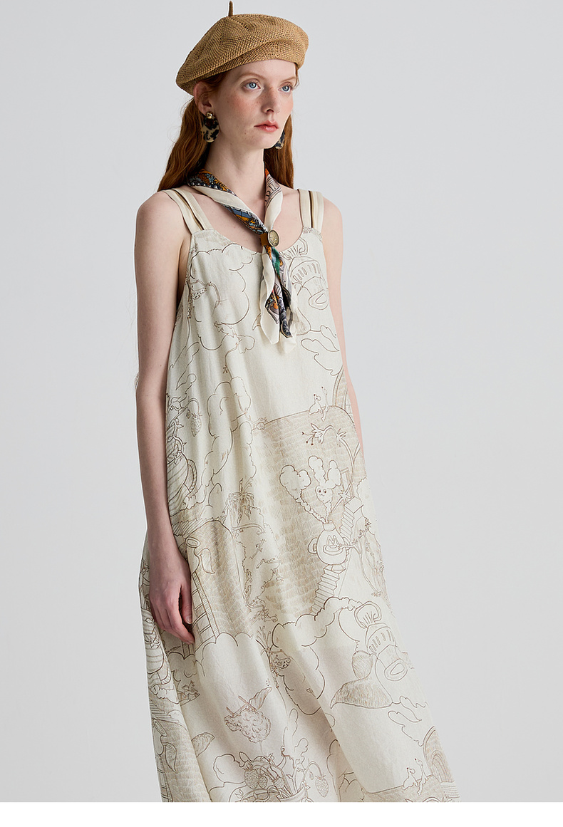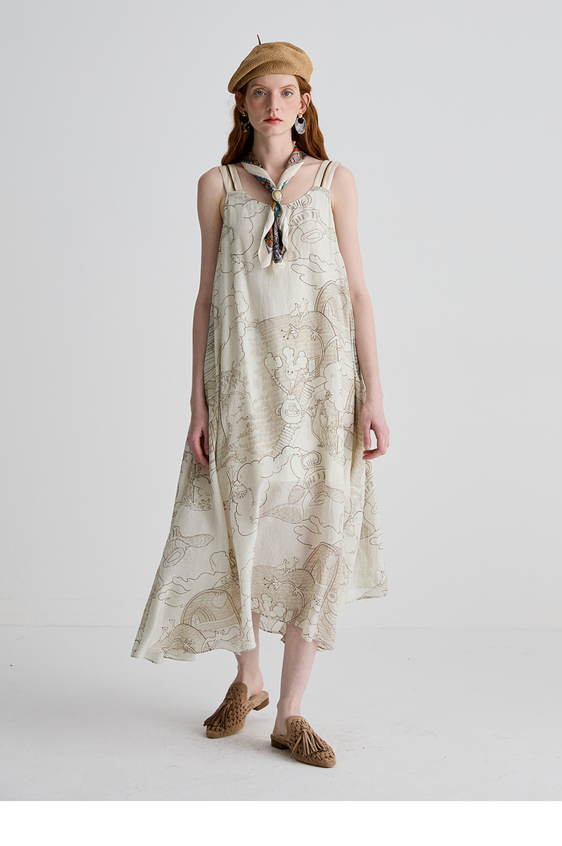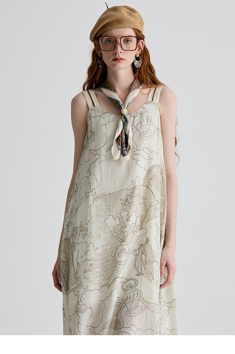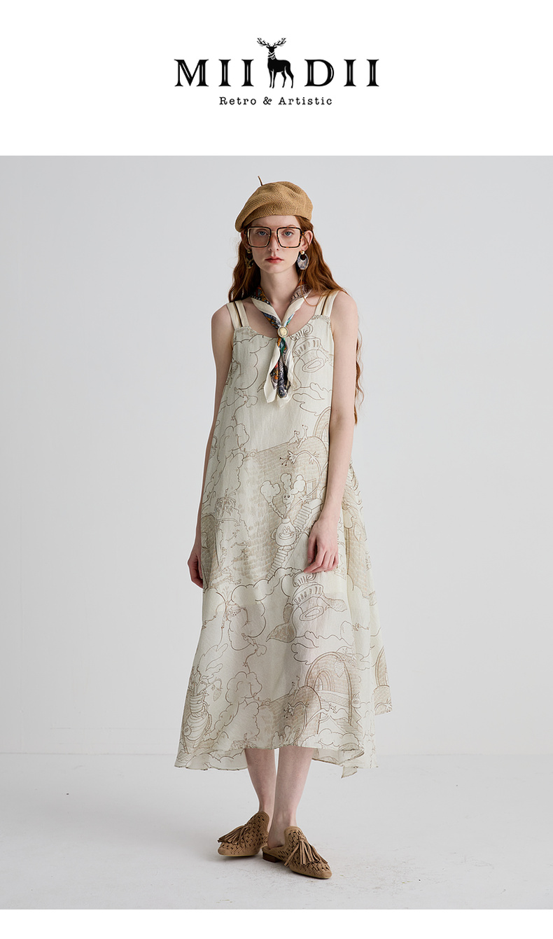 谜底连衣裙无袖女2025夏新品复古风度假真丝宽松A型长裙252GL0675