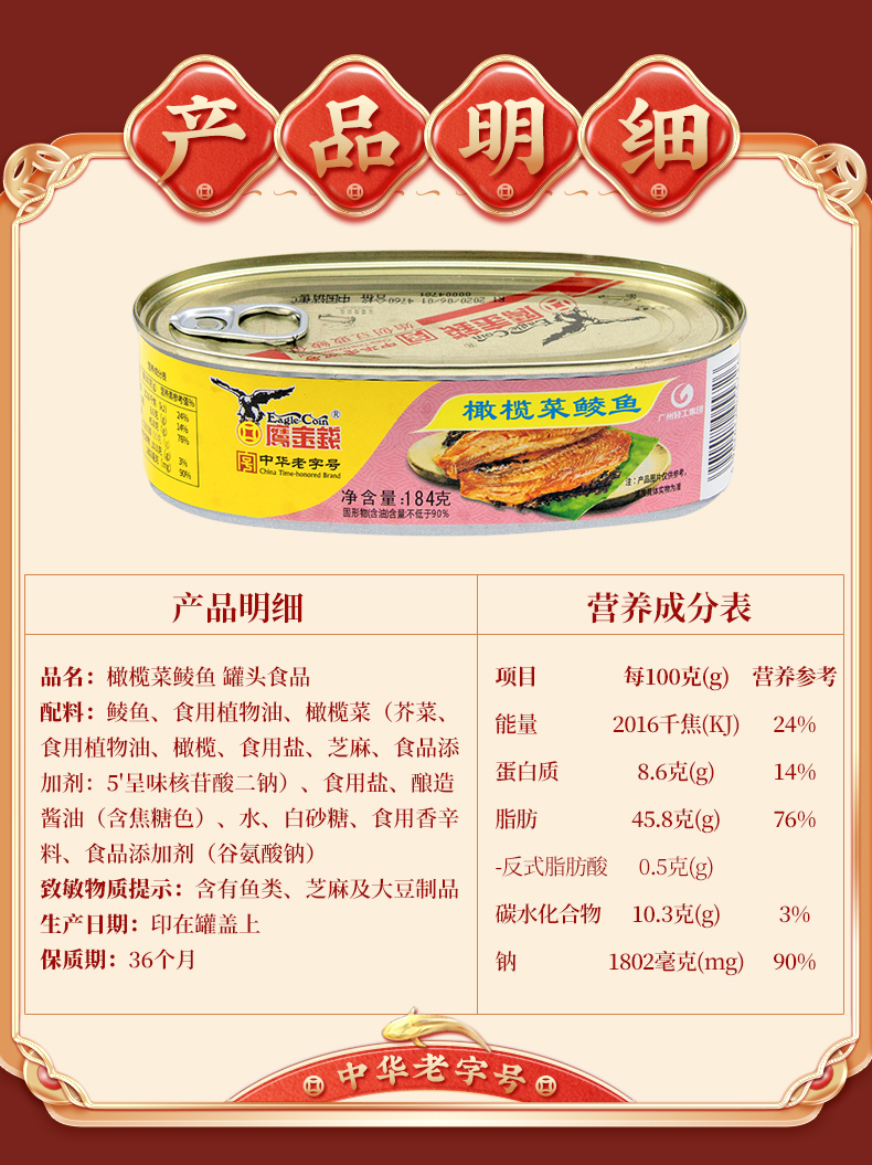 鹰金钱牌拉盖橄榄菜鲮鱼(TY)