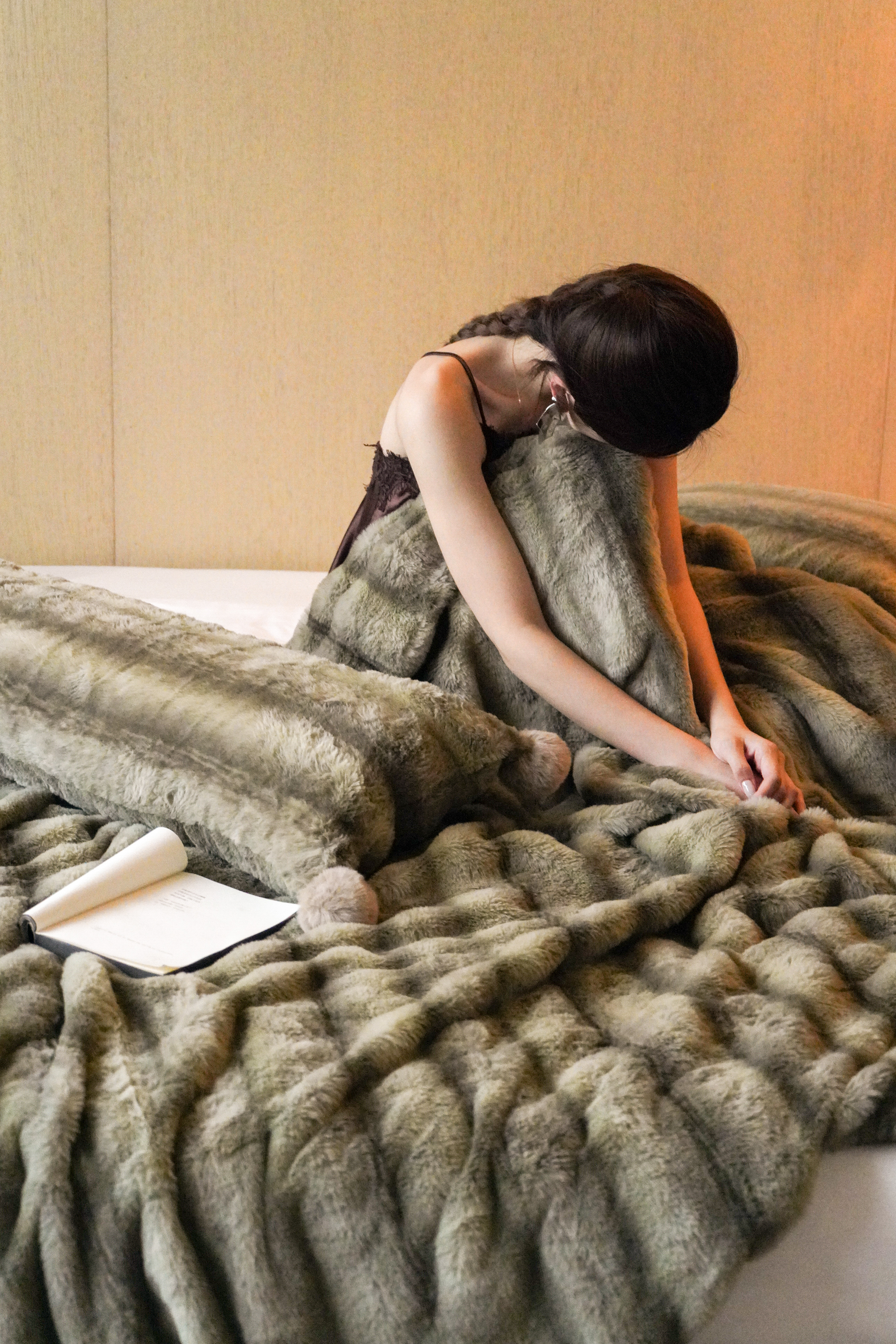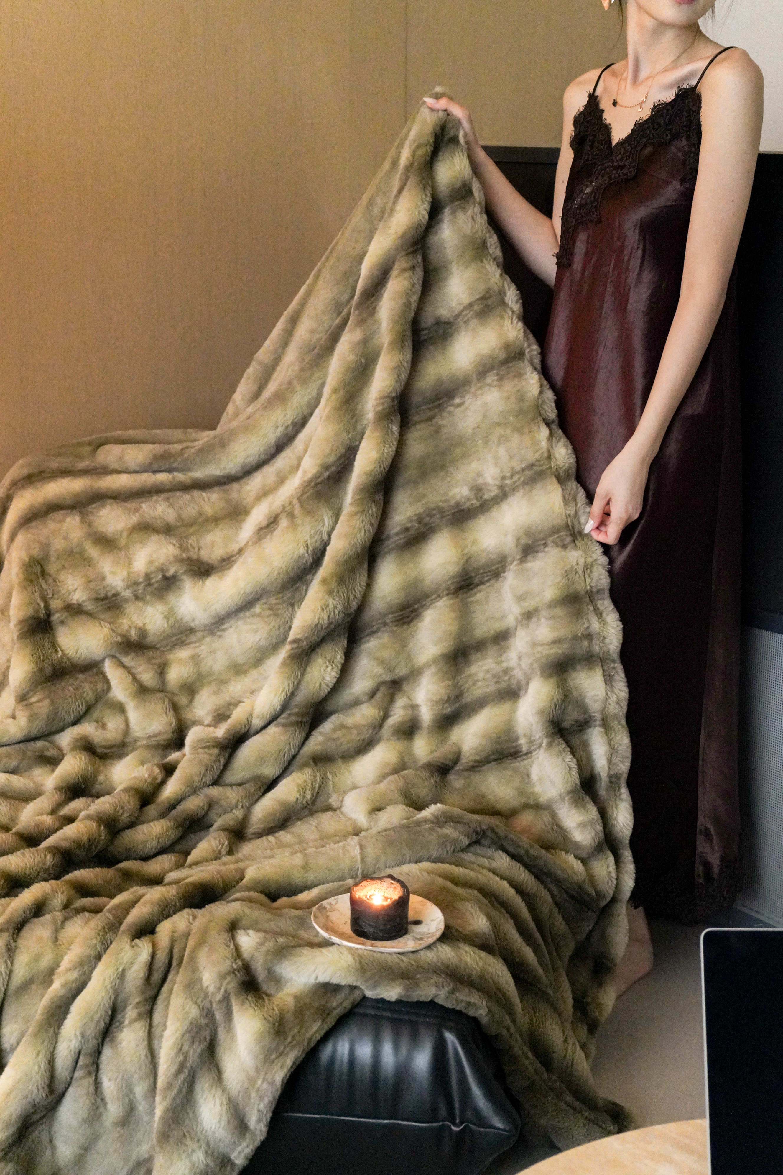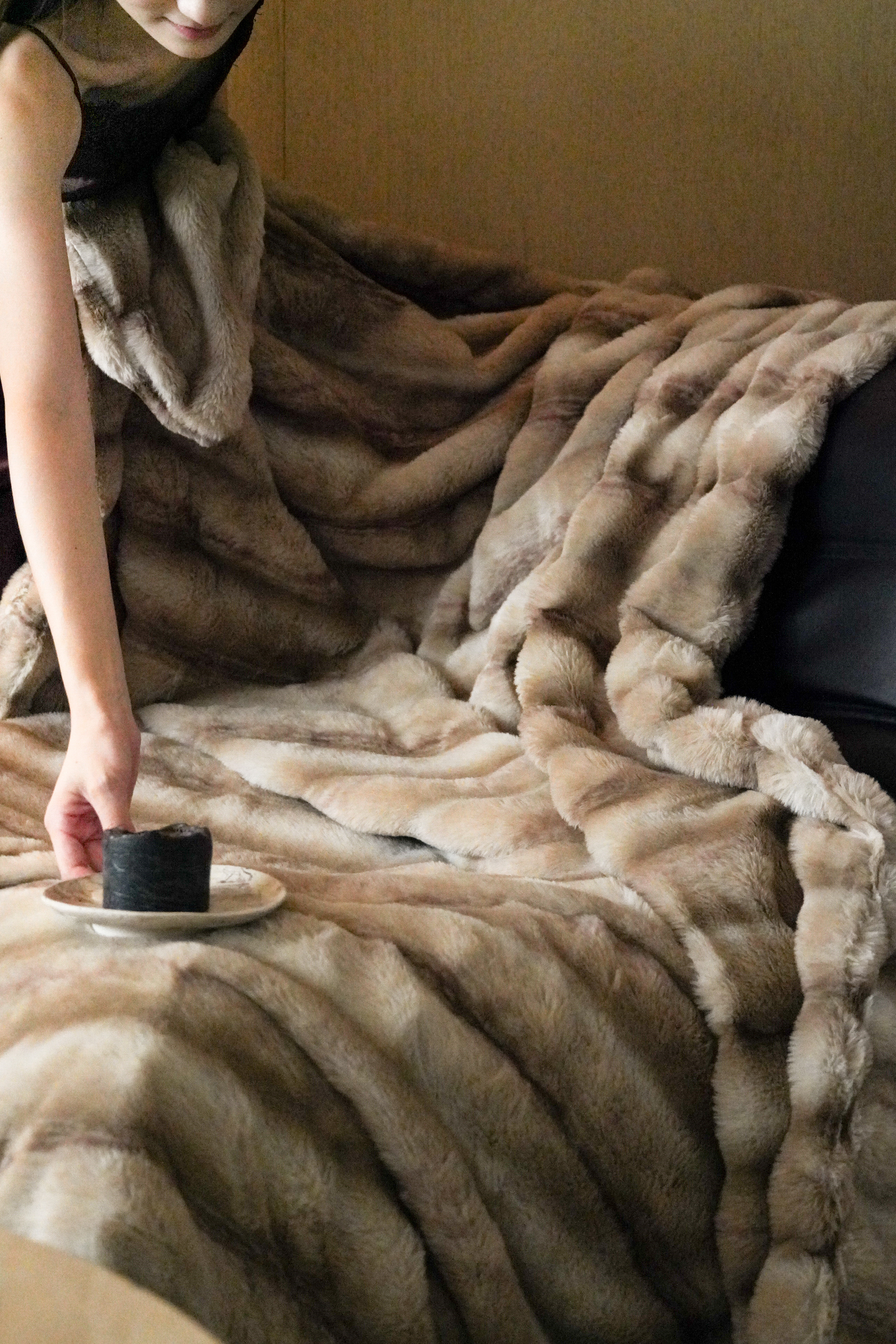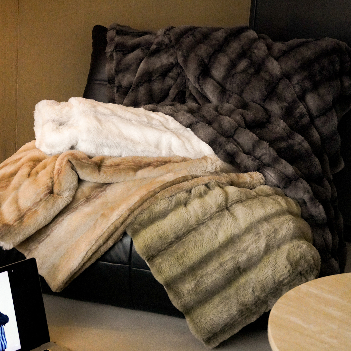以高于羊毛30%的保暖性能,柔软的大兔毛绒,冬天盖在身上,搭在腿上加倍温暖。各种场合都可以完美搭配您的家居生活。适合房间装饰,卧室盖毯,沙发盖毯,做工居家出行,四季可用。 将传统水貂喷条运用到温暖厚实的毛绒上,视觉颜色过渡自然,呈现vintage休闲轻奢范。加上经典直条剖割工艺,风格更加灵动自然,柔软的沉浸享受。