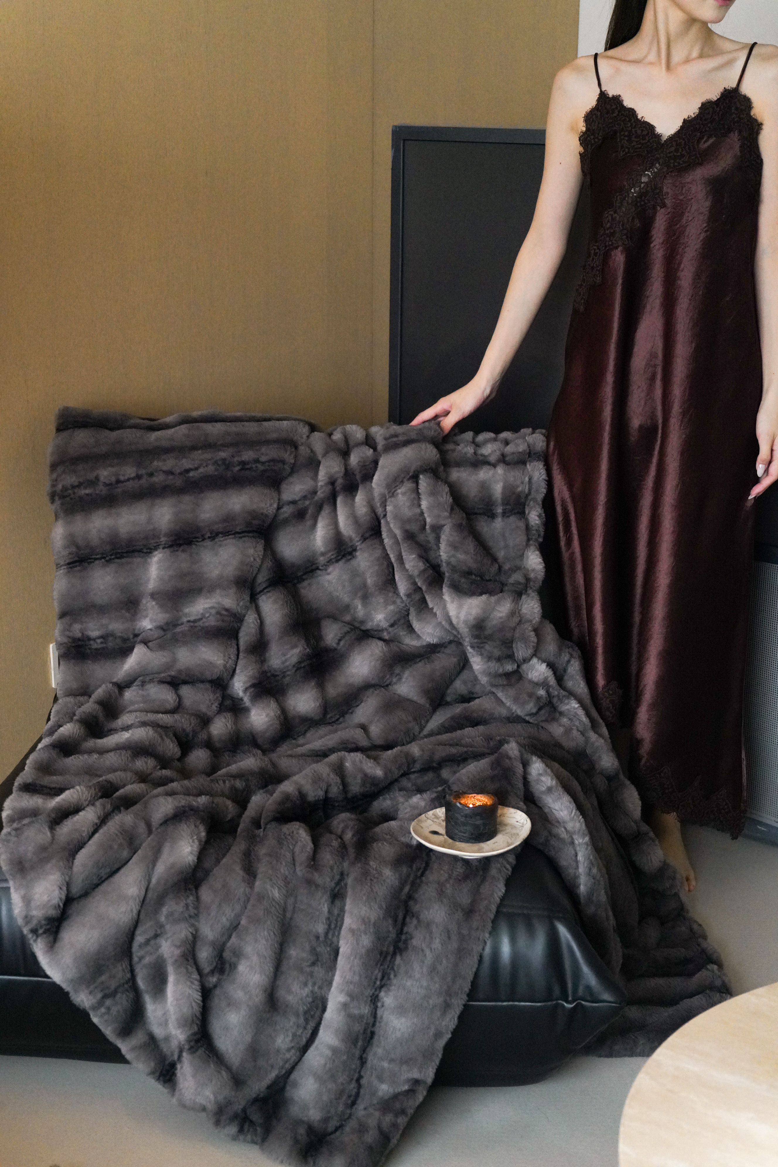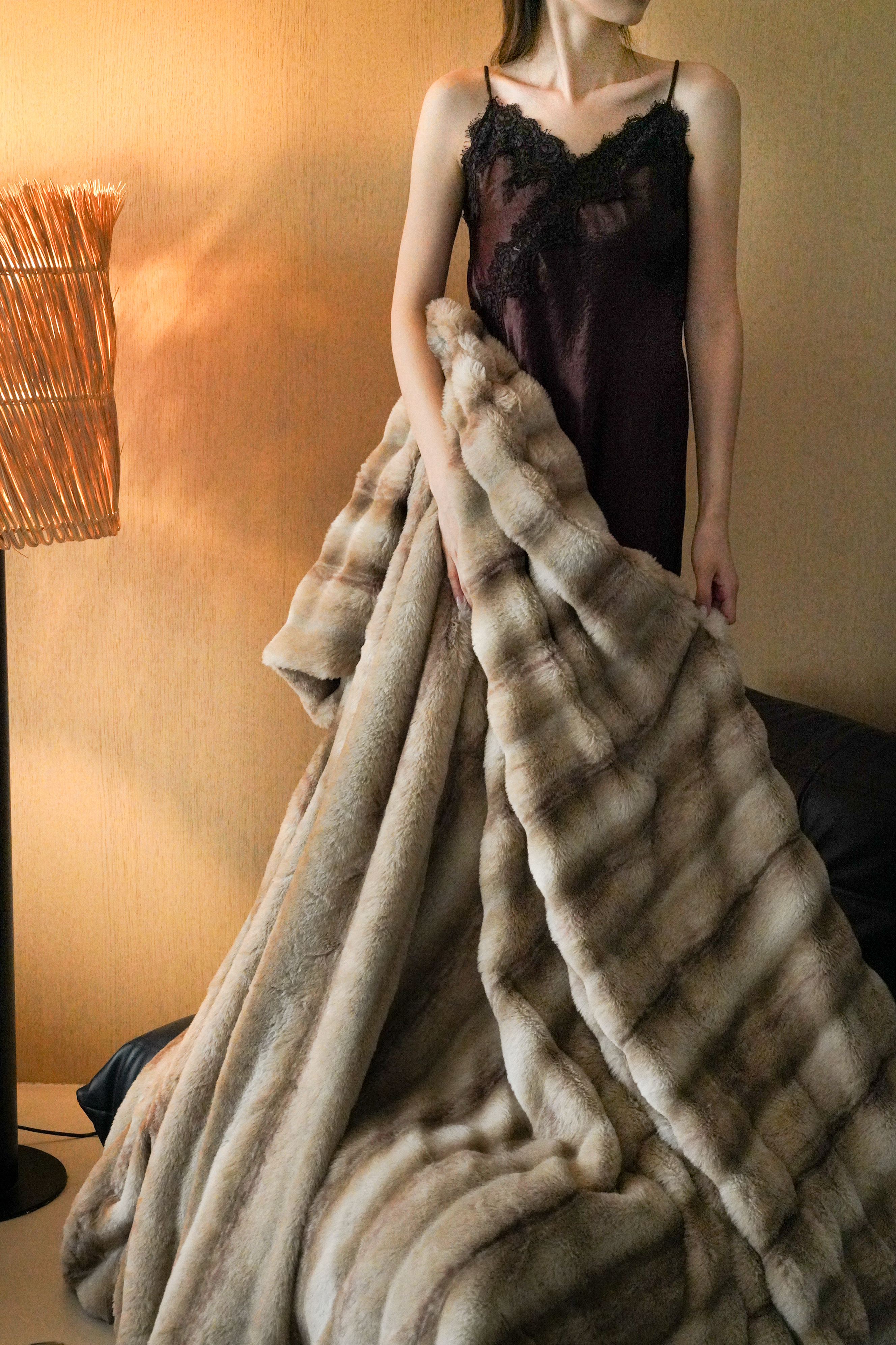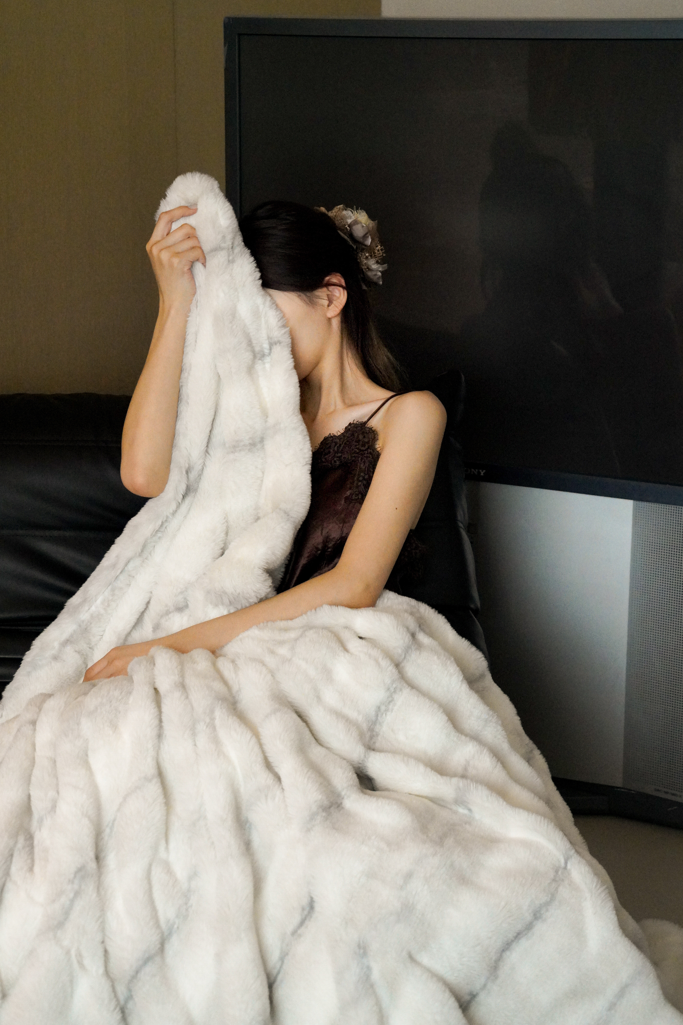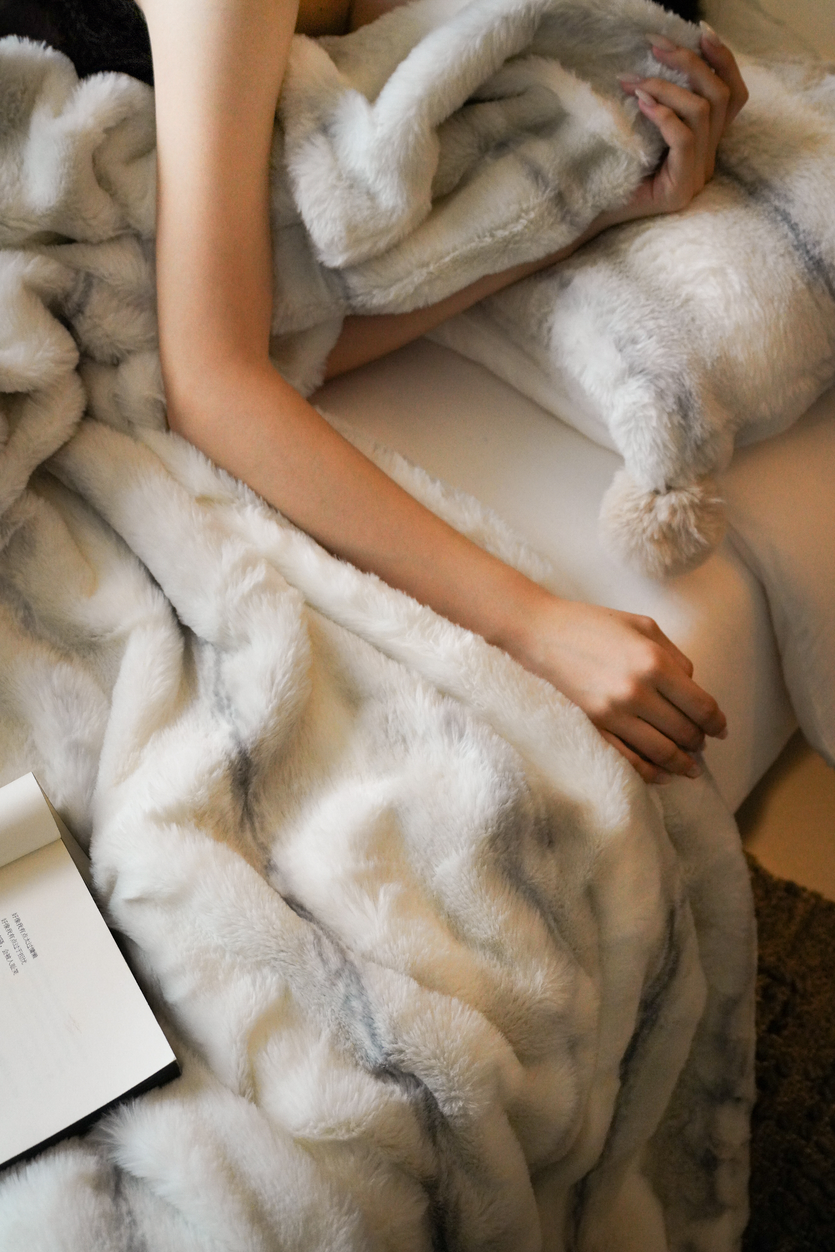 以高于羊毛30%的保暖性能,柔软的大兔毛绒,冬天盖在身上,搭在腿上加倍温暖。各种场合都可以完美搭配您的家居生活。适合房间装饰,卧室盖毯,沙发盖毯,做工居家出行,四季可用。 将传统水貂喷条运用到温暖厚实的毛绒上,视觉颜色过渡自然,呈现vintage休闲轻奢范。加上经典直条剖割工艺,风格更加灵动自然,柔软的沉浸享受。
