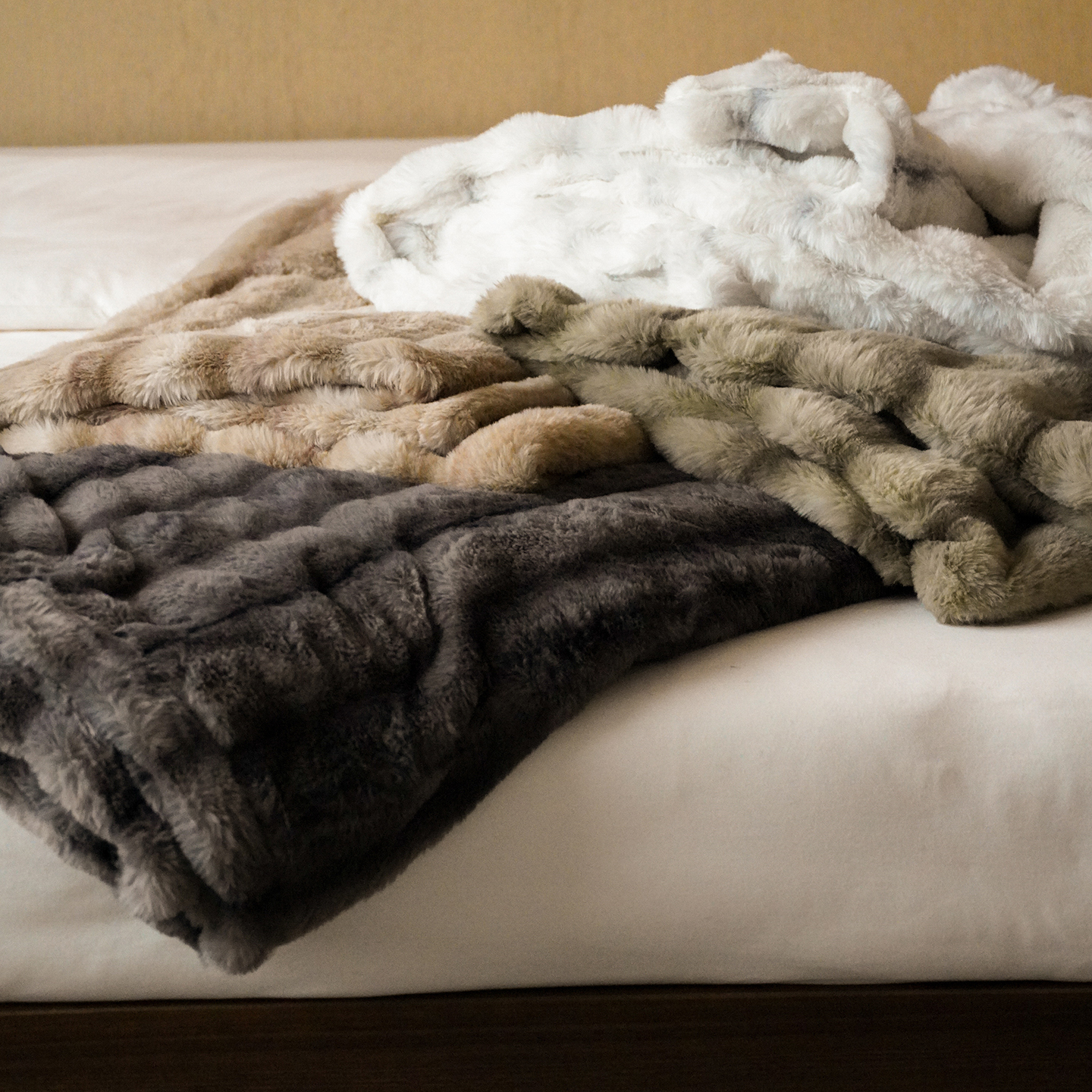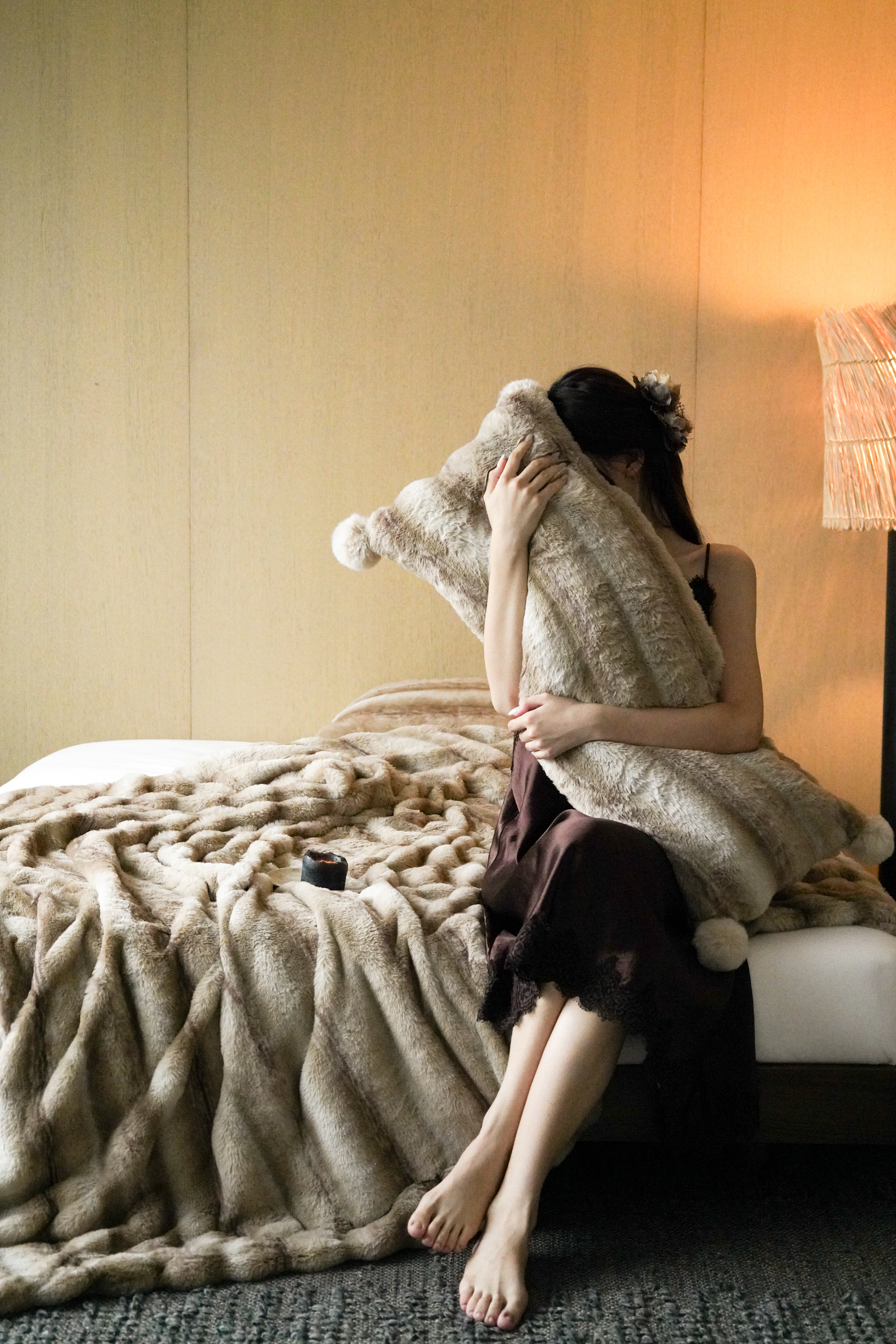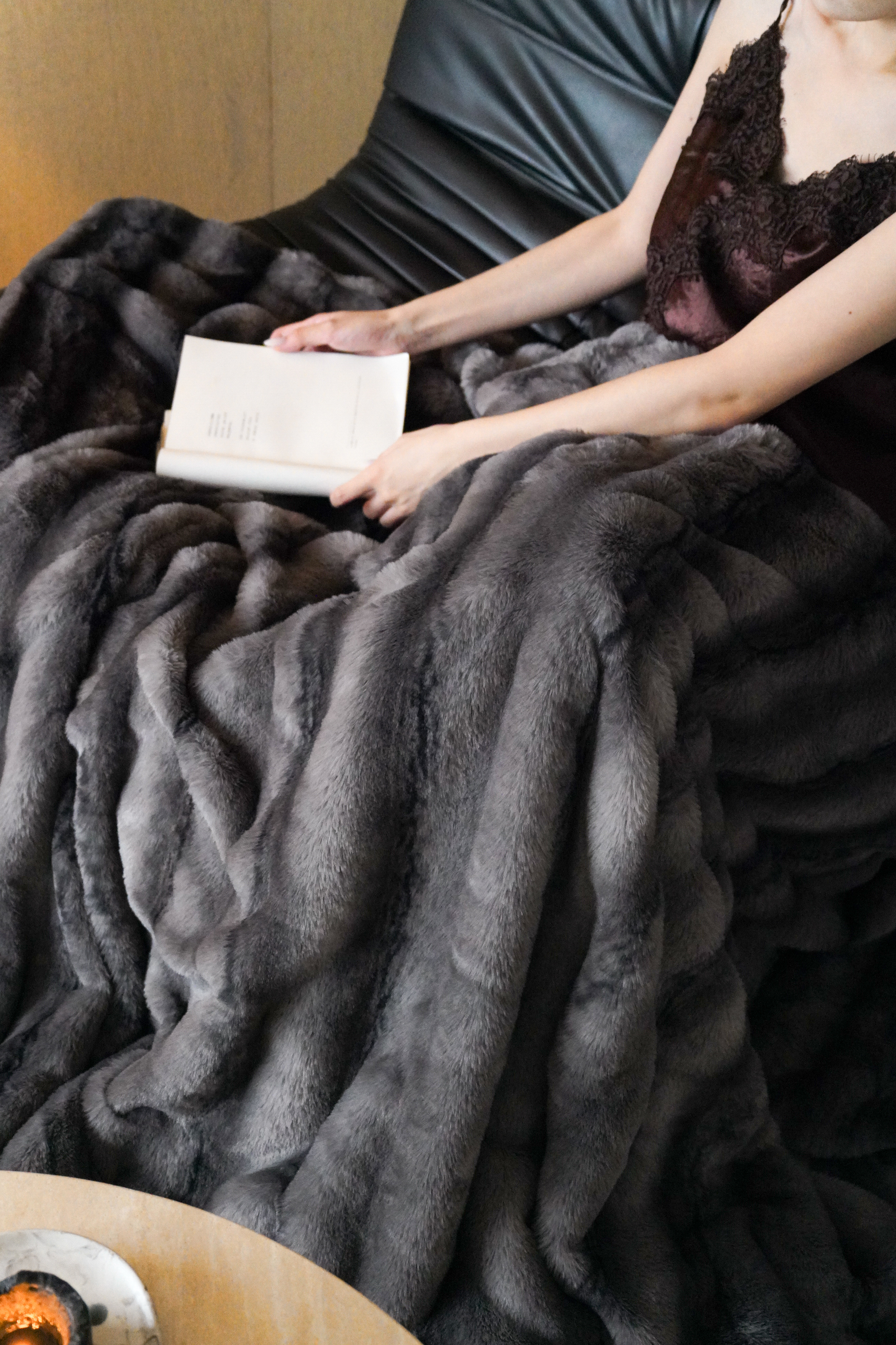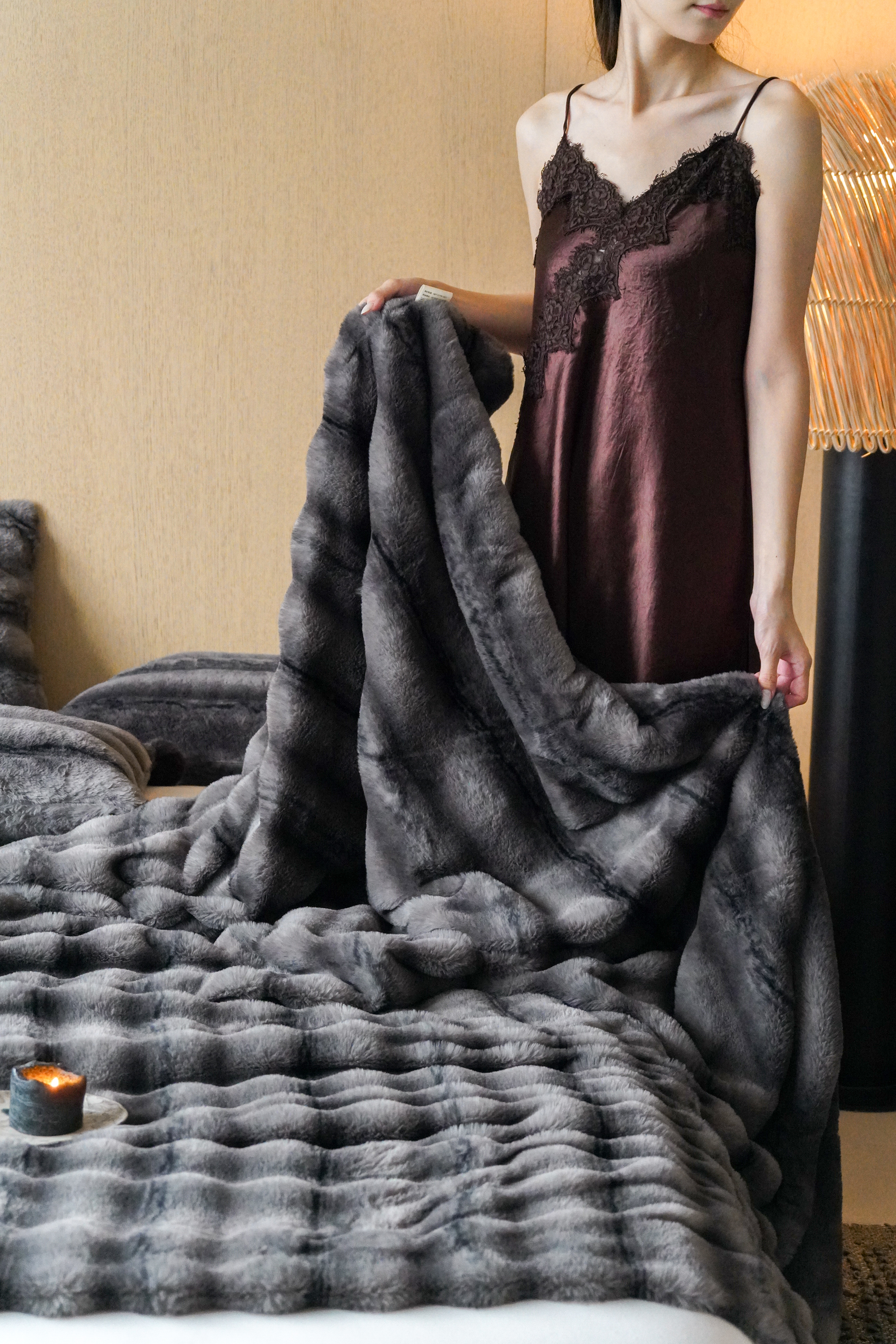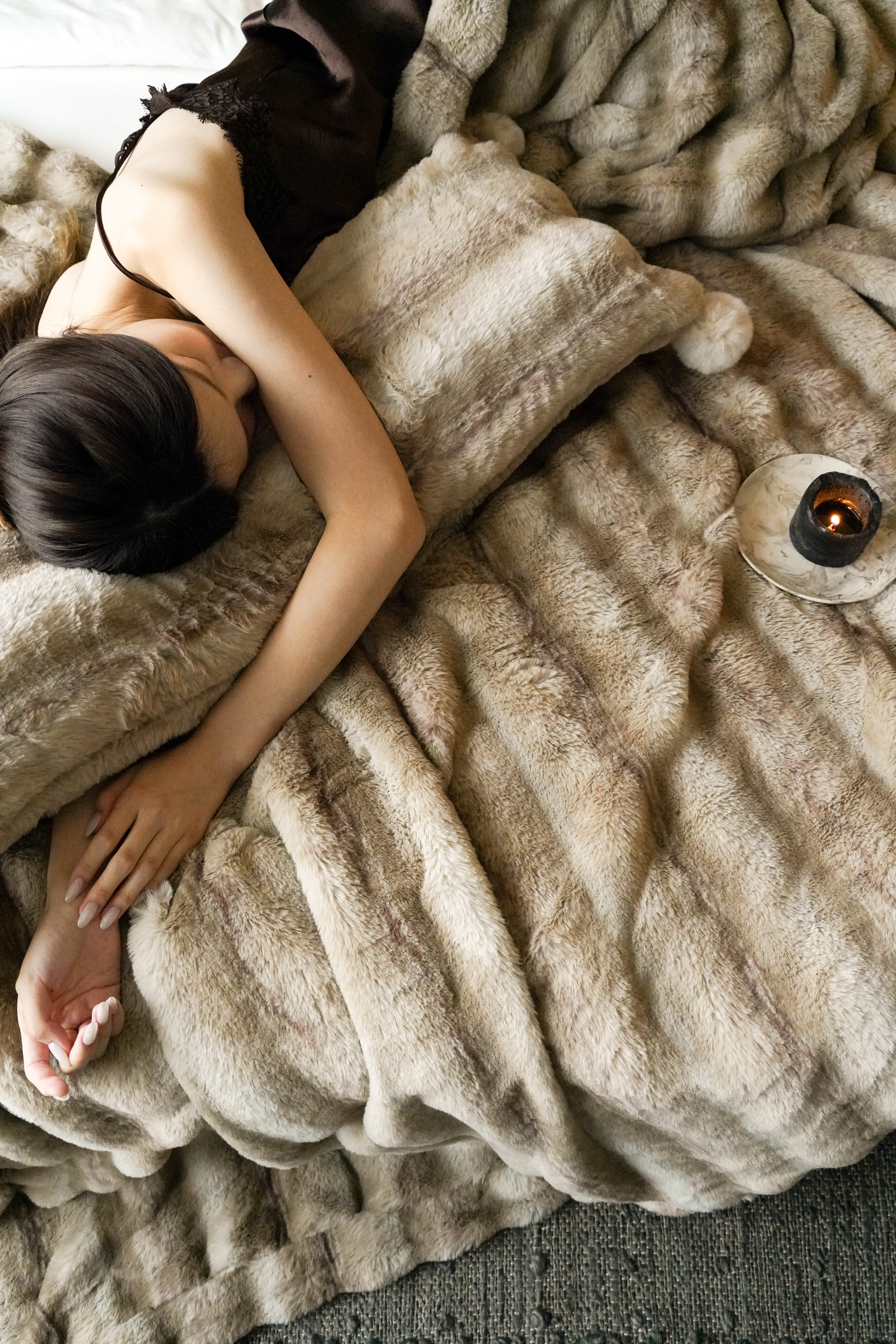 以高于羊毛30%的保暖性能,柔软的大兔毛绒,冬天盖在身上,搭在腿上加倍温暖。各种场合都可以完美搭配您的家居生活。适合房间装饰,卧室盖毯,沙发盖毯,做工居家出行,四季可用。 将传统水貂喷条运用到温暖厚实的毛绒上,视觉颜色过渡自然,呈现vintage休闲轻奢范。加上经典直条剖割工艺,风格更加灵动自然,柔软的沉浸享受。