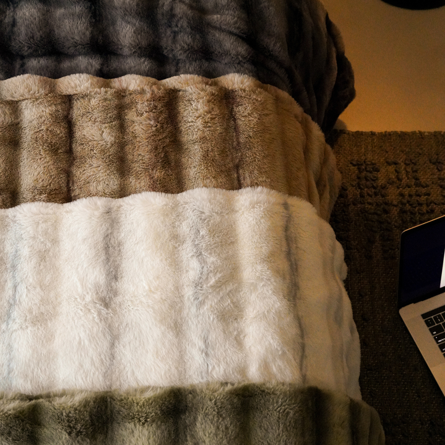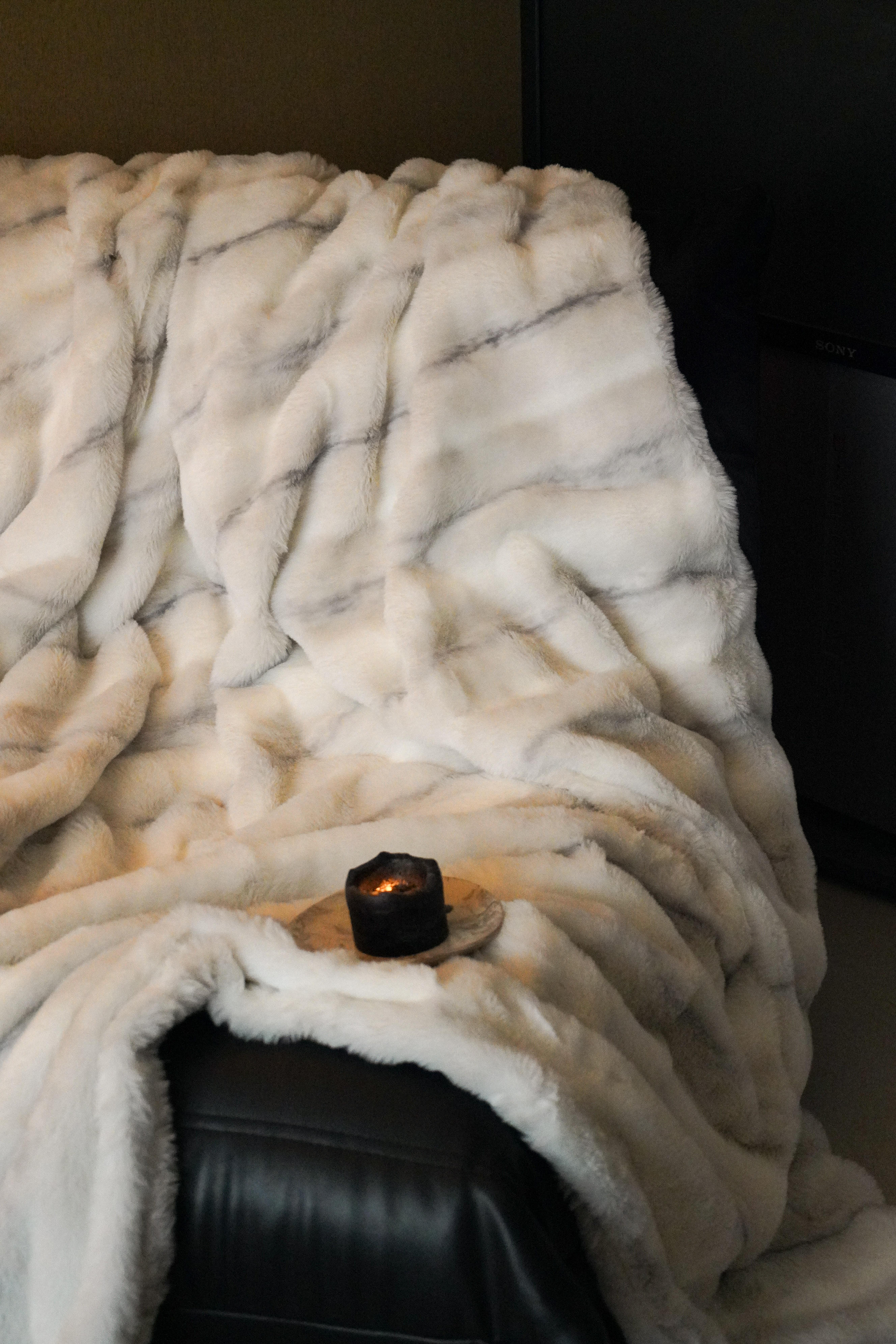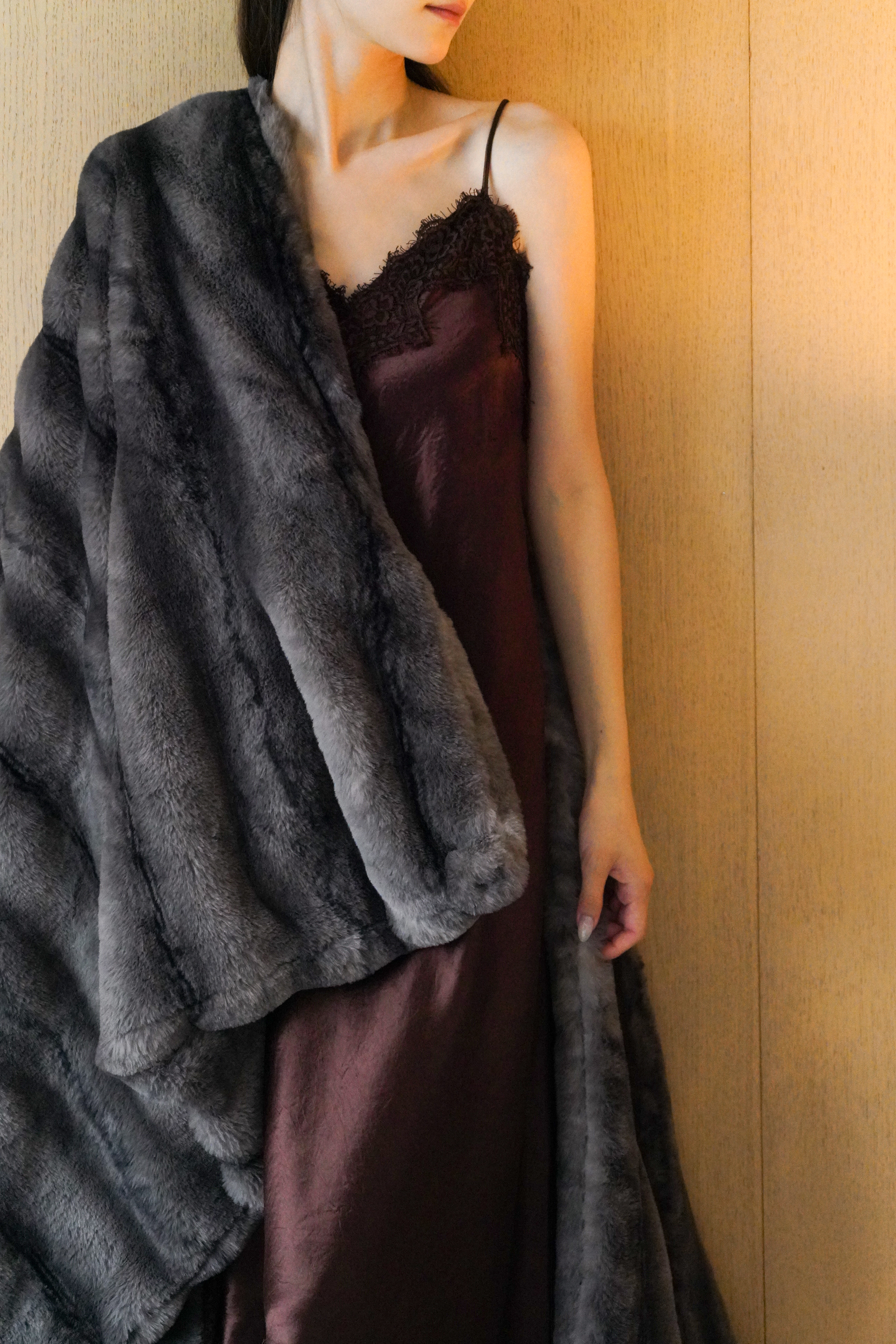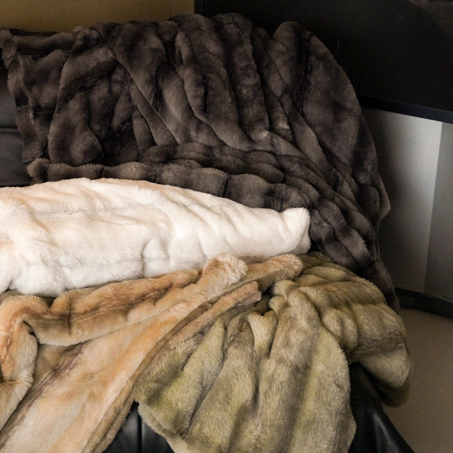 以高于羊毛30%的保暖性能,柔软的大兔毛绒,冬天盖在身上,搭在腿上加倍温暖。各种场合都可以完美搭配您的家居生活。适合房间装饰,卧室盖毯,沙发盖毯,做工居家出行,四季可用。 将传统水貂喷条运用到温暖厚实的毛绒上,视觉颜色过渡自然,呈现vintage休闲轻奢范。加上经典直条剖割工艺,风格更加灵动自然,柔软的沉浸享受。