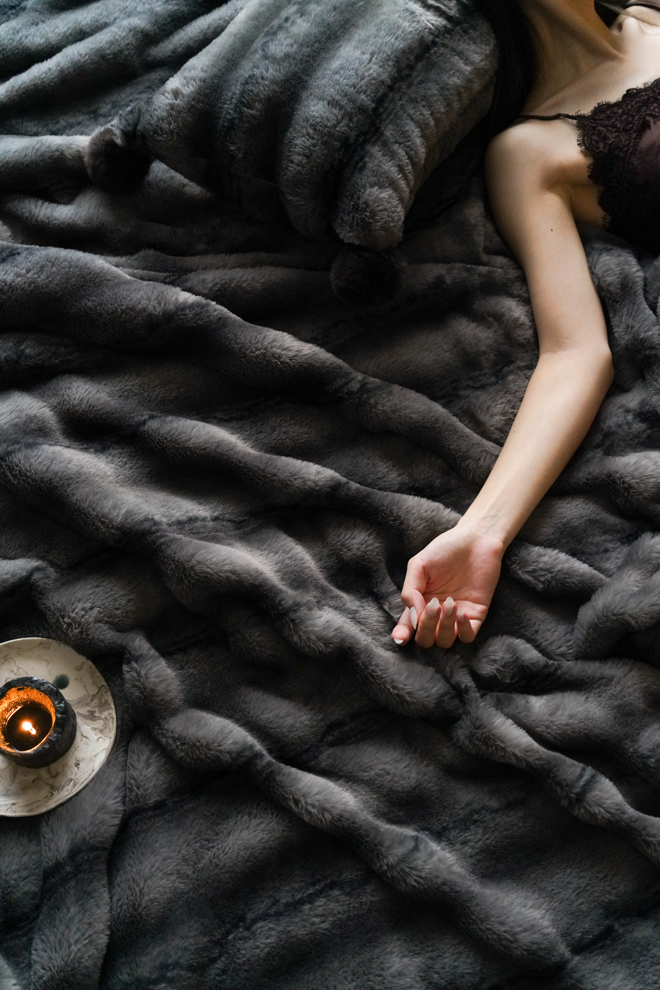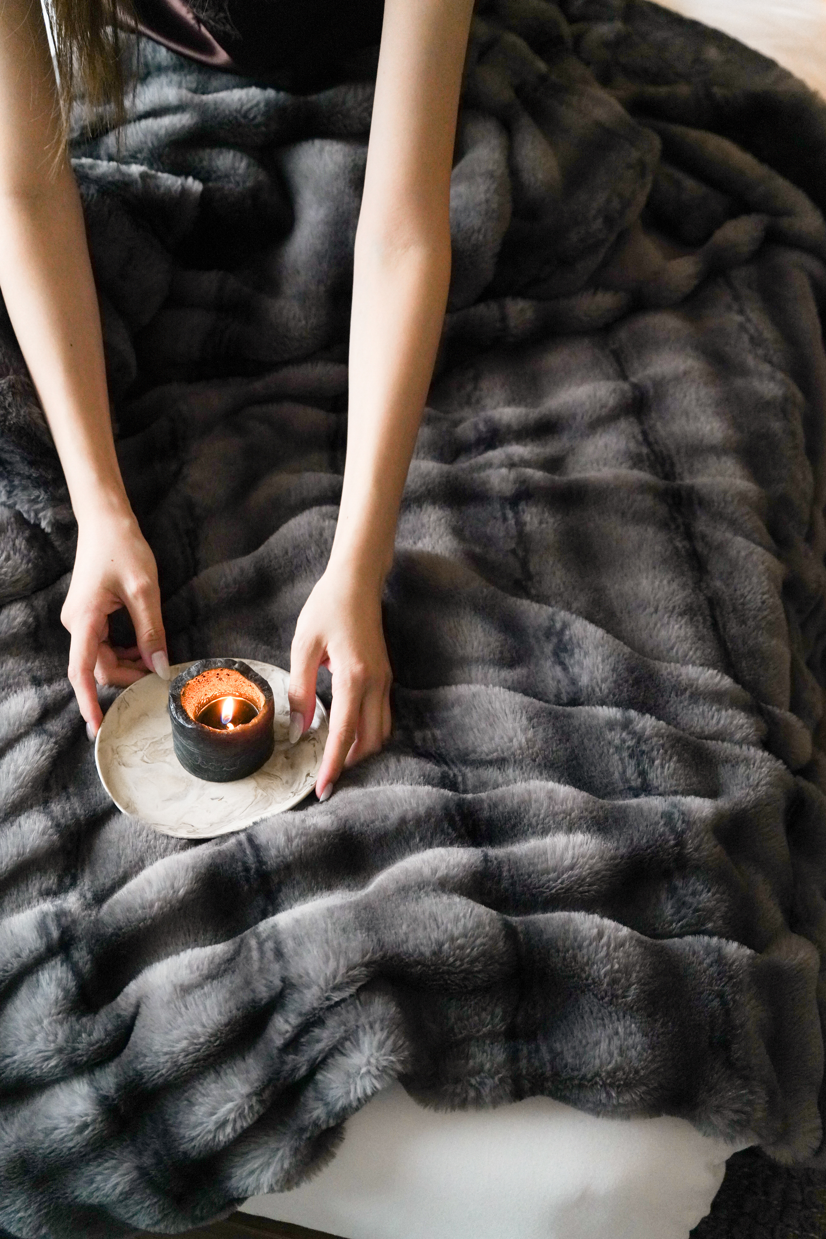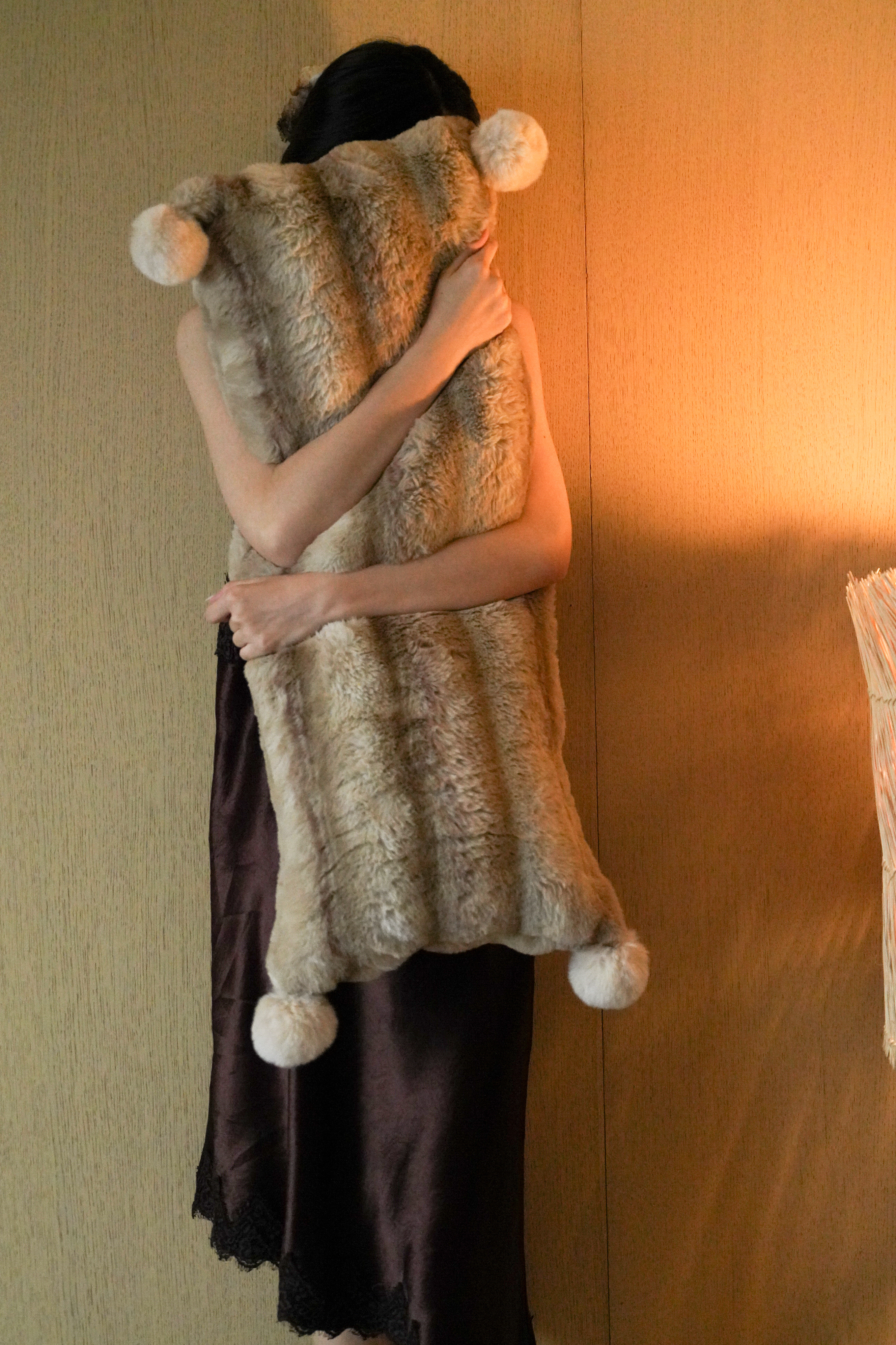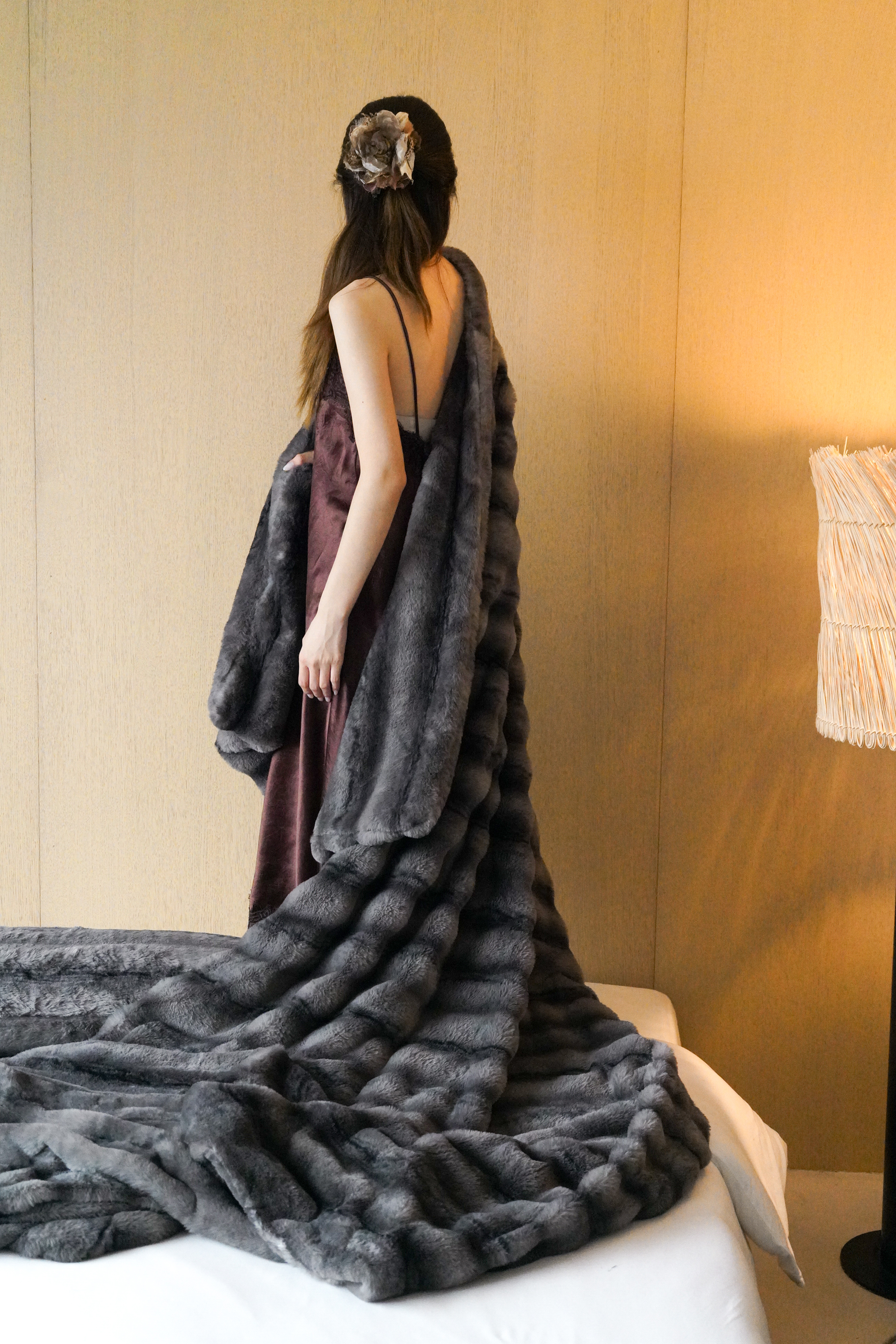 以高于羊毛30%的保暖性能,柔软的大兔毛绒,冬天盖在身上,搭在腿上加倍温暖。各种场合都可以完美搭配您的家居生活。适合房间装饰,卧室盖毯,沙发盖毯,做工居家出行,四季可用。 将传统水貂喷条运用到温暖厚实的毛绒上,视觉颜色过渡自然,呈现vintage休闲轻奢范。加上经典直条剖割工艺,风格更加灵动自然,柔软的沉浸享受。