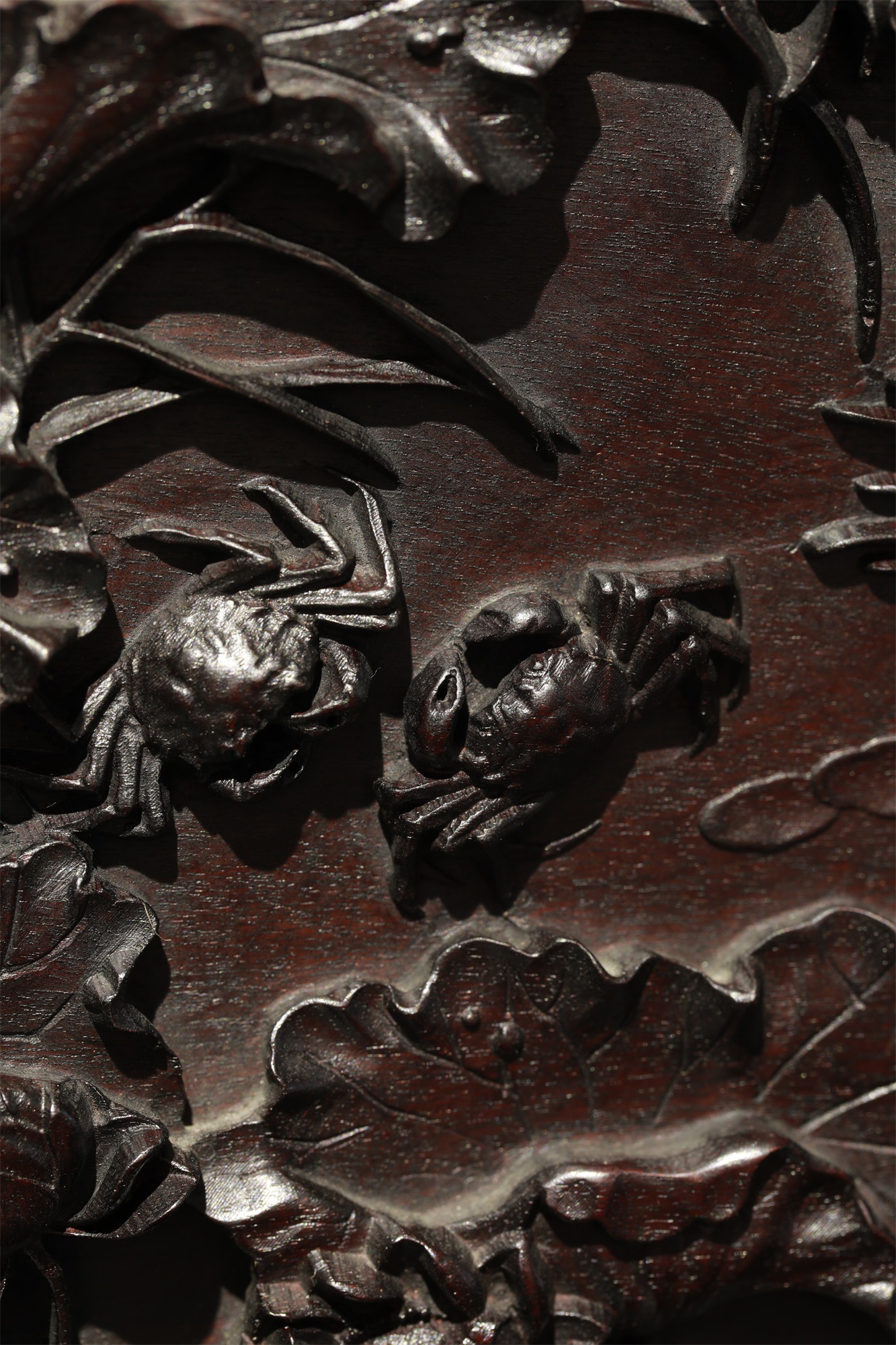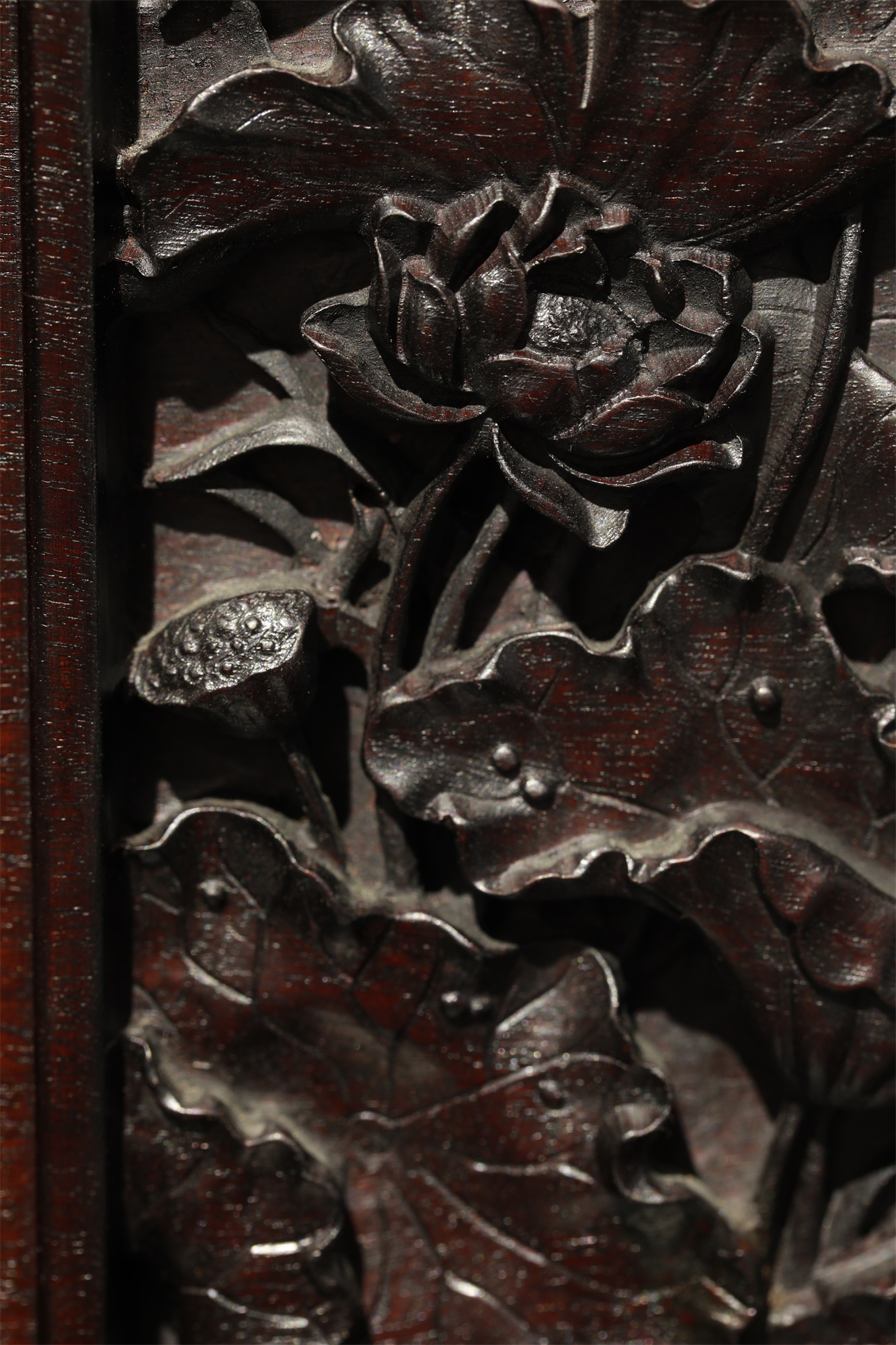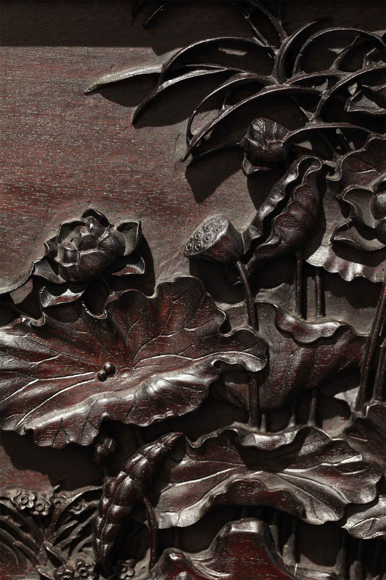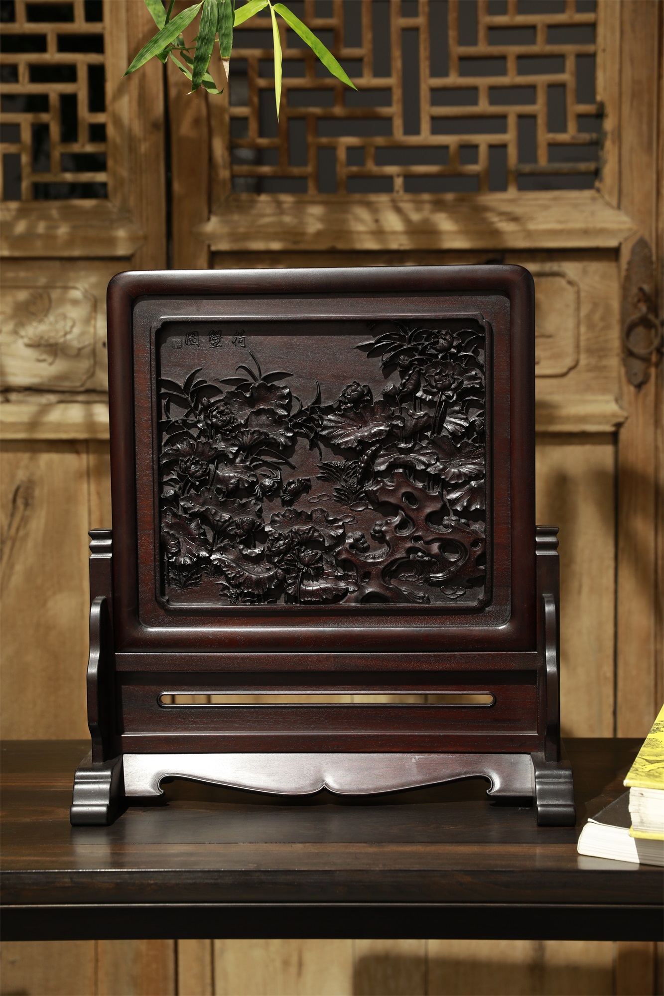 作品采用徽州传统手工艺雕刻而成。方寸间荷花枝干灵动,穿插有致,花与叶的层次、位置、穿插、向背,繁而不乱,显示出高妙的匠意。踞于荷叶间的小螃蟹成为构图的点睛之笔,刻划自然生动细腻,增添了画面的趣味。荷花、螃蟹均为中国传统的吉祥图案。“荷”“和”谐音,赋予荷和气、和平、祥和、和合、和好的美好寓意。也承载了文人墨客的生活情趣和人文情怀。